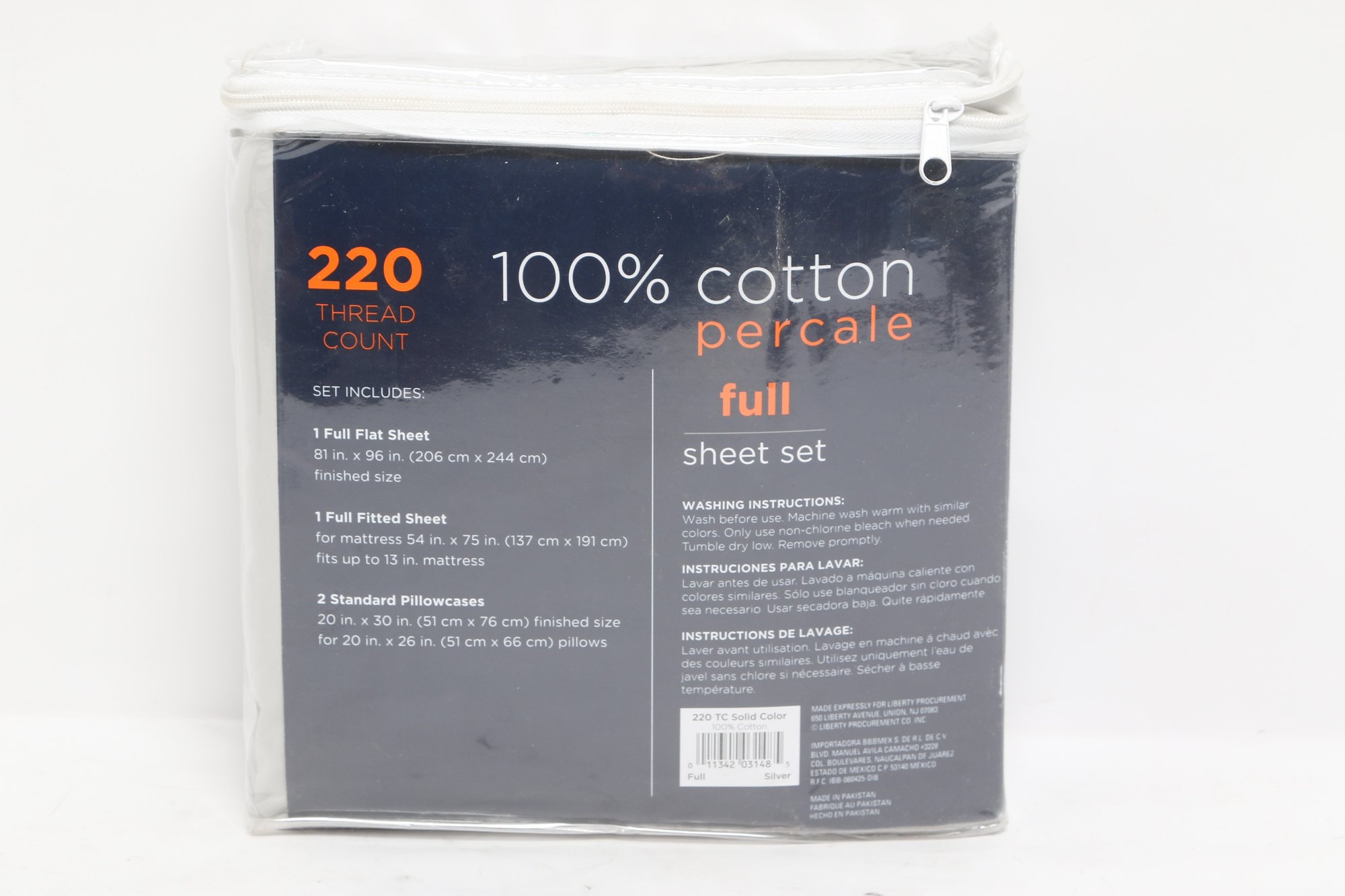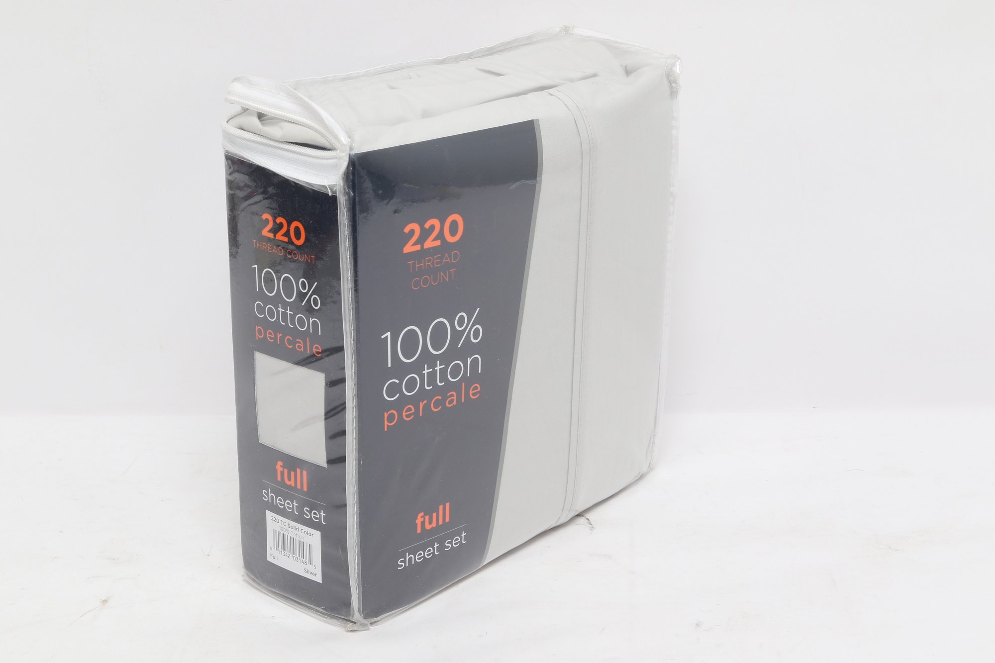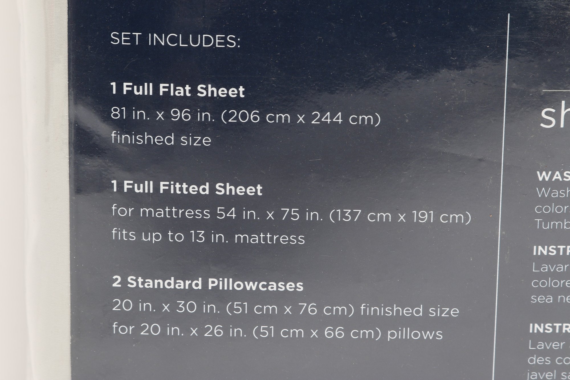 Full size sheet set in white, 220 thread count 100% cotton percale. Includes flat sheet, fitted sheet, and two standard pillowcases. New in package with minor outer packaging wear.