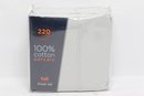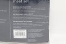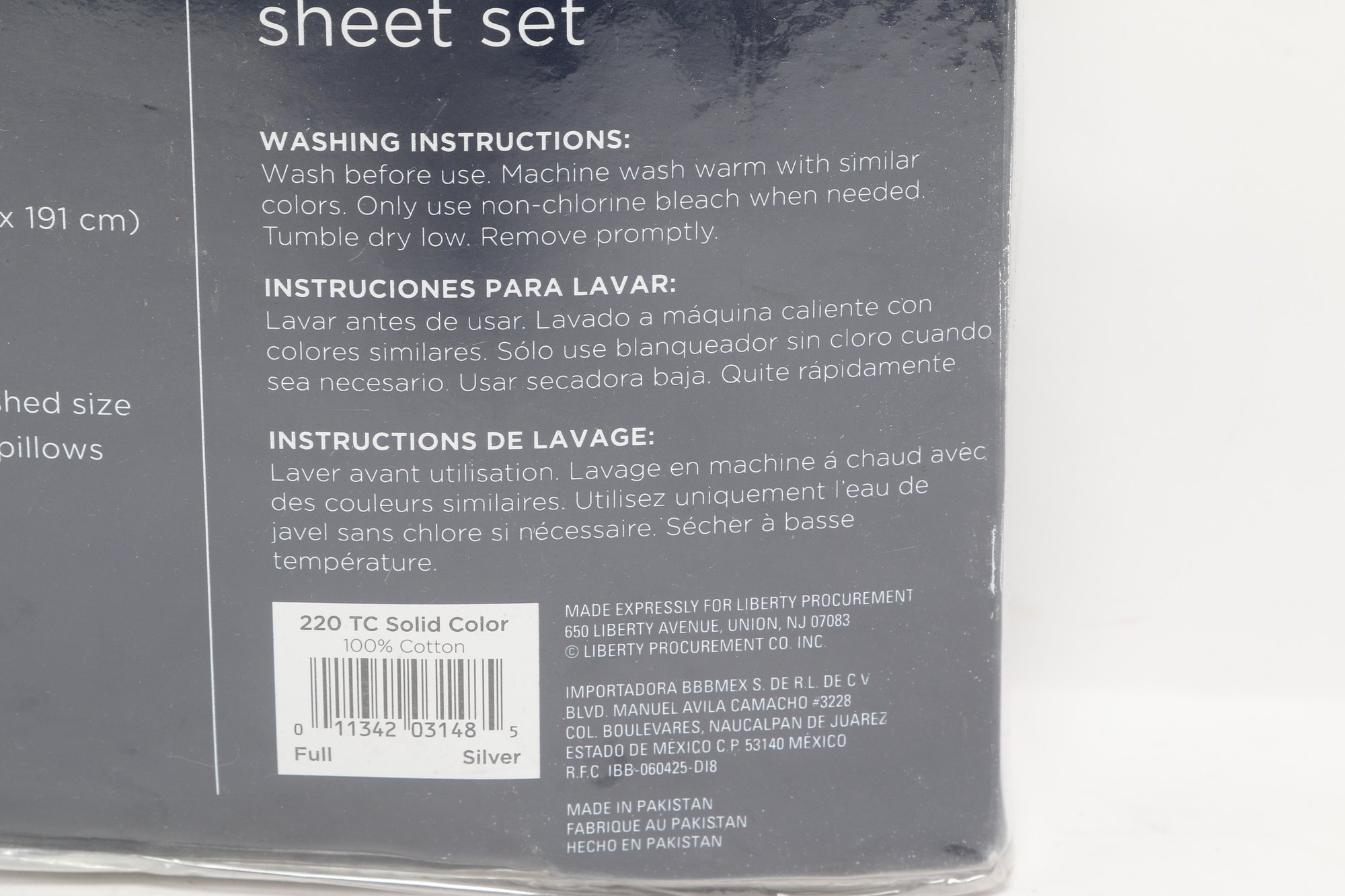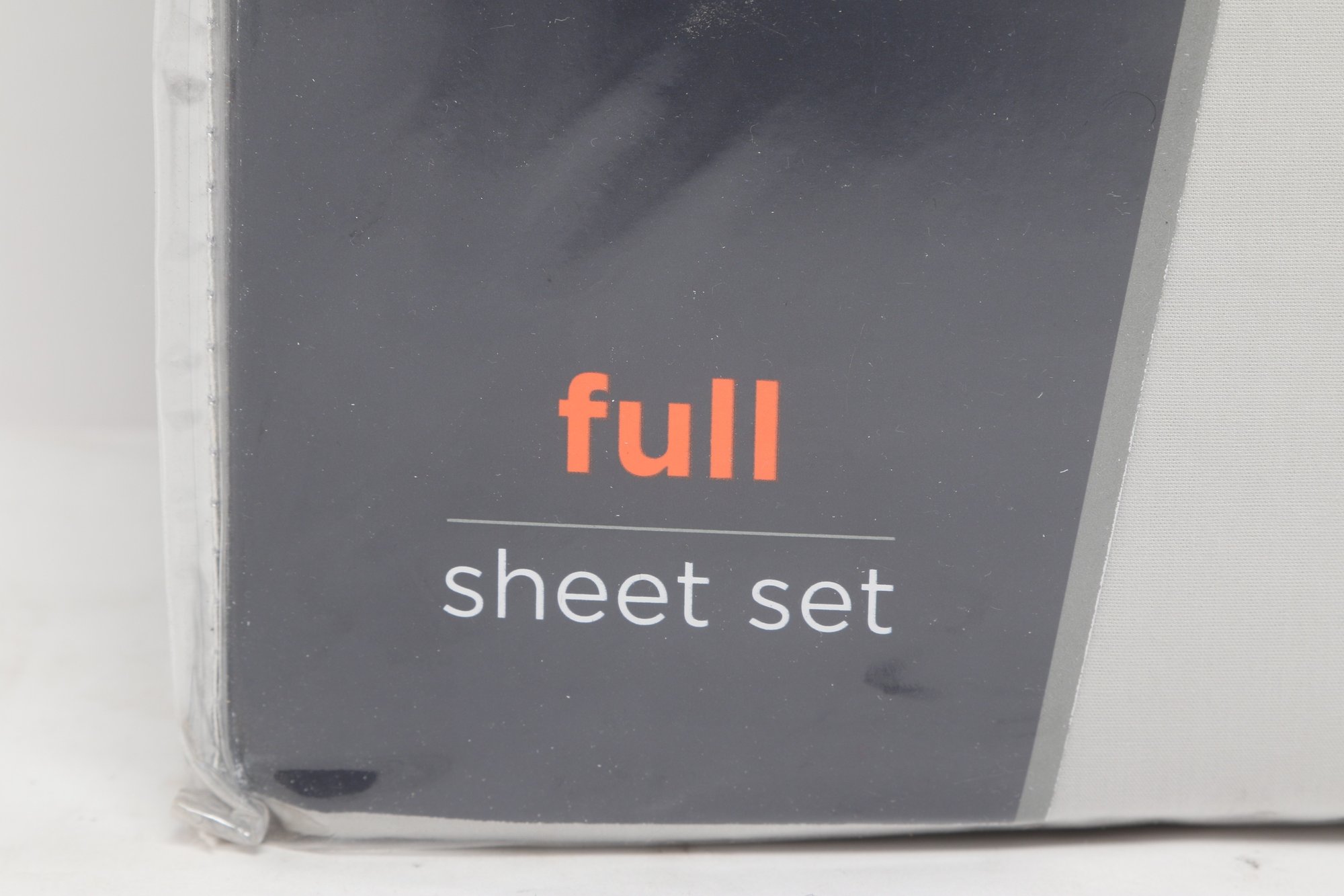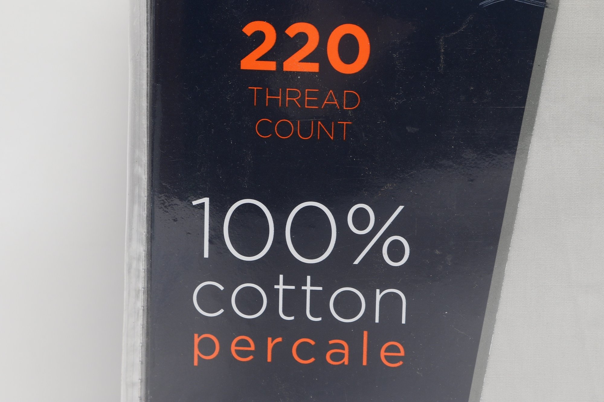 Full size sheet set in white, 220 thread count 100% cotton percale. Includes flat sheet, fitted sheet, and two standard pillowcases. New in package with minor outer packaging wear.