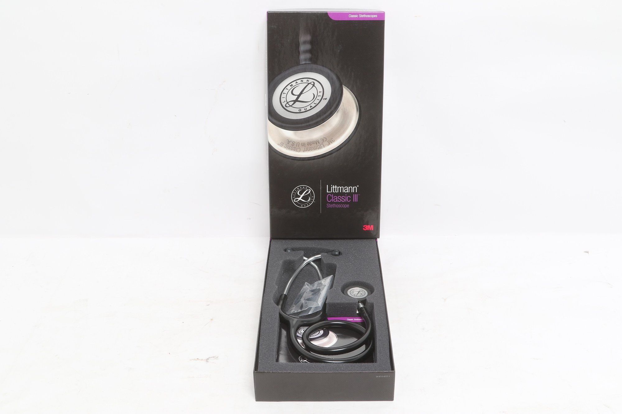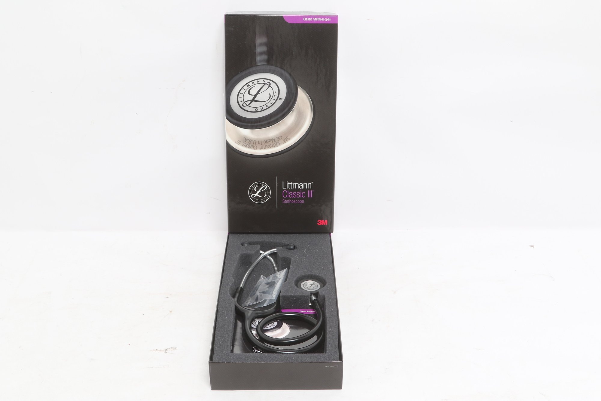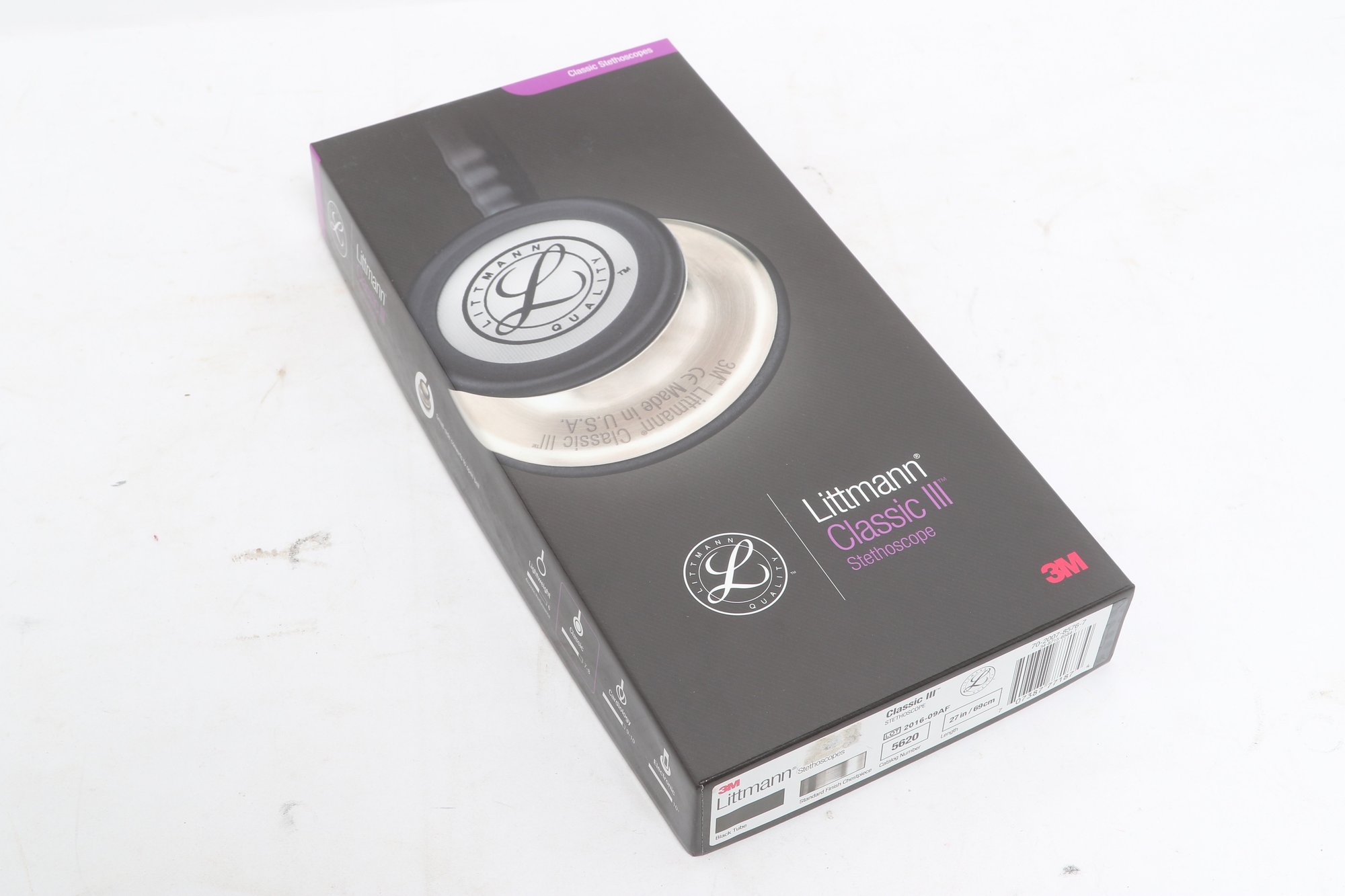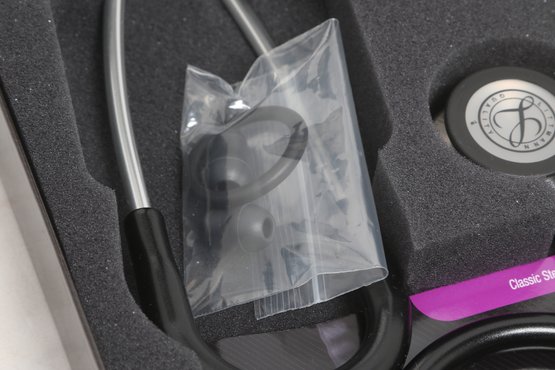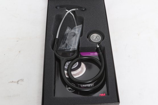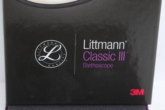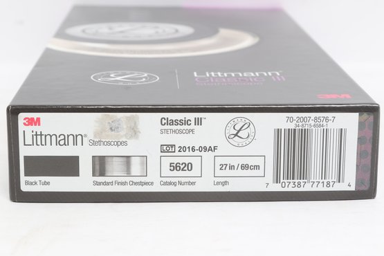 3M Littmann Classic III stethoscope in black, model 5620, measuring 27 inches in length. Features a dual-sided chestpiece with tunable diaphragms for versatile use on adult and pediatric patients. Comes in original box with packaging and appears in very good condition.
