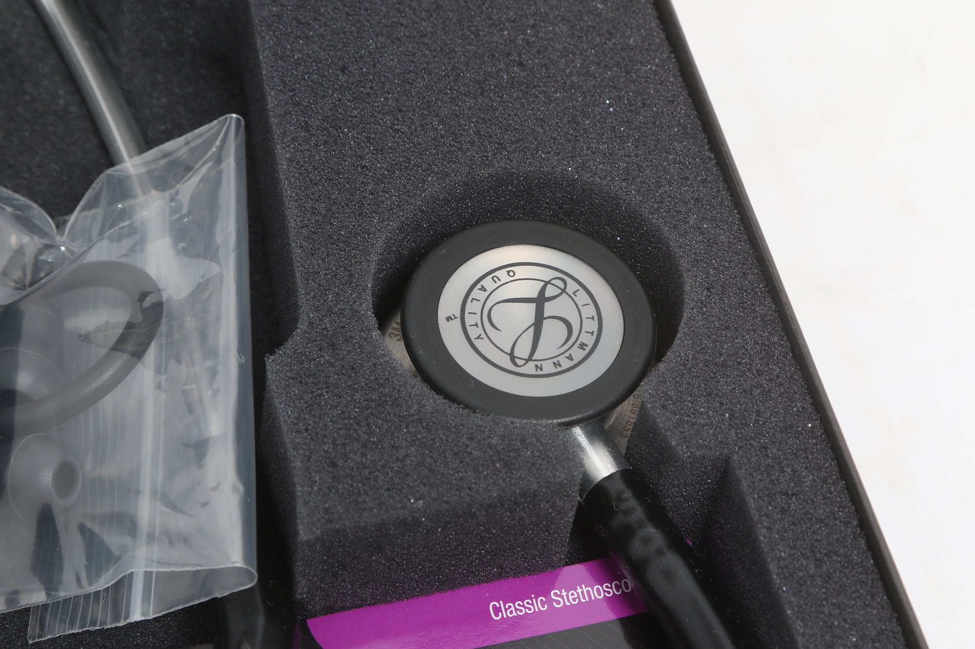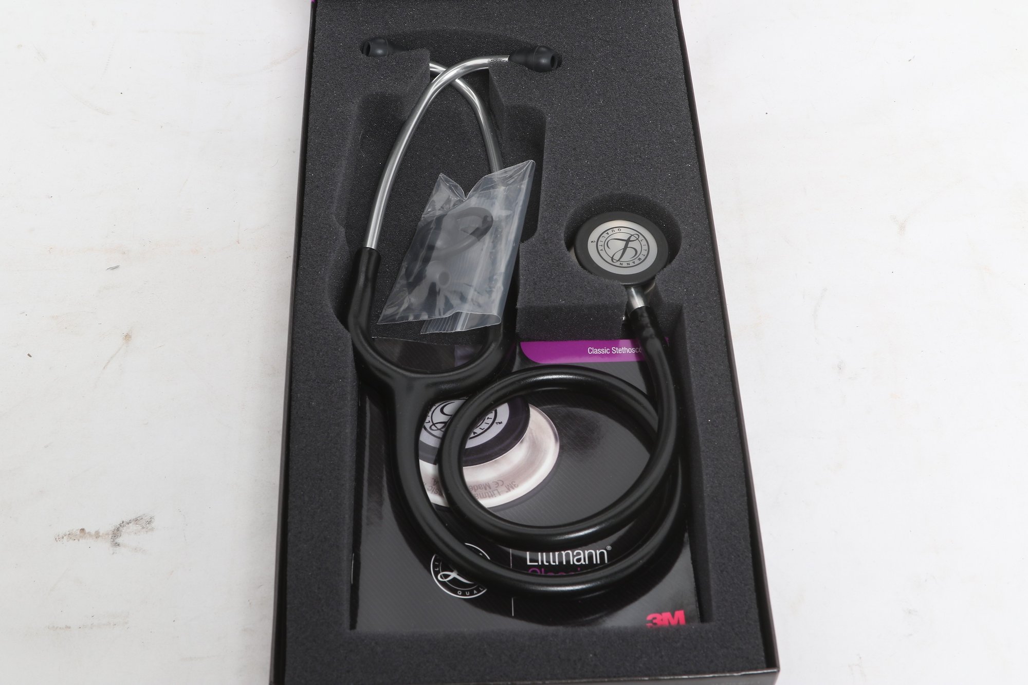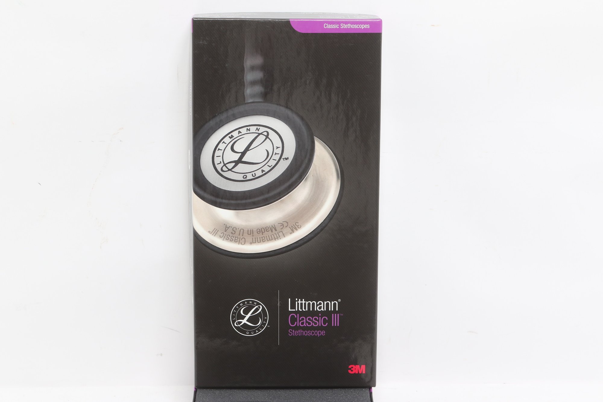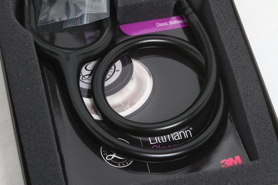3M Littmann Classic III stethoscope in black, model 5620, measuring 27 inches in length. Features a dual-sided chestpiece with tunable diaphragms for versatile use on adult and pediatric patients. Comes in original box with packaging and appears in very good condition.