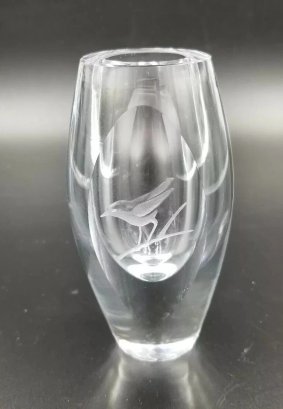 Beautiful vase with an engraved bird perched on a branch of a tree. Hand signed. Excellent condition with no chips, cracks or damage to report. A couple of expected scratches on the bottom of the base from movement.