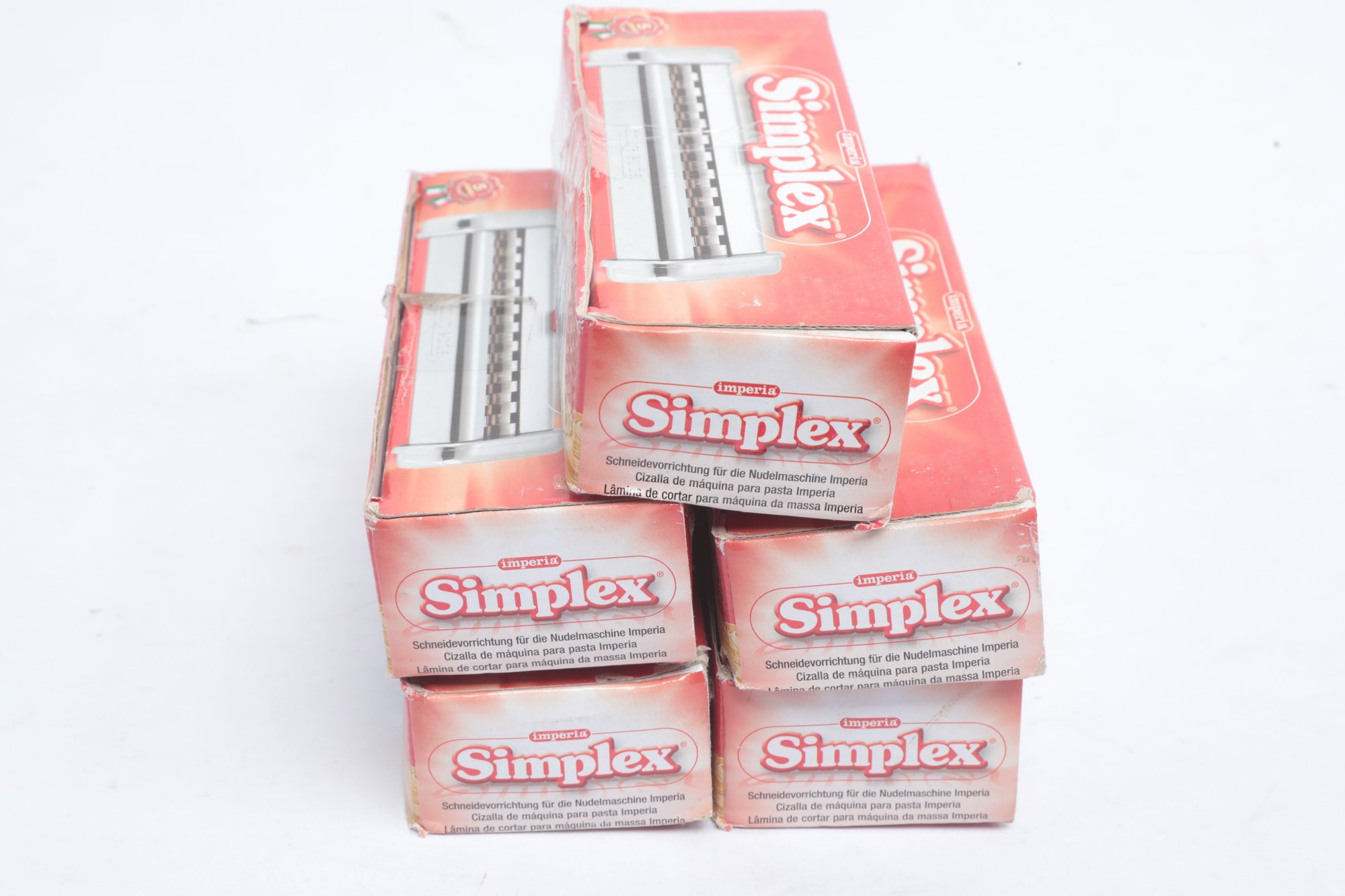 5pc Imperia Angel Hair Pasta Attachment Made In Italy Simplex X.150 Taglio 5 in original boxes. Appear unused, boxes have wear and cosmetic damage. See pictures carefully for details.