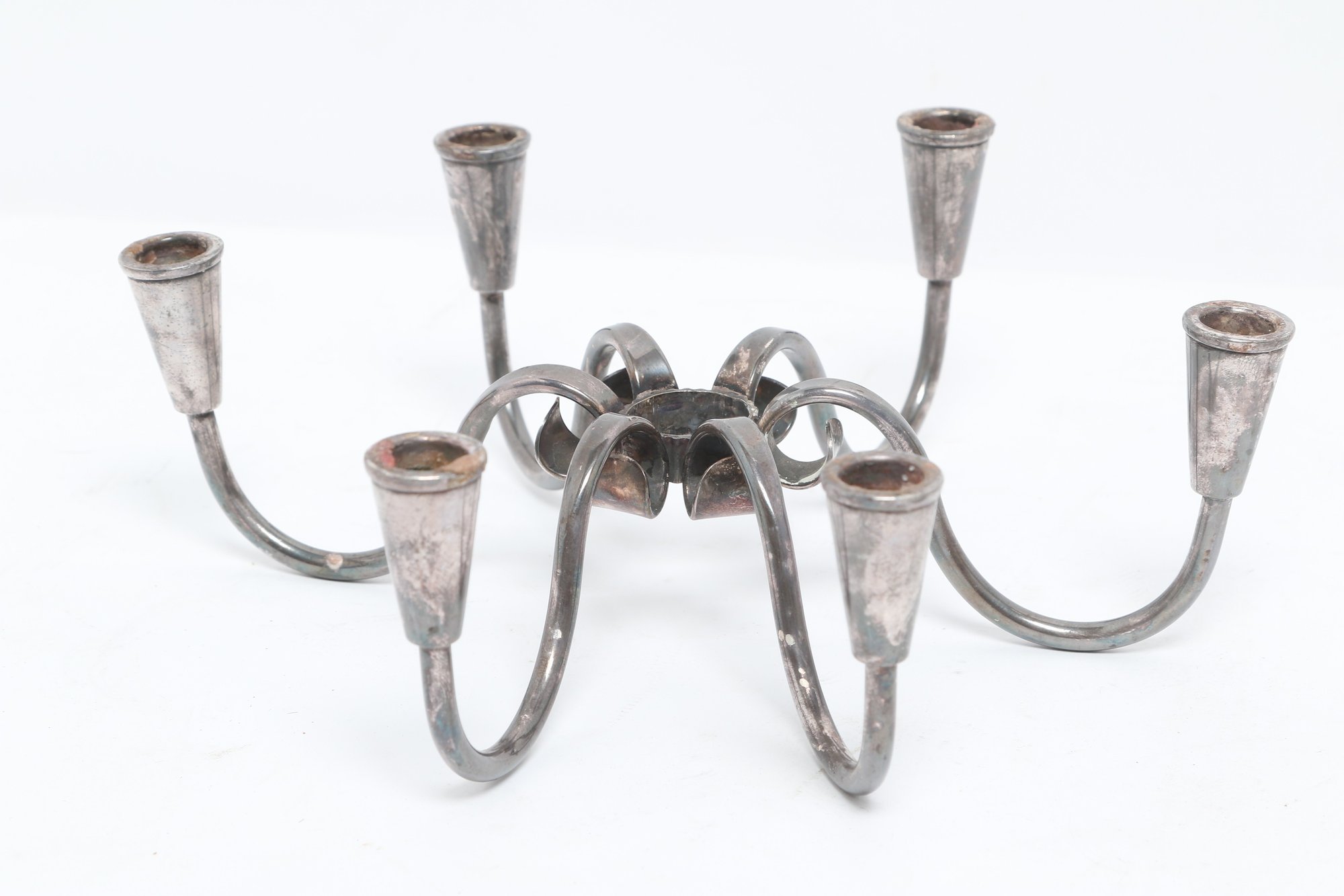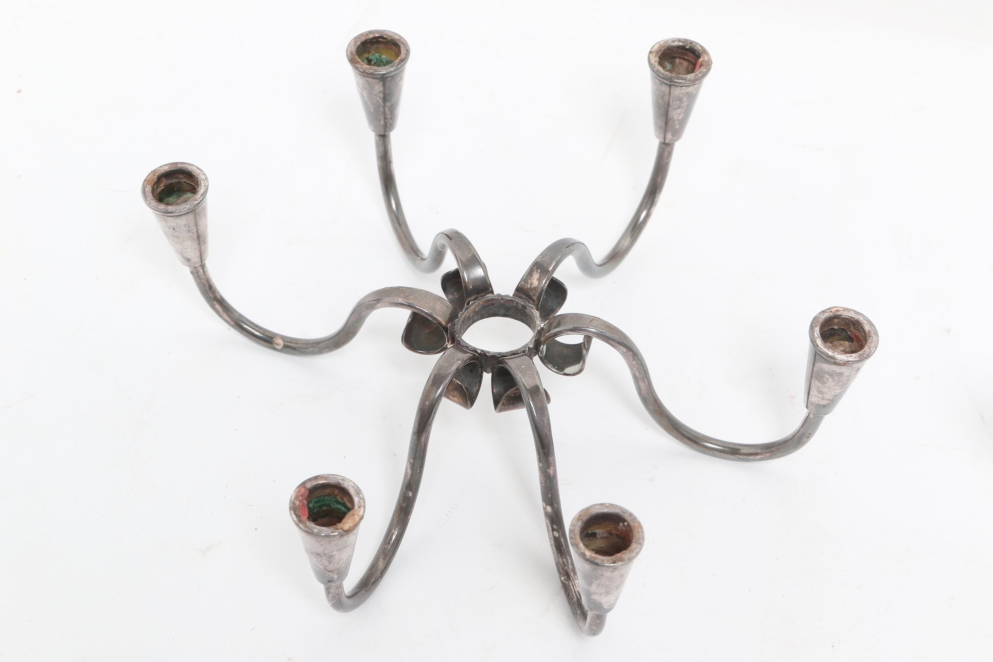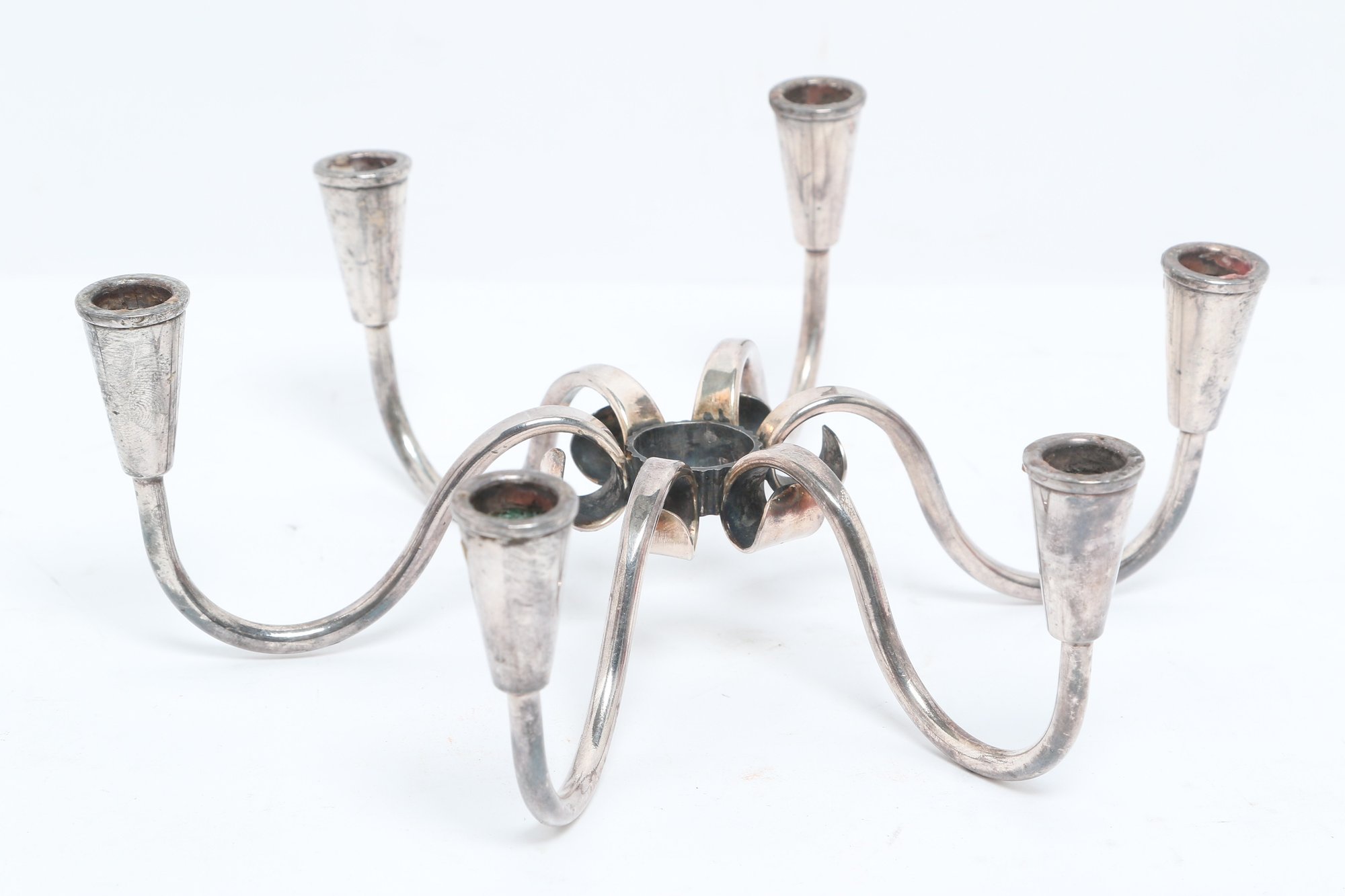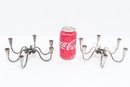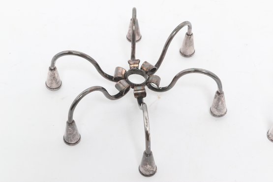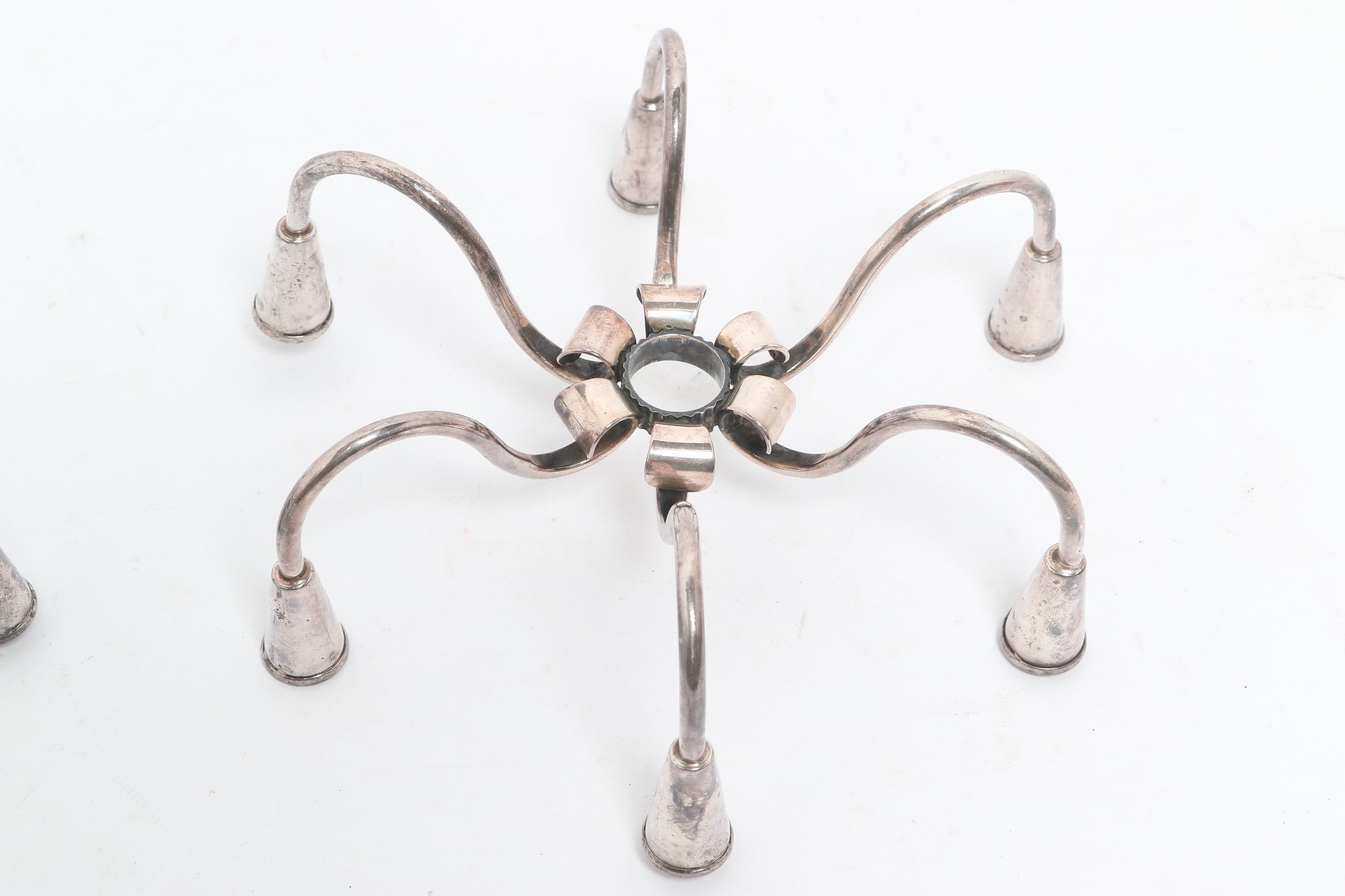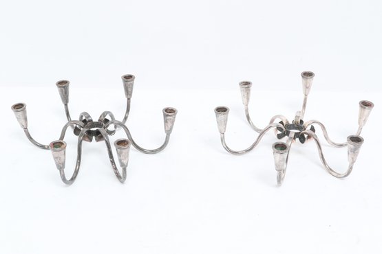 Pair of Danish modern style six-arm candelabras with sculptural curved form, attributed to Carl F. Christiansen. Silver-tone finish with elegant minimalist design; show patina and wear consistent with age.