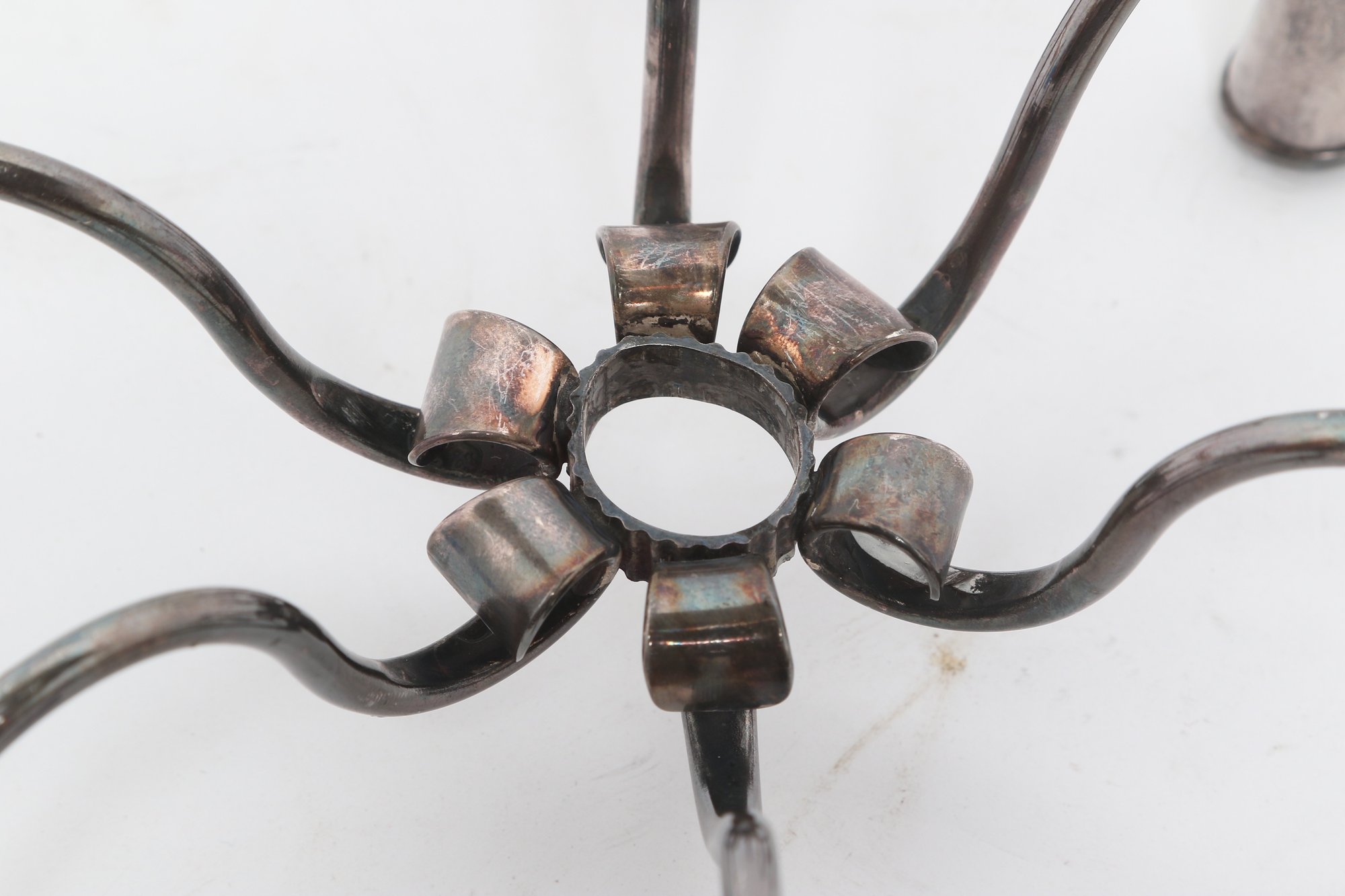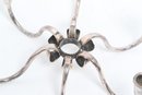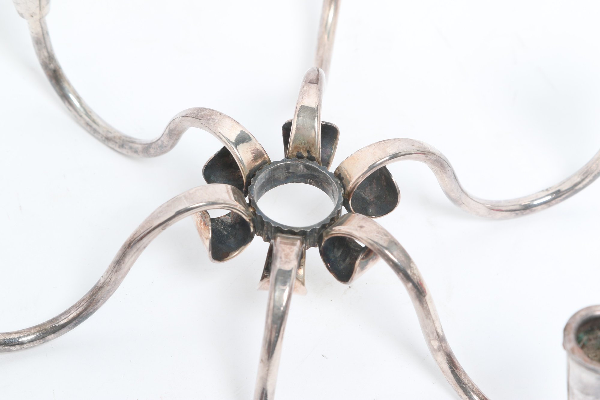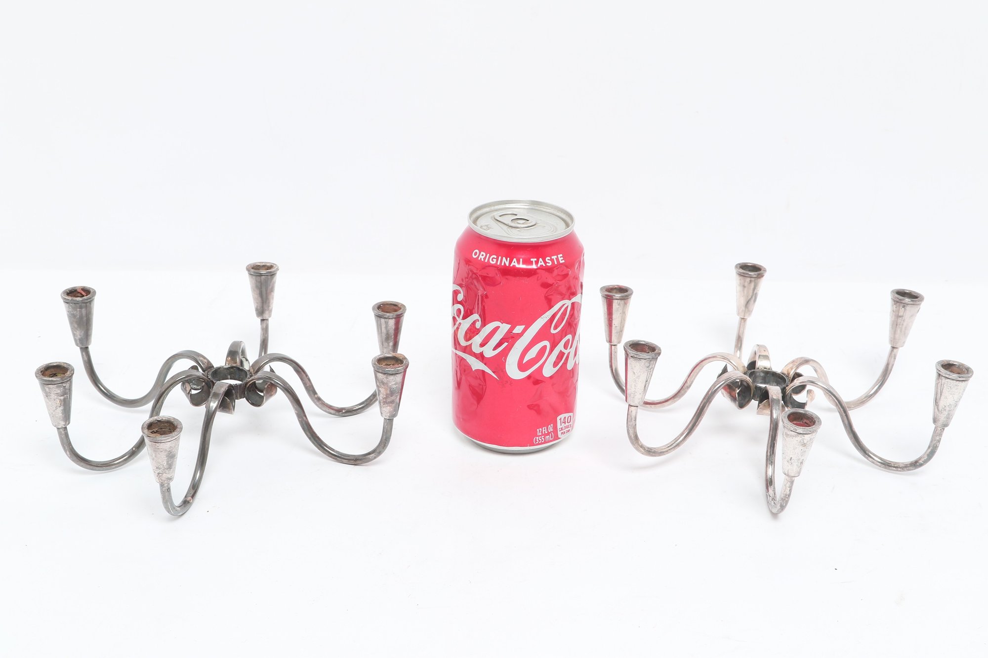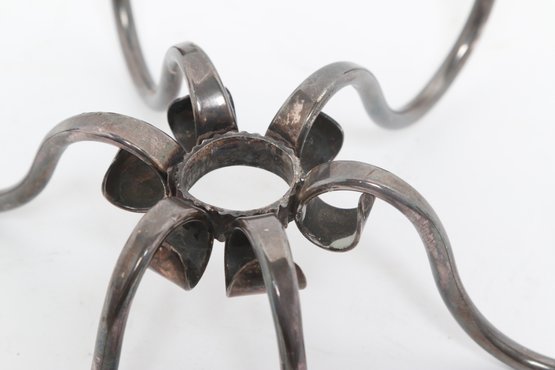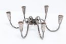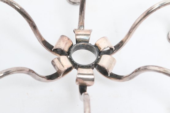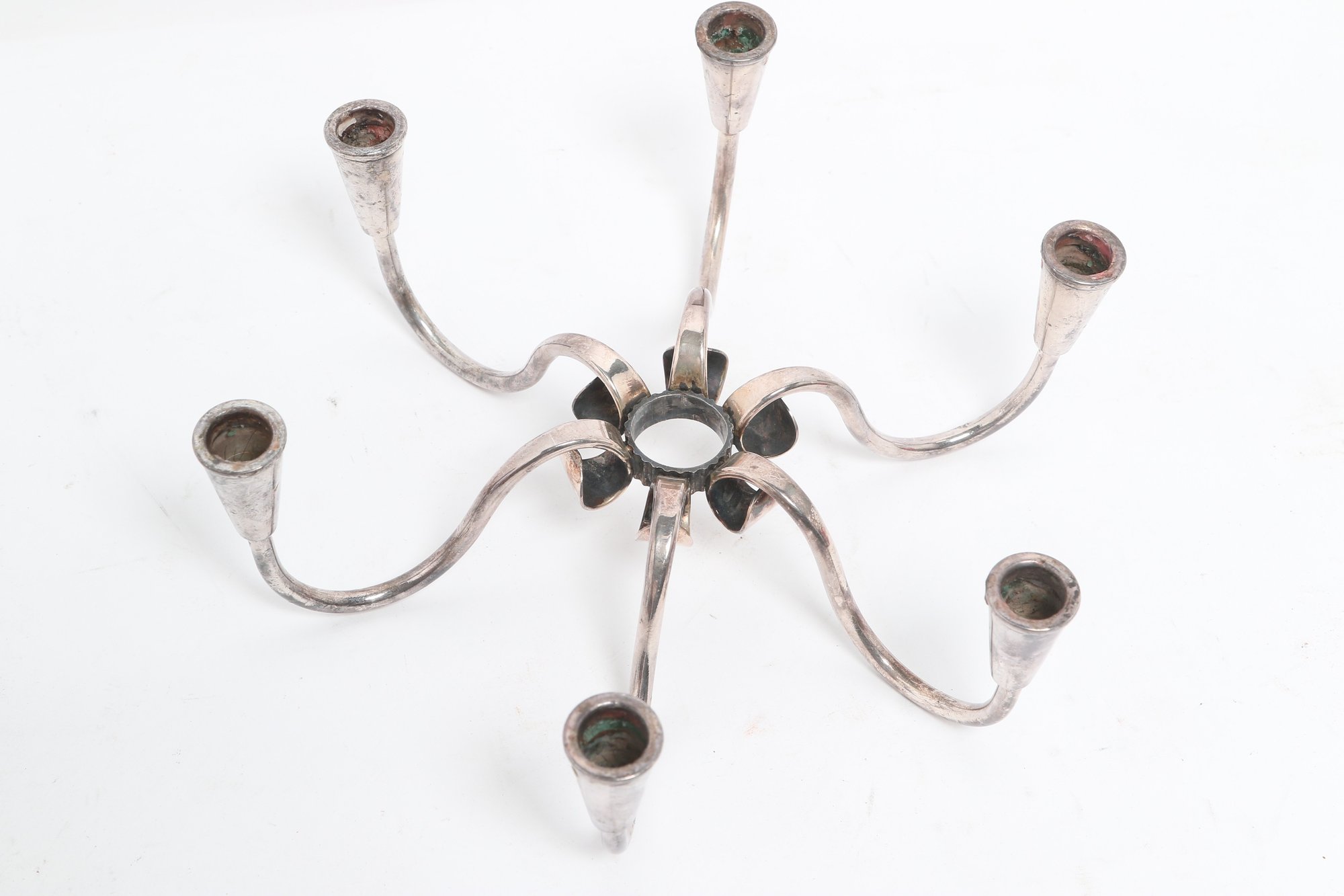 Pair of Danish modern style six-arm candelabras with sculptural curved form, attributed to Carl F. Christiansen. Silver-tone finish with elegant minimalist design; show patina and wear consistent with age.