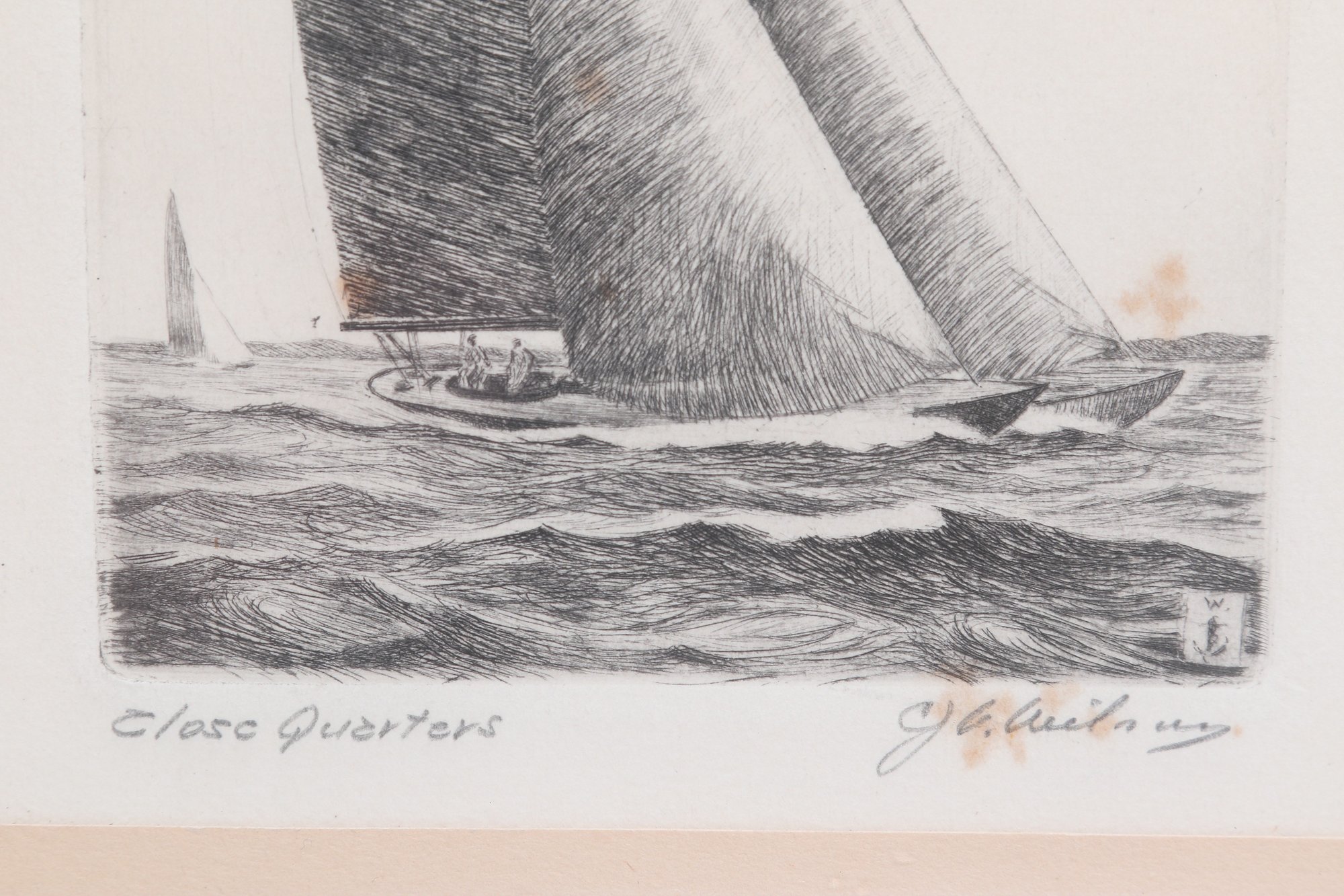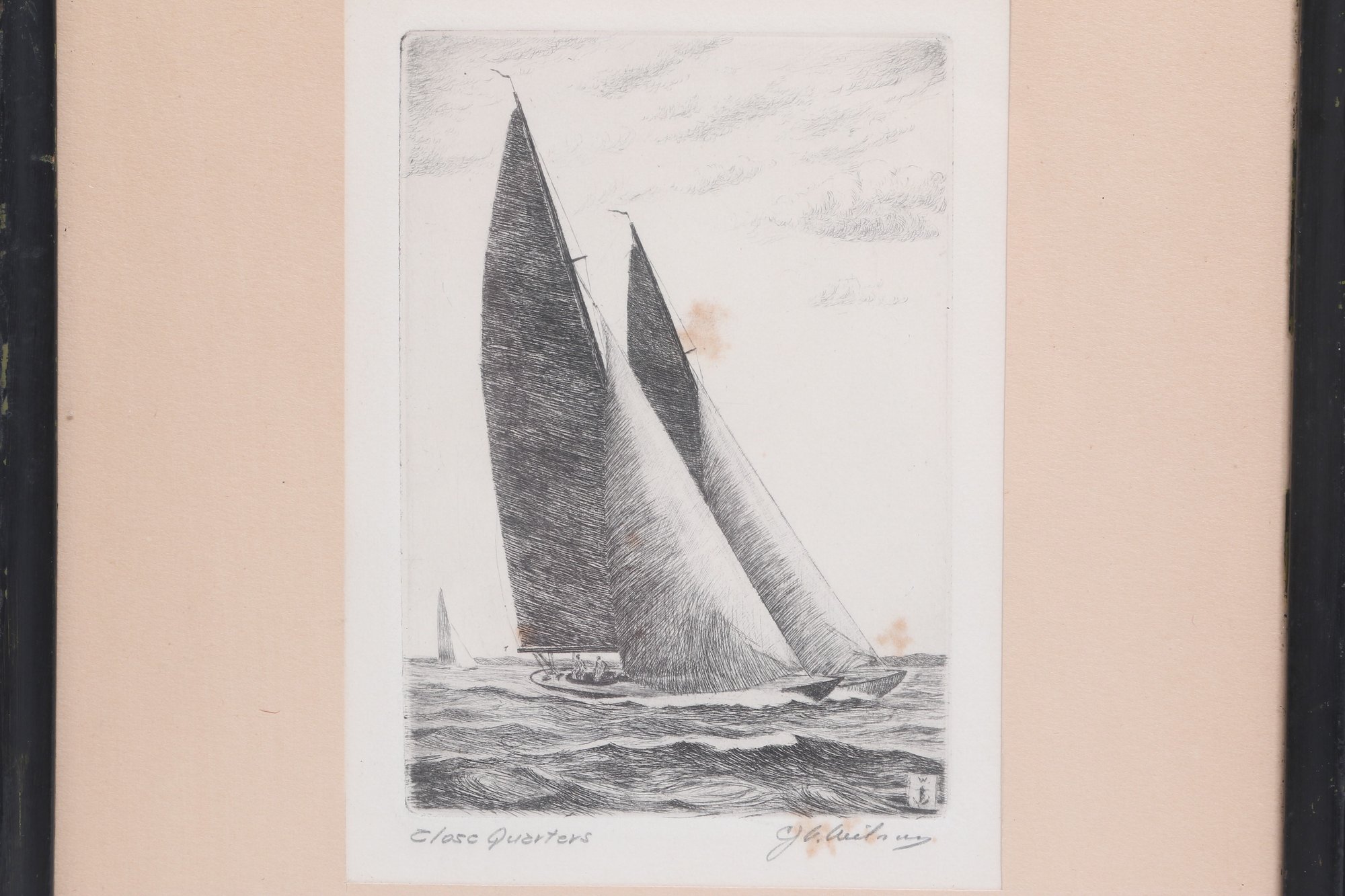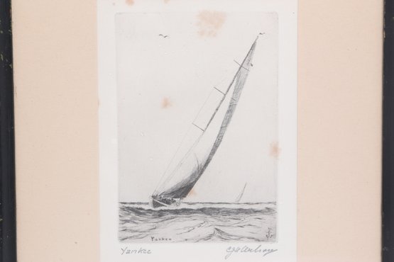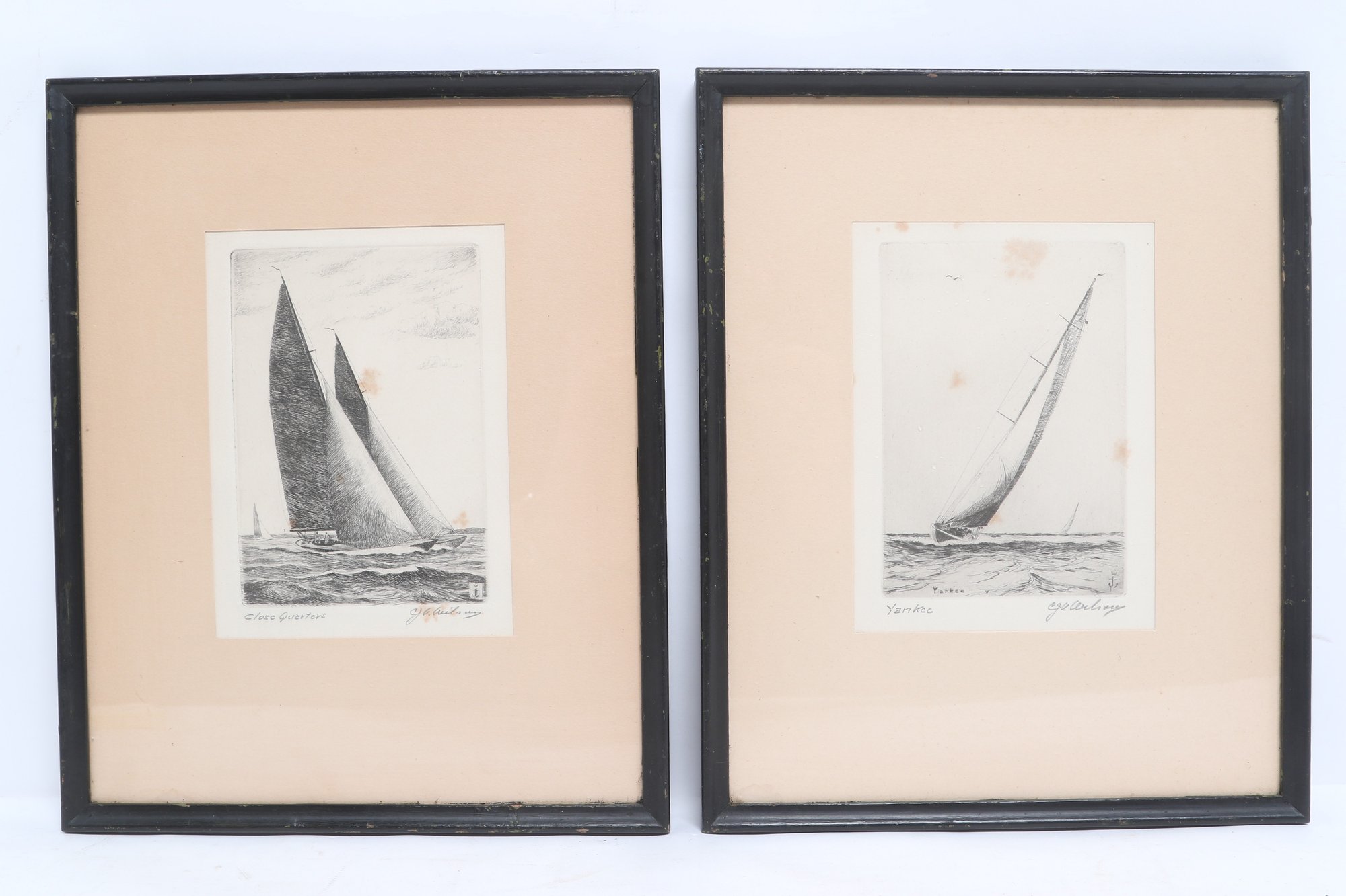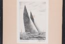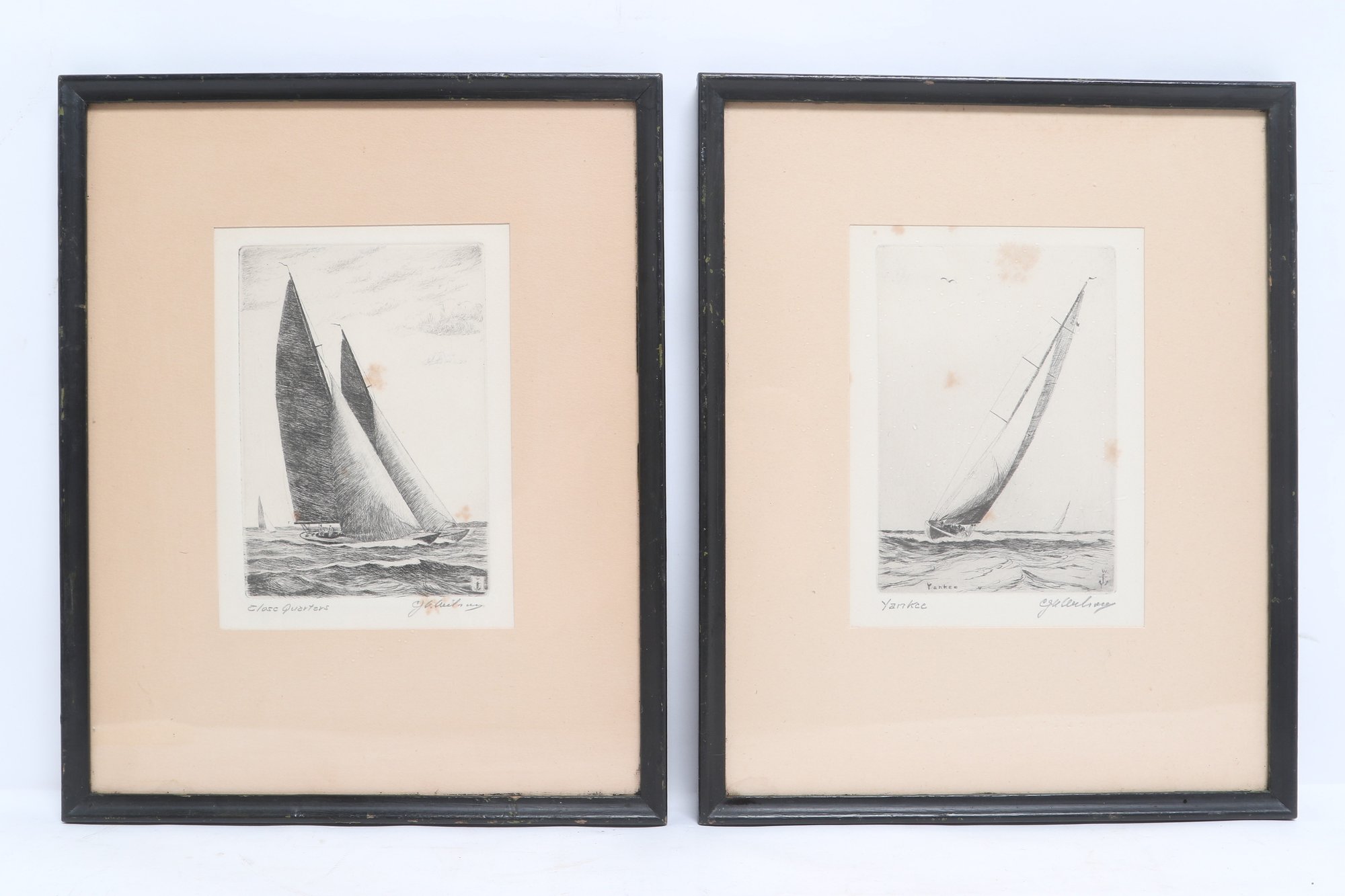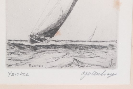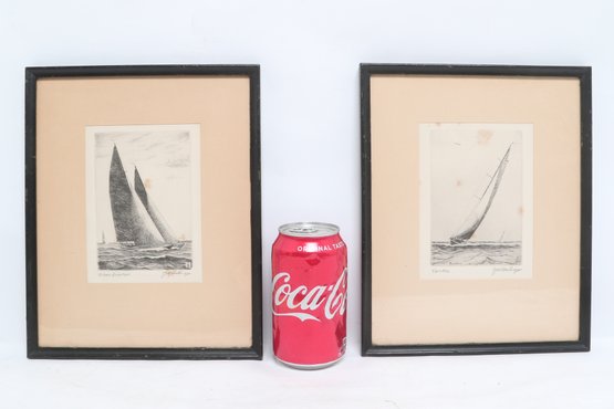 Nicely framed pair of signed nautical etchings depicting classic racing sailboats, titled “Yankee” and “Clare Quarter.” Each piece shows detailed linework with dynamic ocean scenes, matted and housed in simple black frames. Light toning and minor spotting visible, overall presenting well for display.