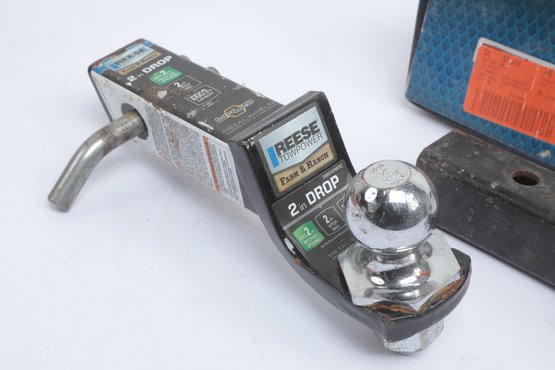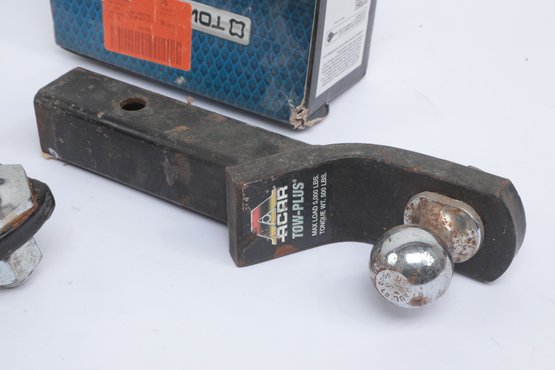 Pair Of Trailer Hitch Ball Mounts And Coupling Lock including ACAR Tow-Plus and Reese Towpower Farm models. See pictures carefully for details on size and condition of contents included with lot.