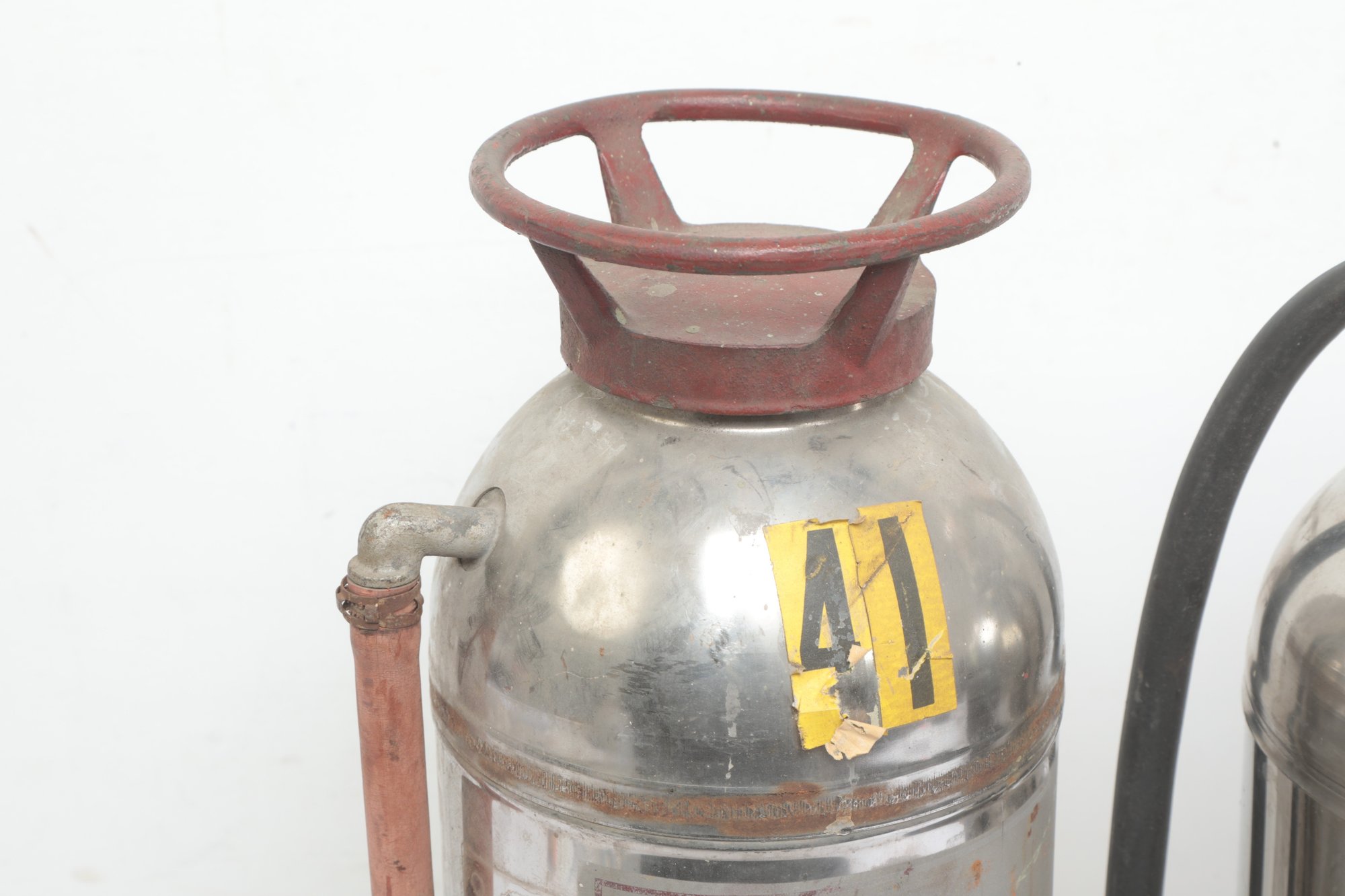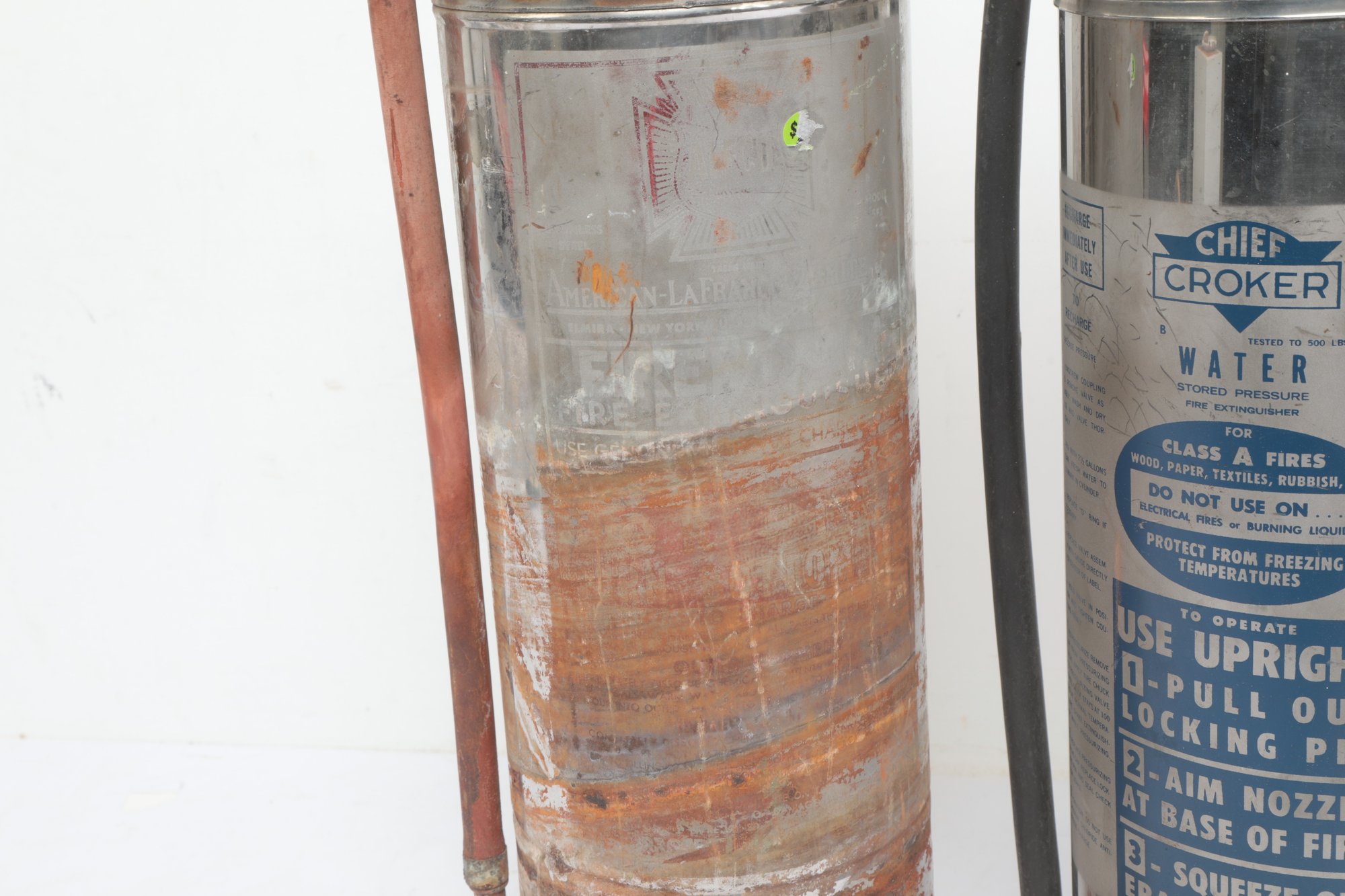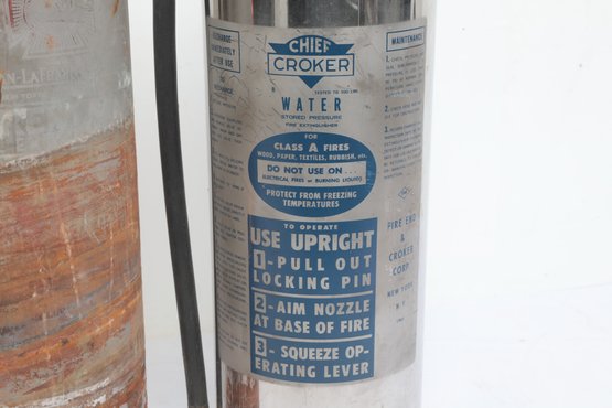 Pair Of Vintage Fire Extingiushers Including Chief Croker. Croker tank appears full. Extinguishers sold for collecting or display only. See pictures carefully for details on size and condition.