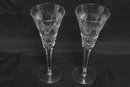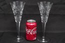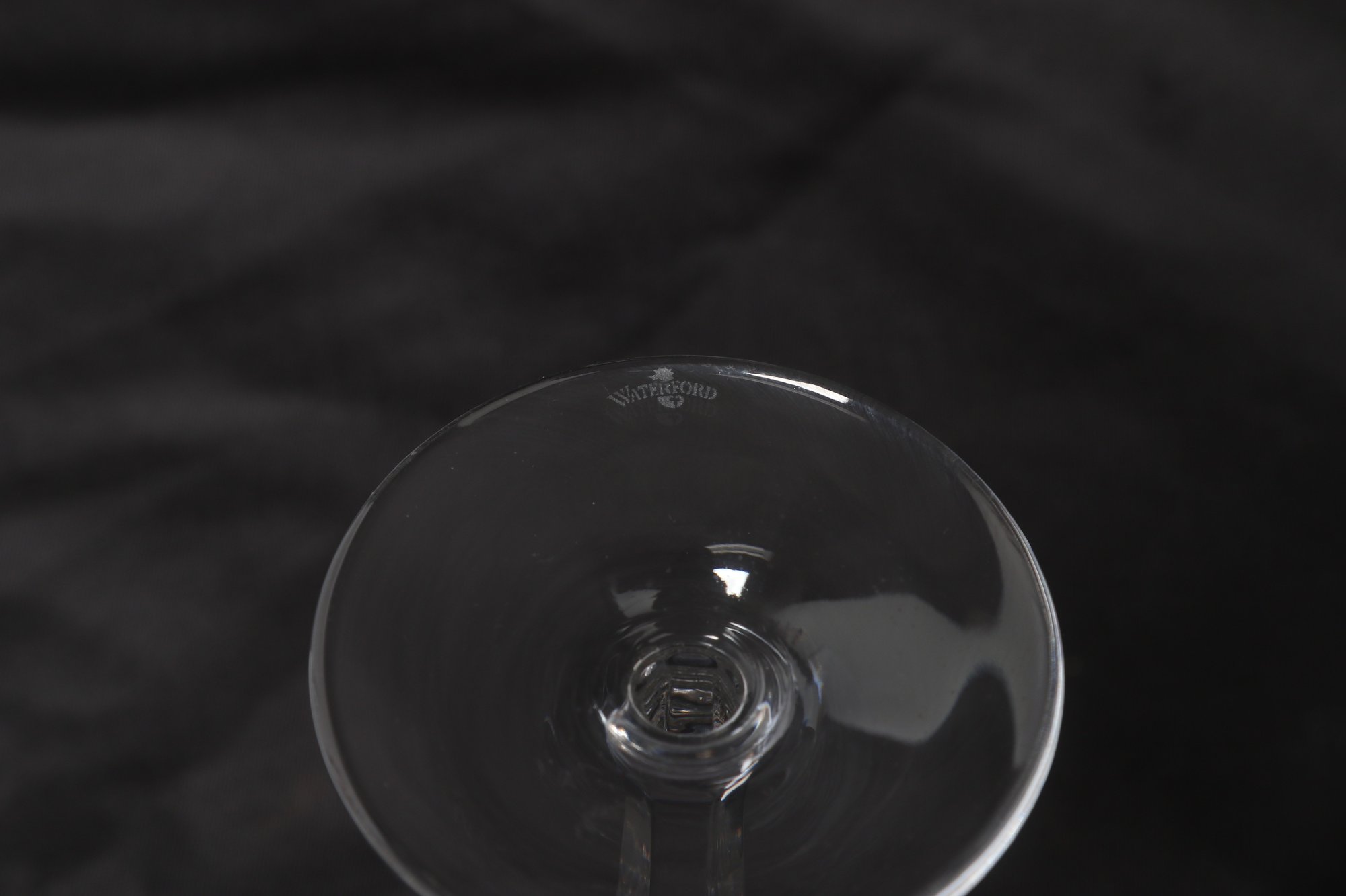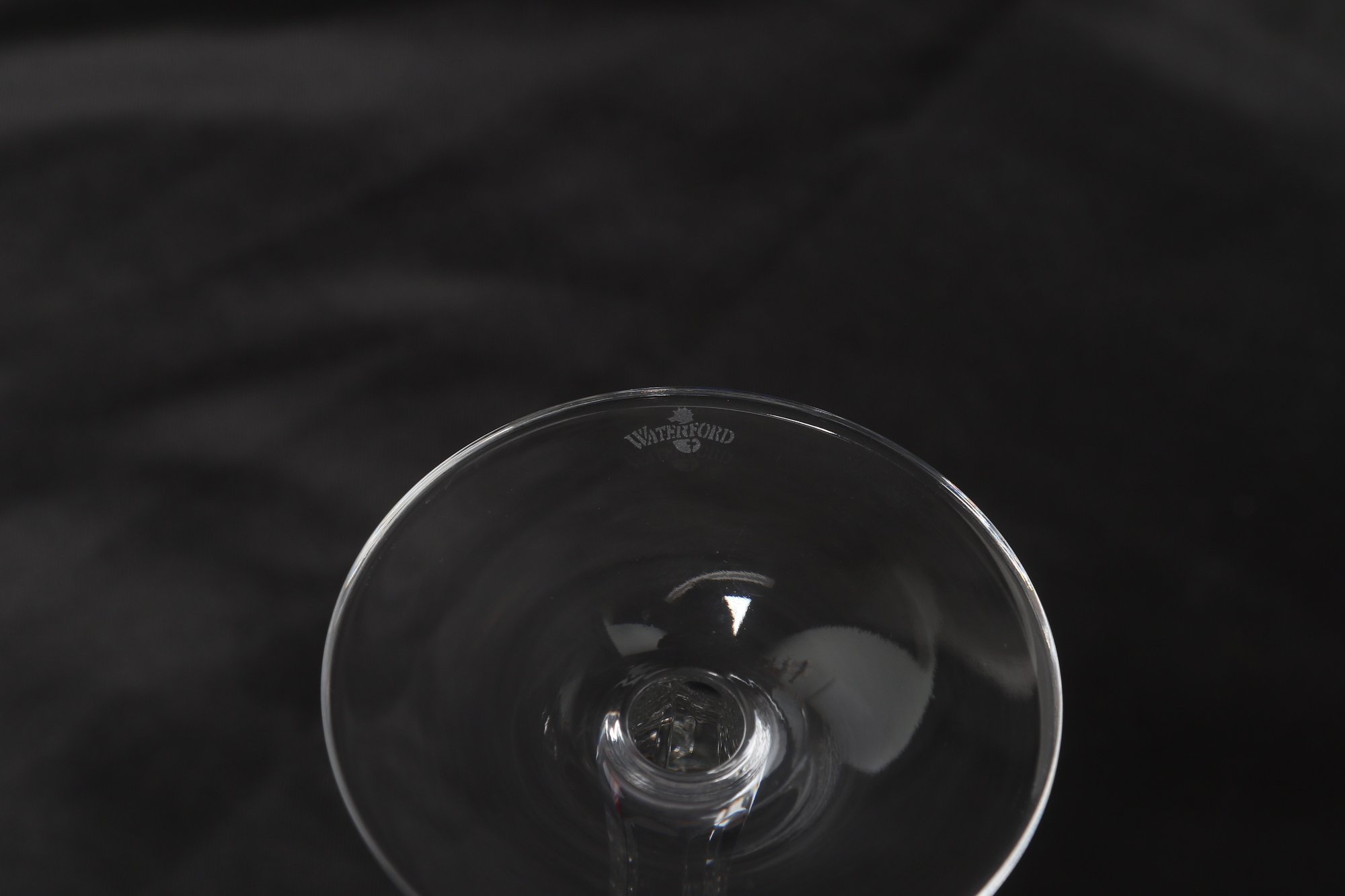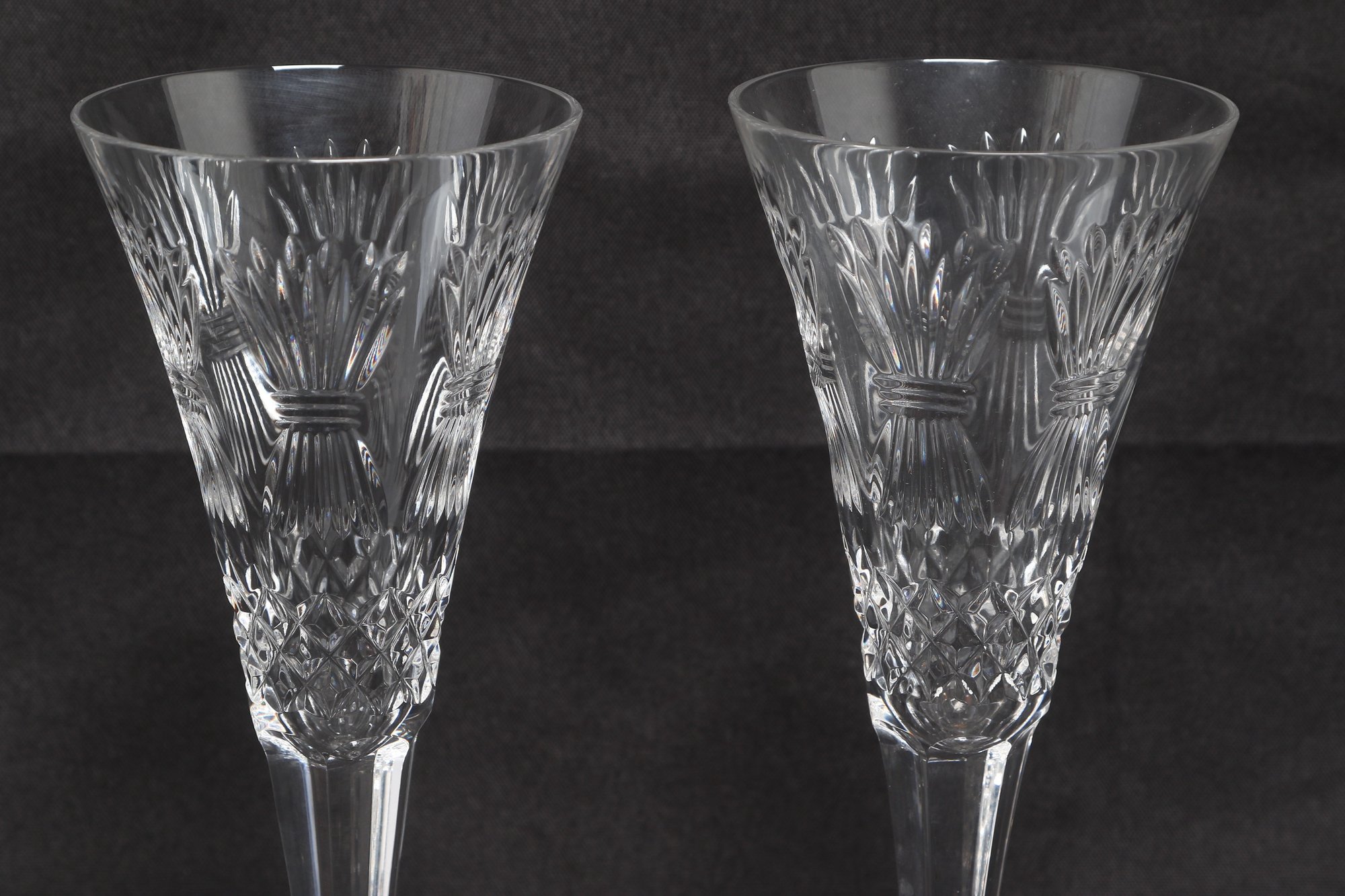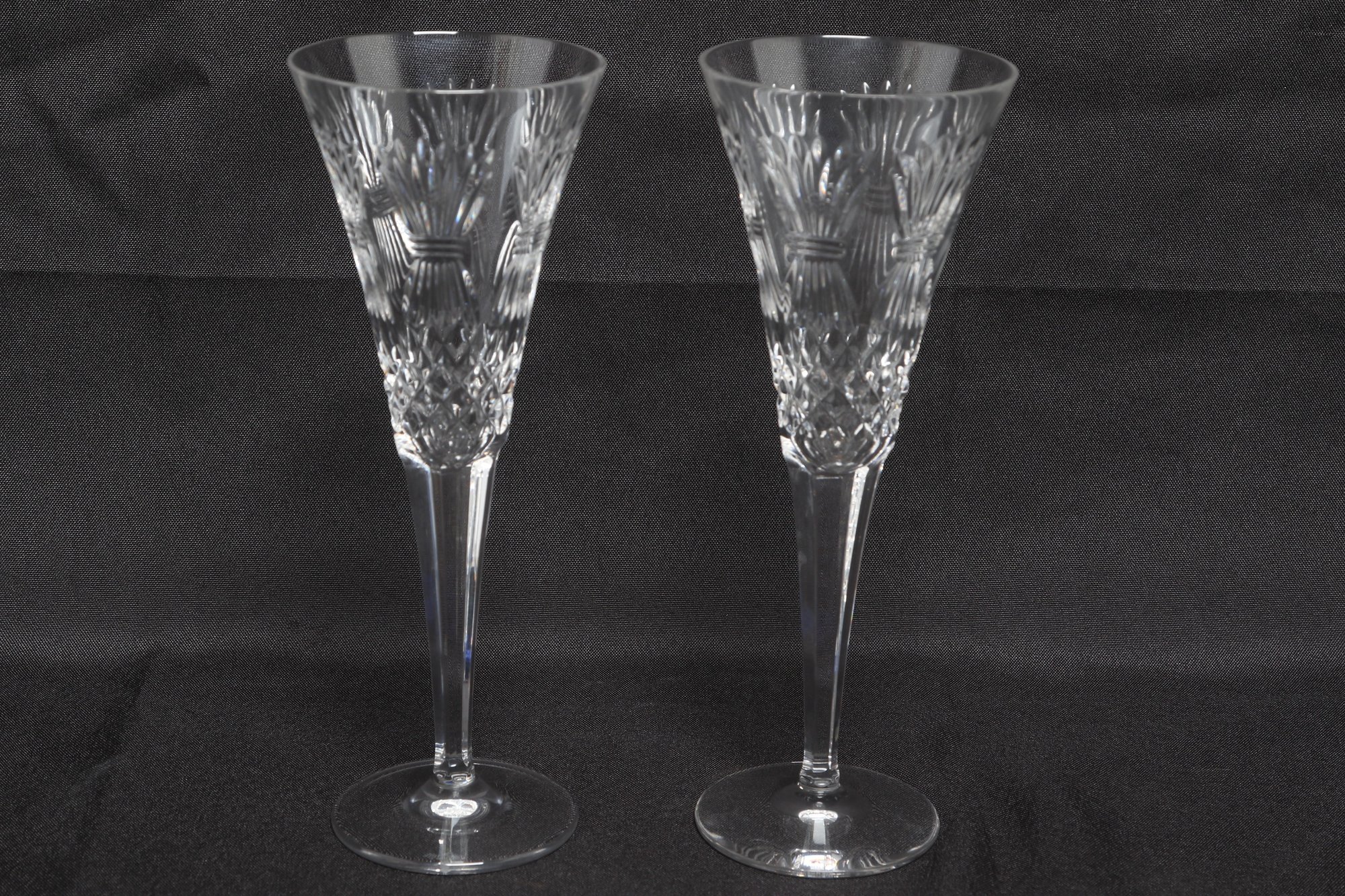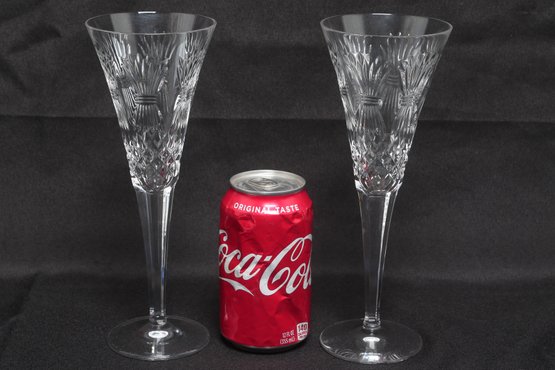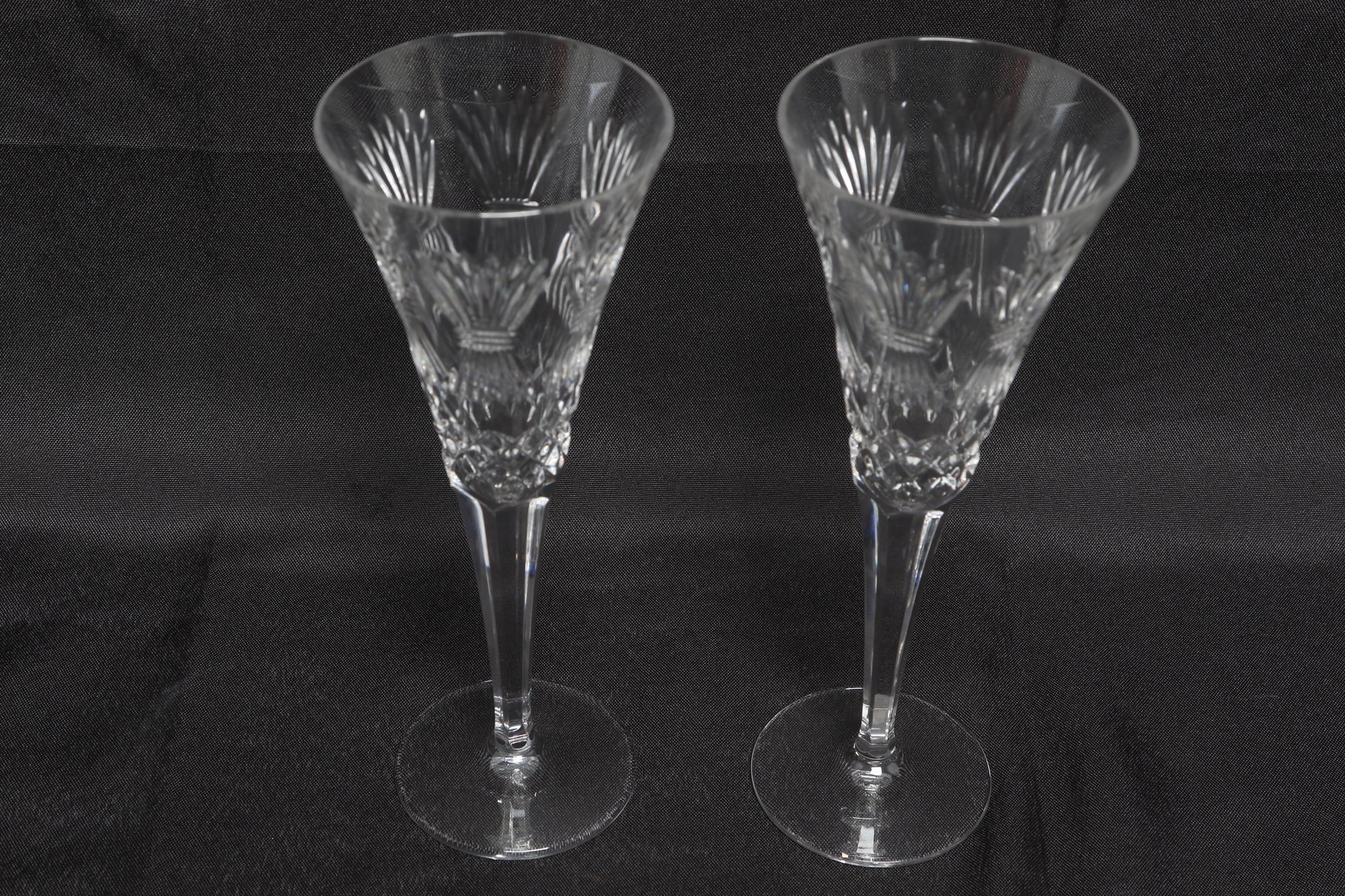 Beautiful pair of Waterford crystal champagne flutes in the Colleen pattern, showcasing intricate vertical and crisscross cuts with a detailed lower bowl. These elegant long-stem glasses offer excellent brilliance and balance, perfect for entertaining or display. Marked Waterford and presented in very good condition with no visible chips or cracks.