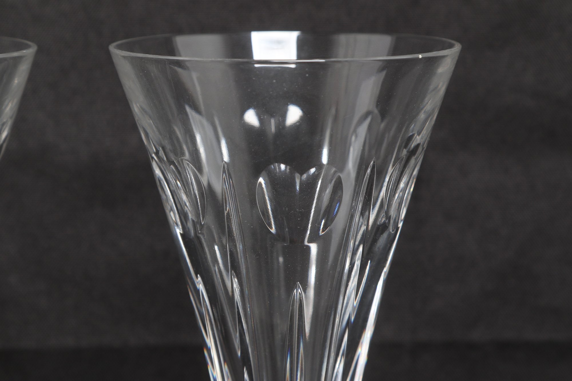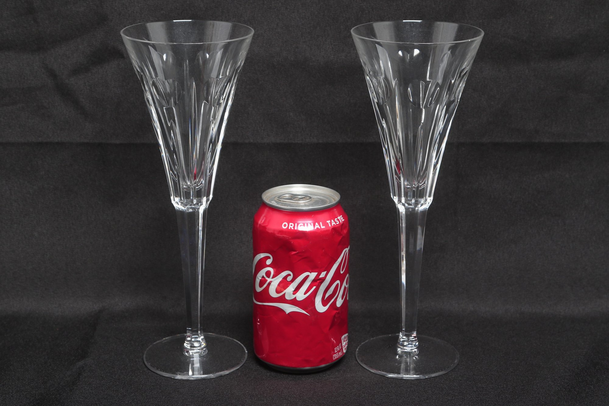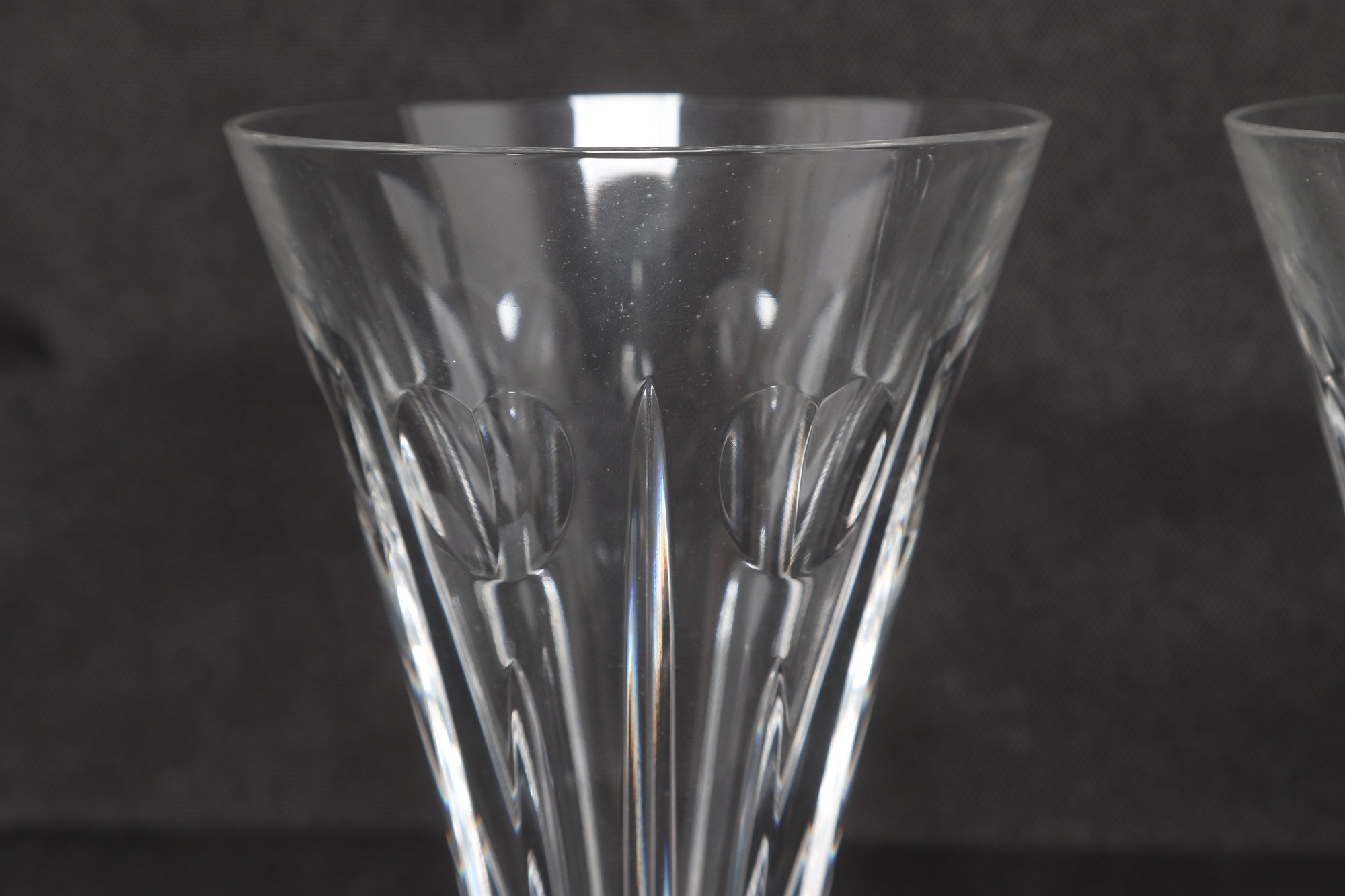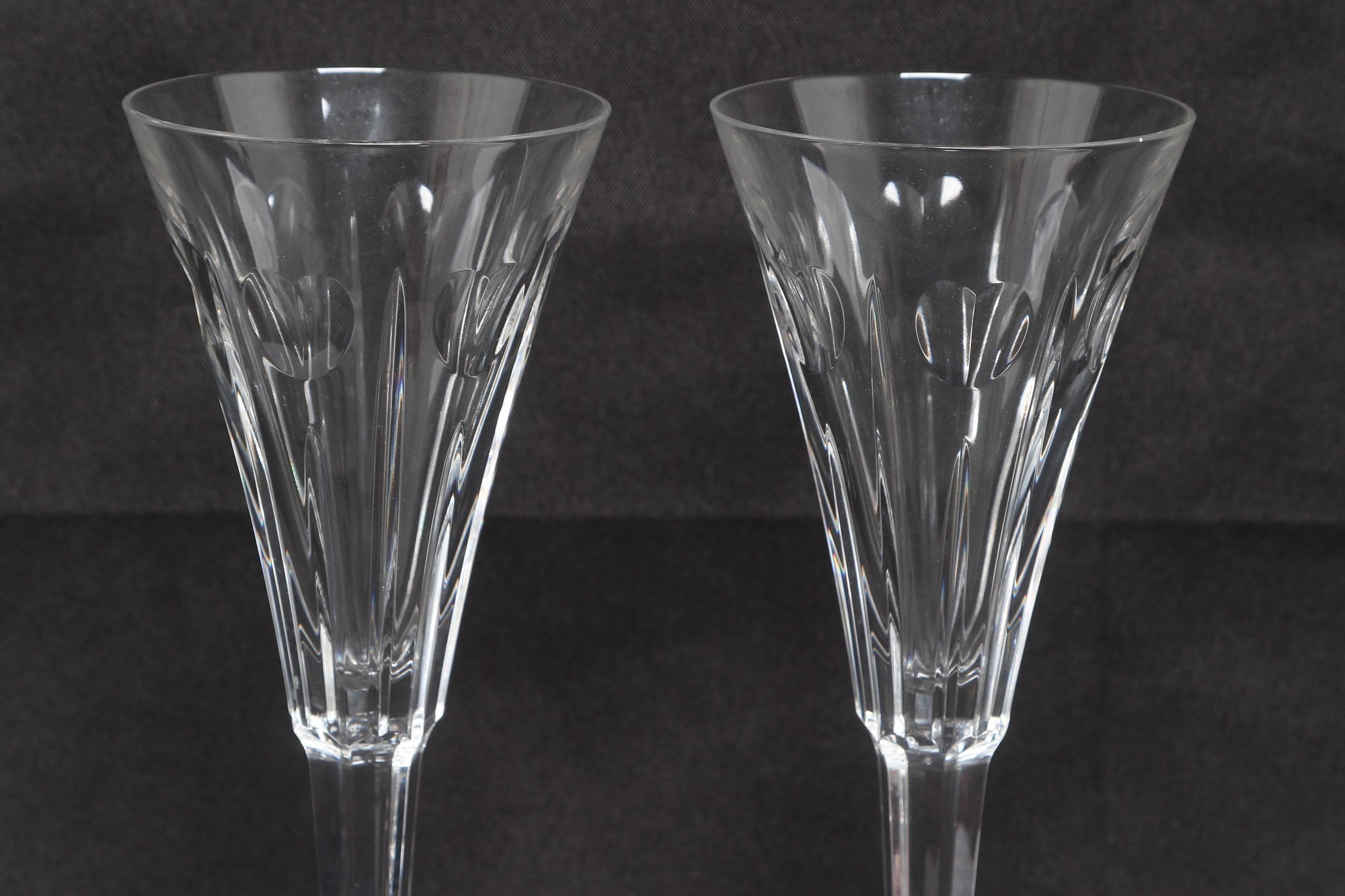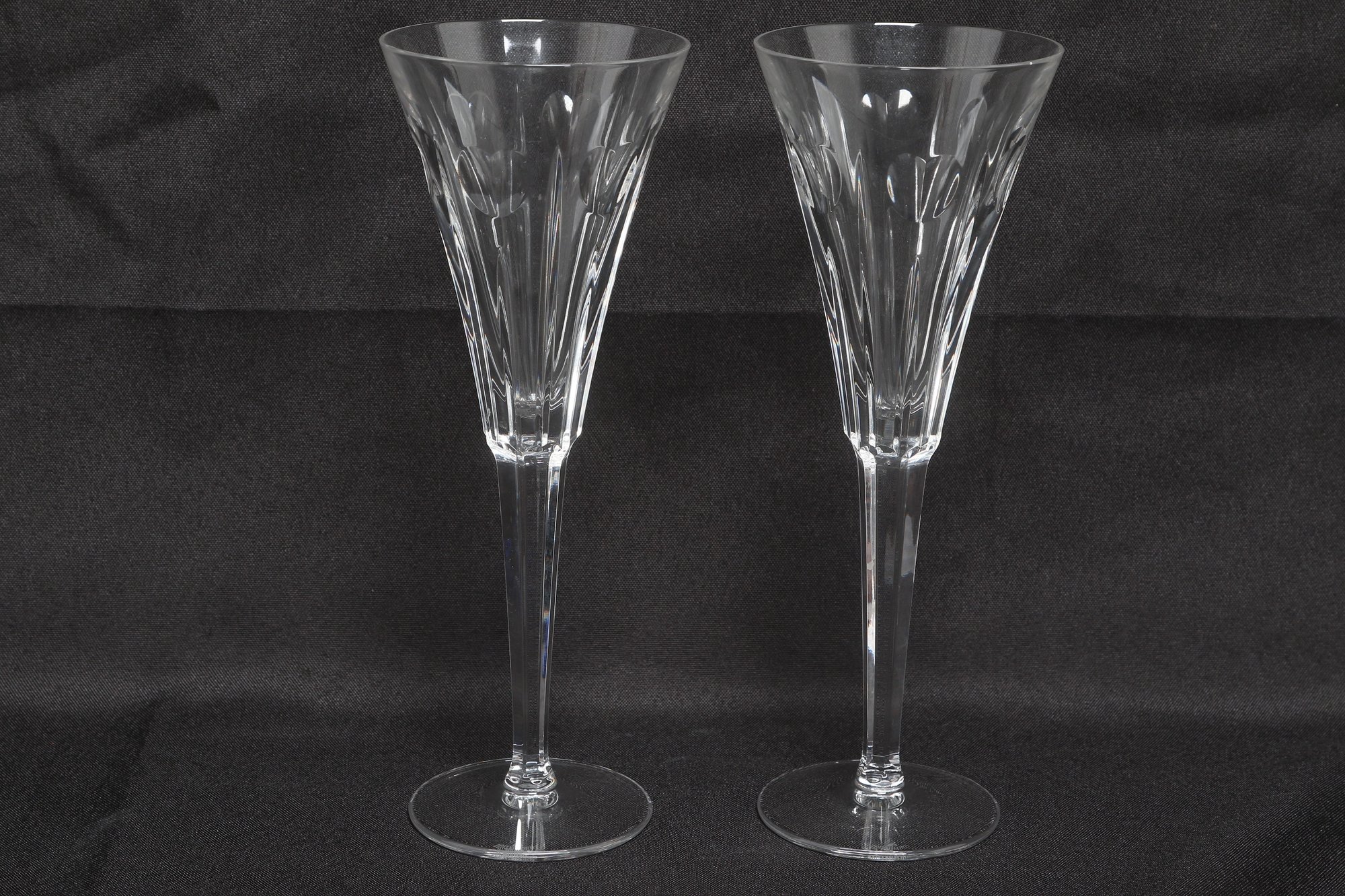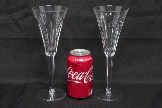 Elegant pair of Waterford crystal champagne flutes in the classic Lismore pattern, featuring signature diamond and wedge cuts with long, slender stems. Marked Waterford at the rim, these beautifully crafted glasses offer brilliant clarity and timeless style, ideal for special occasions or display. Appear in very good condition with no visible chips or cracks.