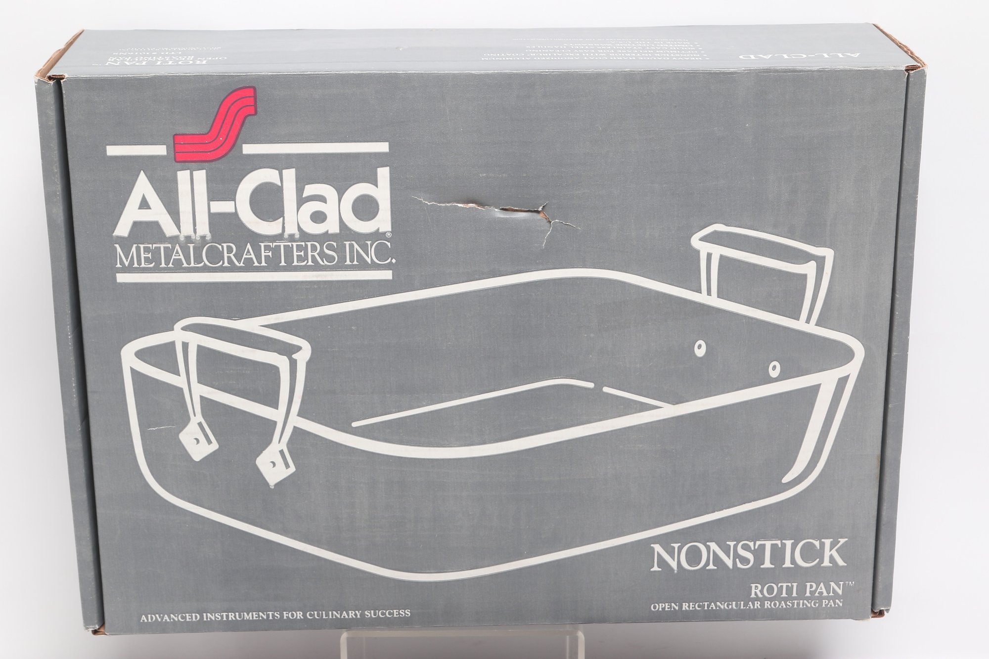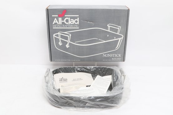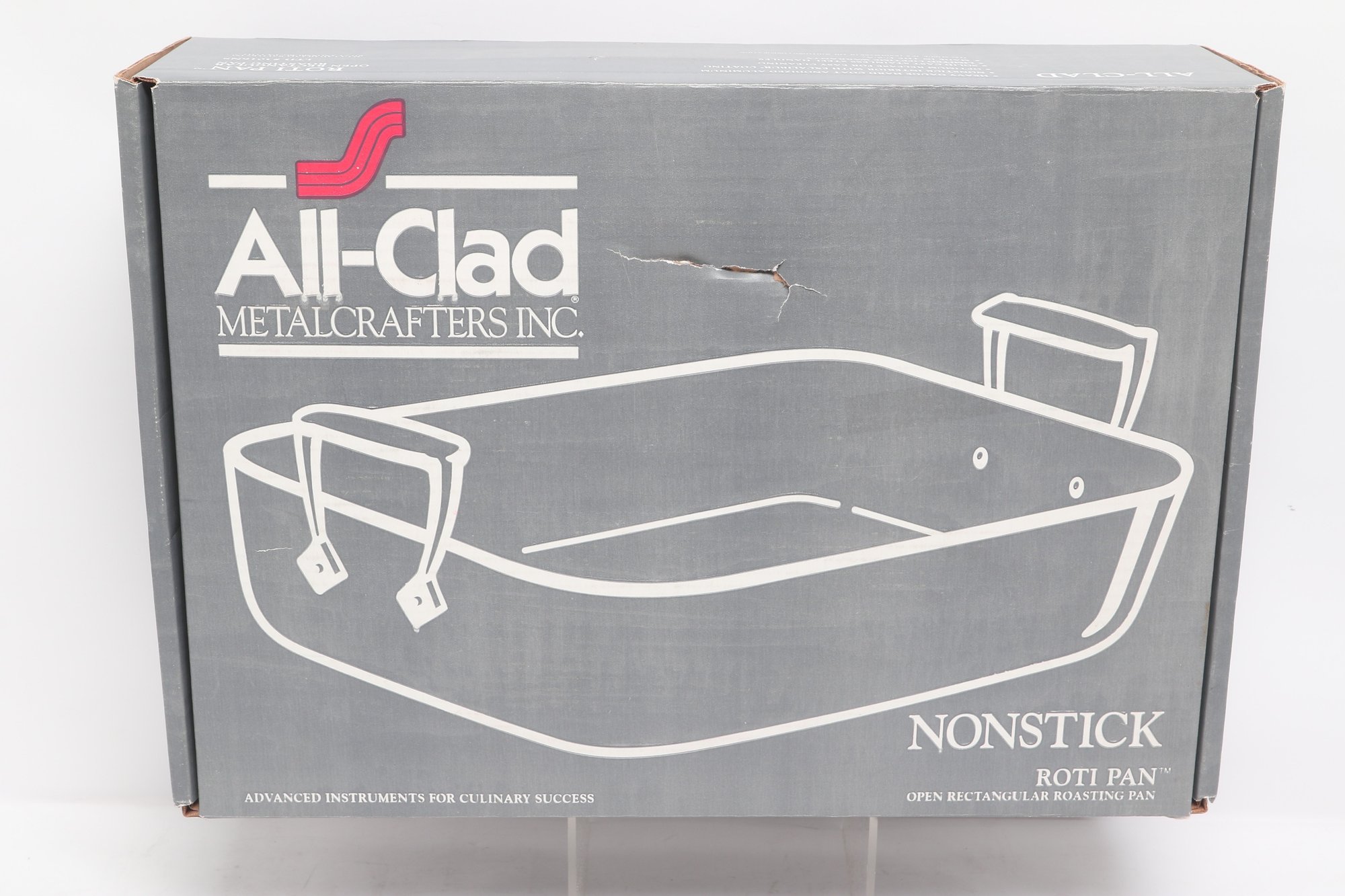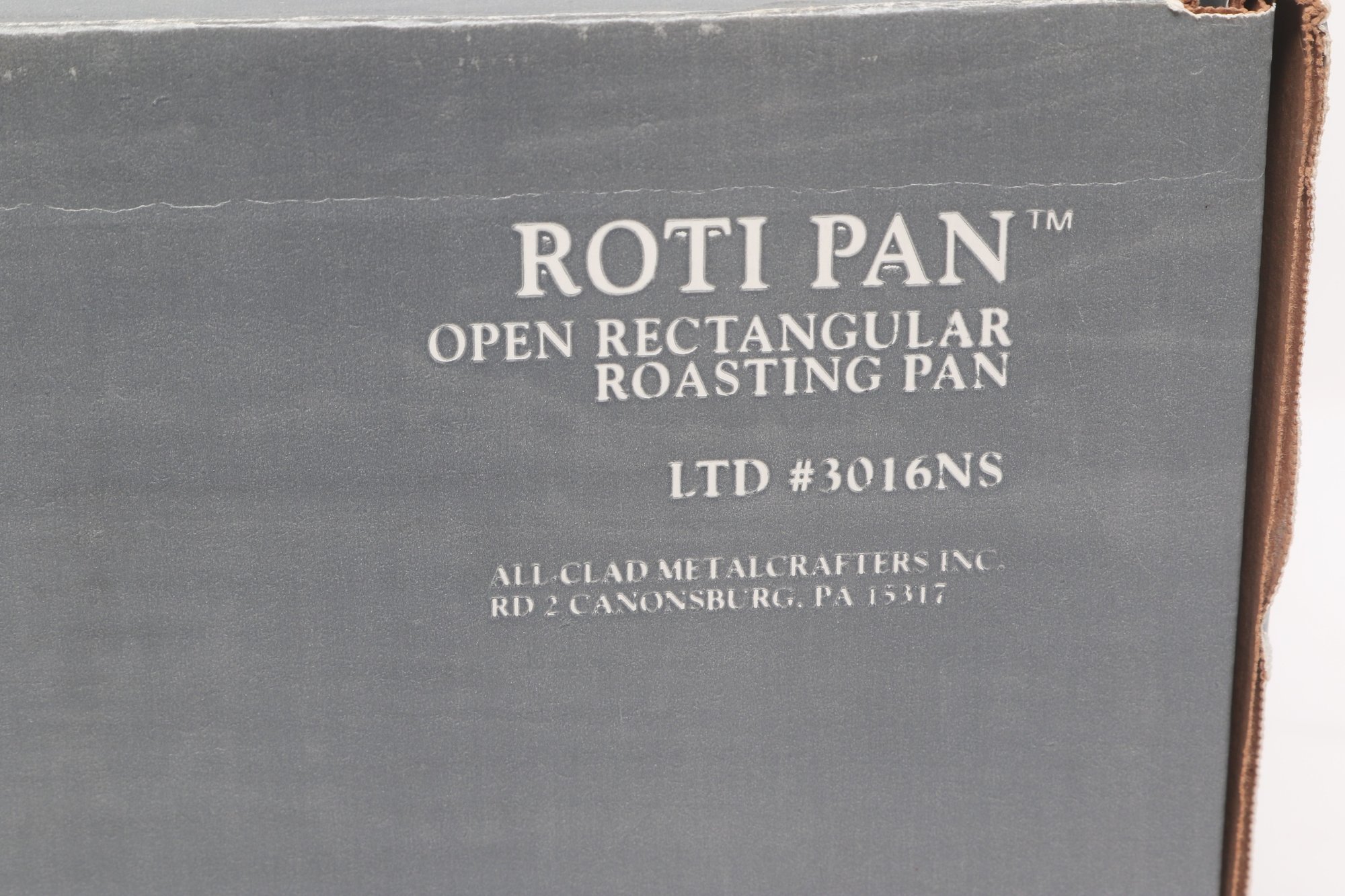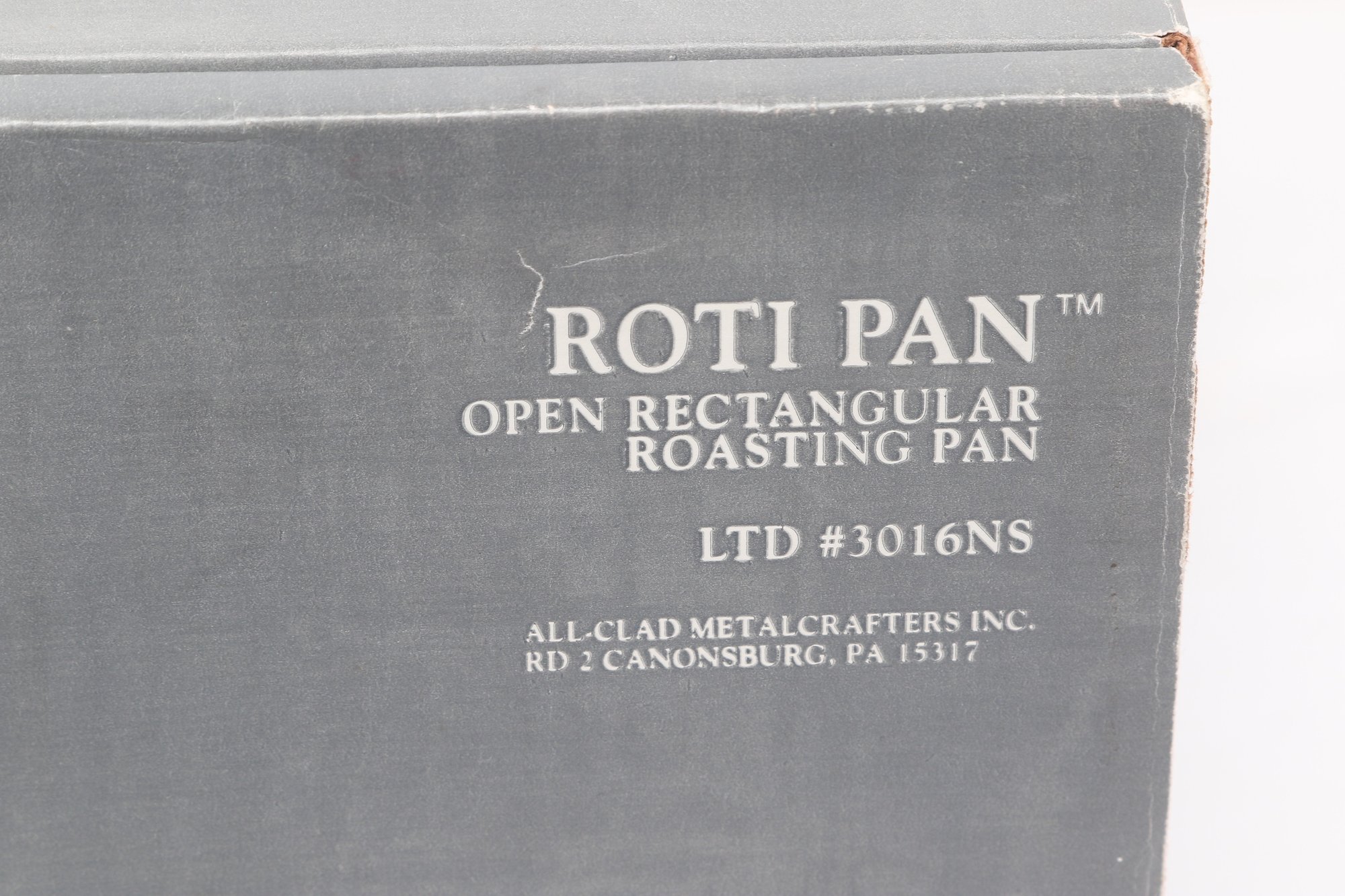 All-Clad LTD nonstick open rectangular roti roasting pan, model #3016NS, new in box with paperwork and recipe cards. Heavy-duty construction with nonstick interior and sturdy handles, ideal for roasting meats and vegetables. Unused, in original packaging.