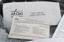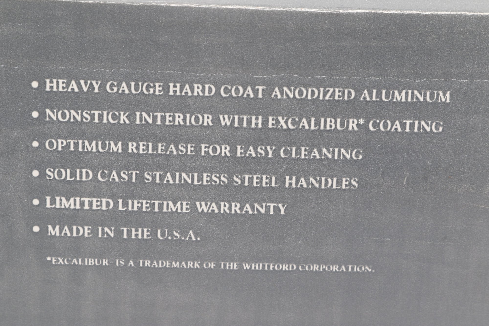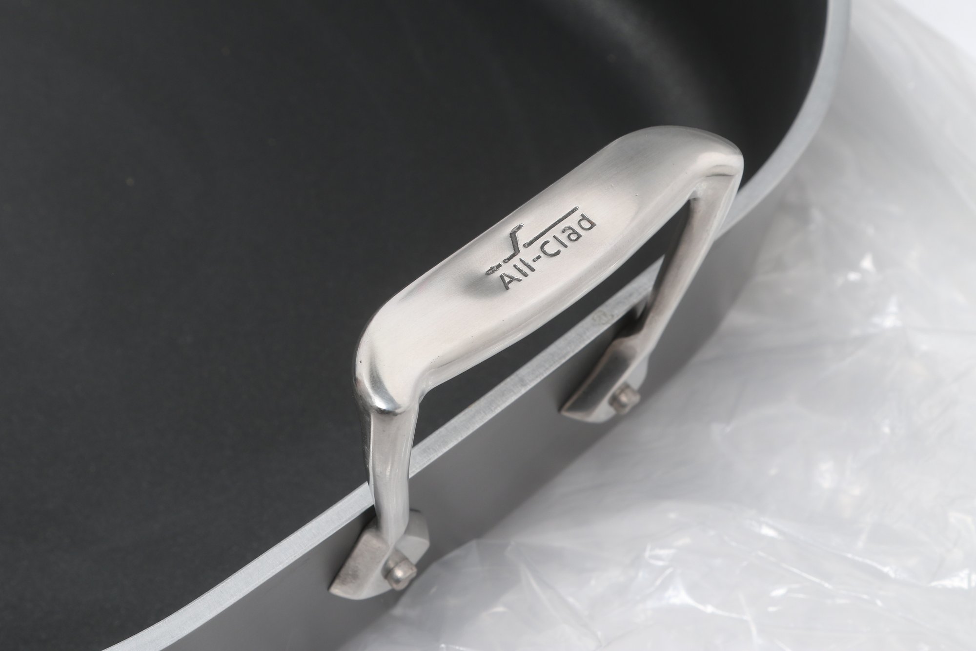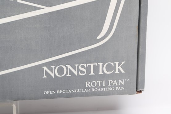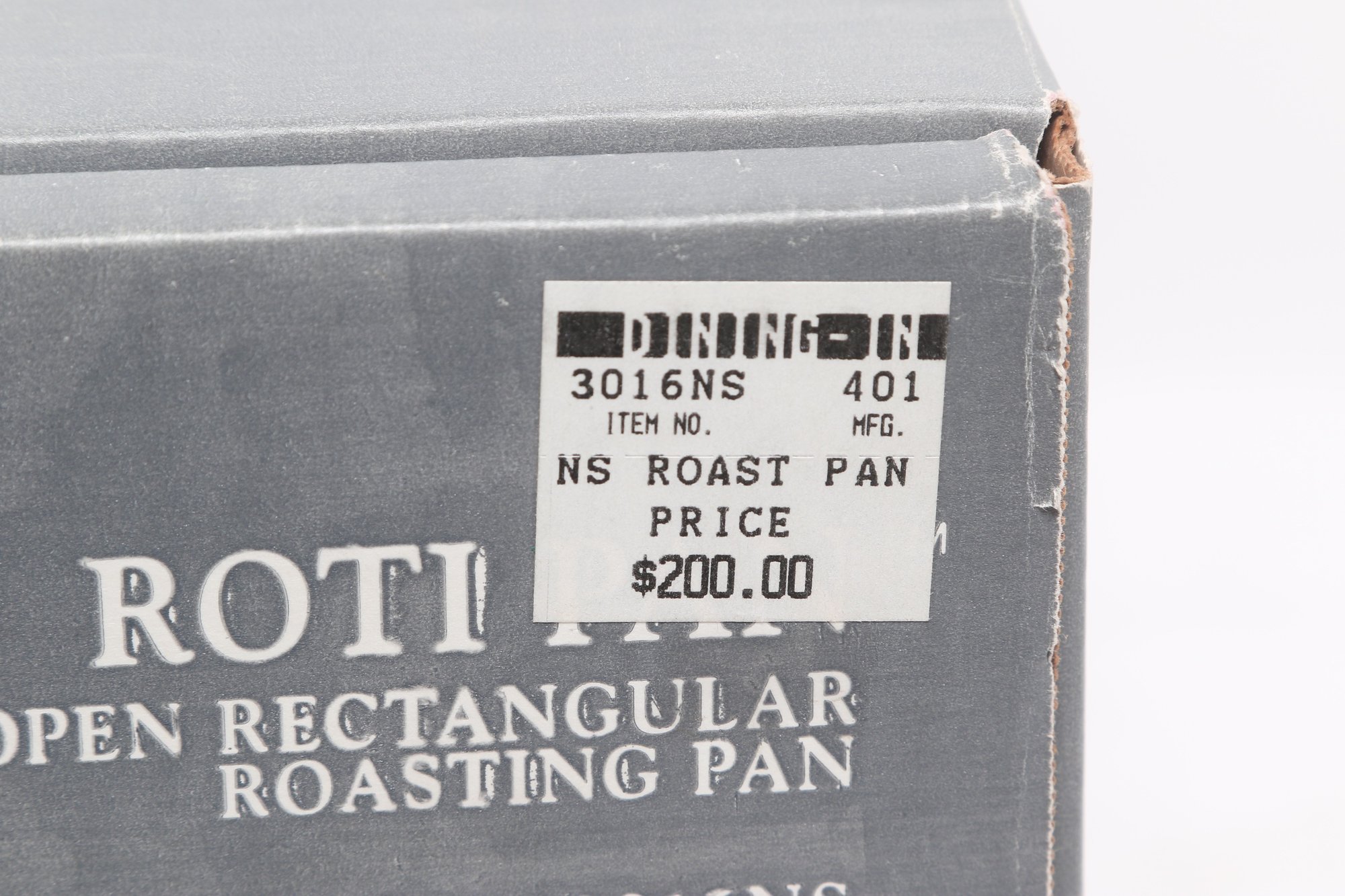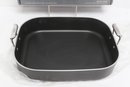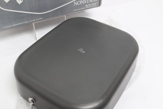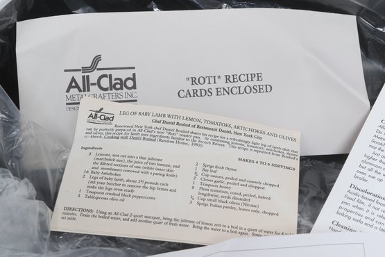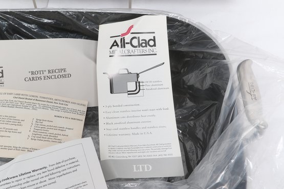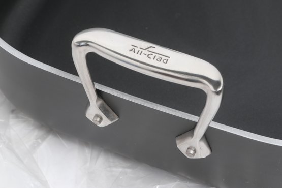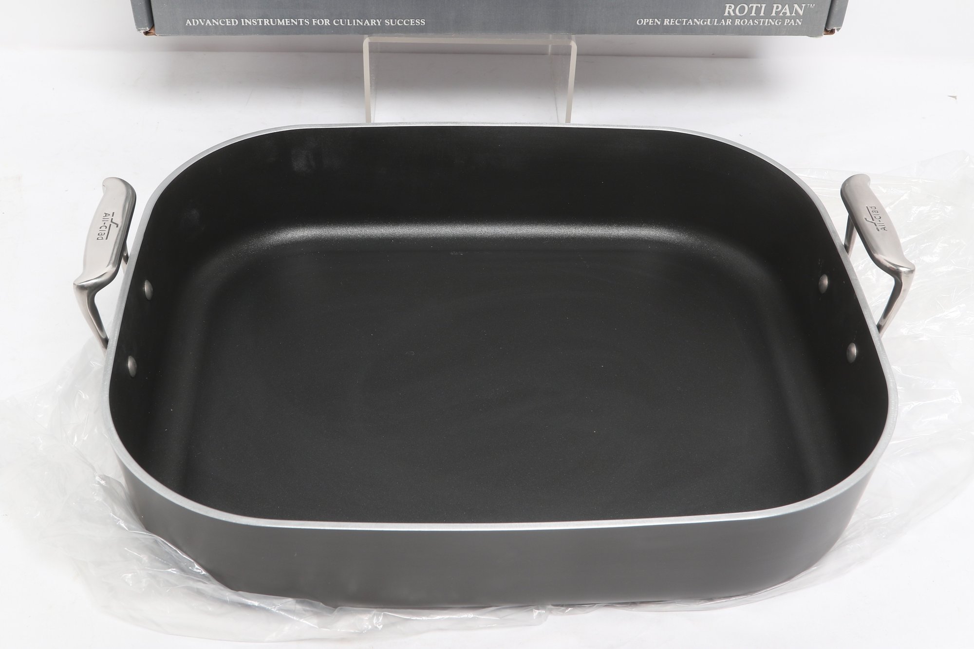 All-Clad LTD nonstick open rectangular roti roasting pan, model #3016NS, new in box with paperwork and recipe cards. Heavy-duty construction with nonstick interior and sturdy handles, ideal for roasting meats and vegetables. Unused, in original packaging.
