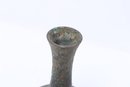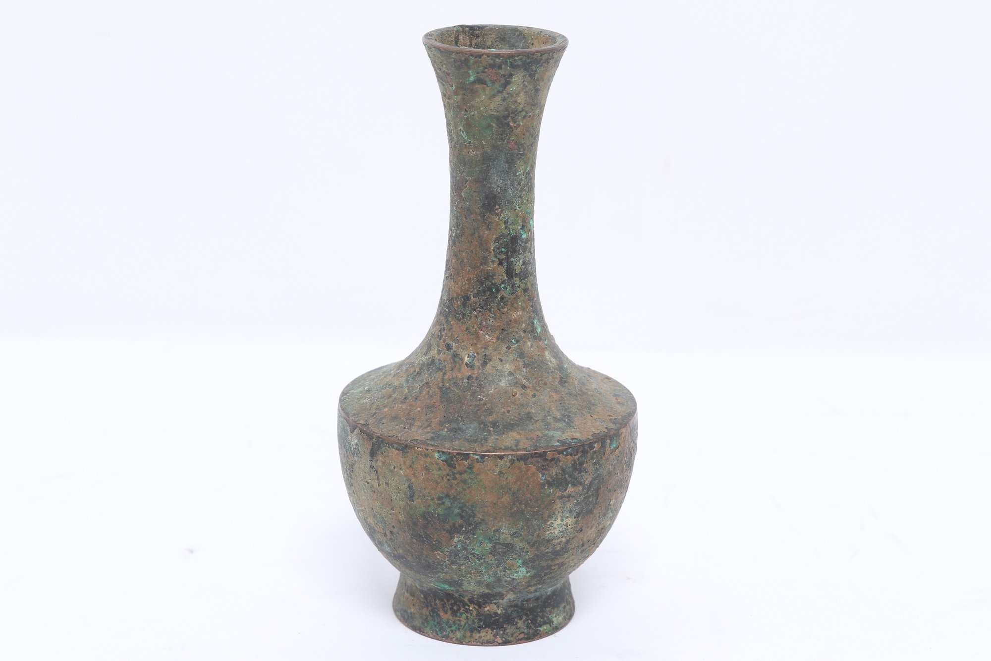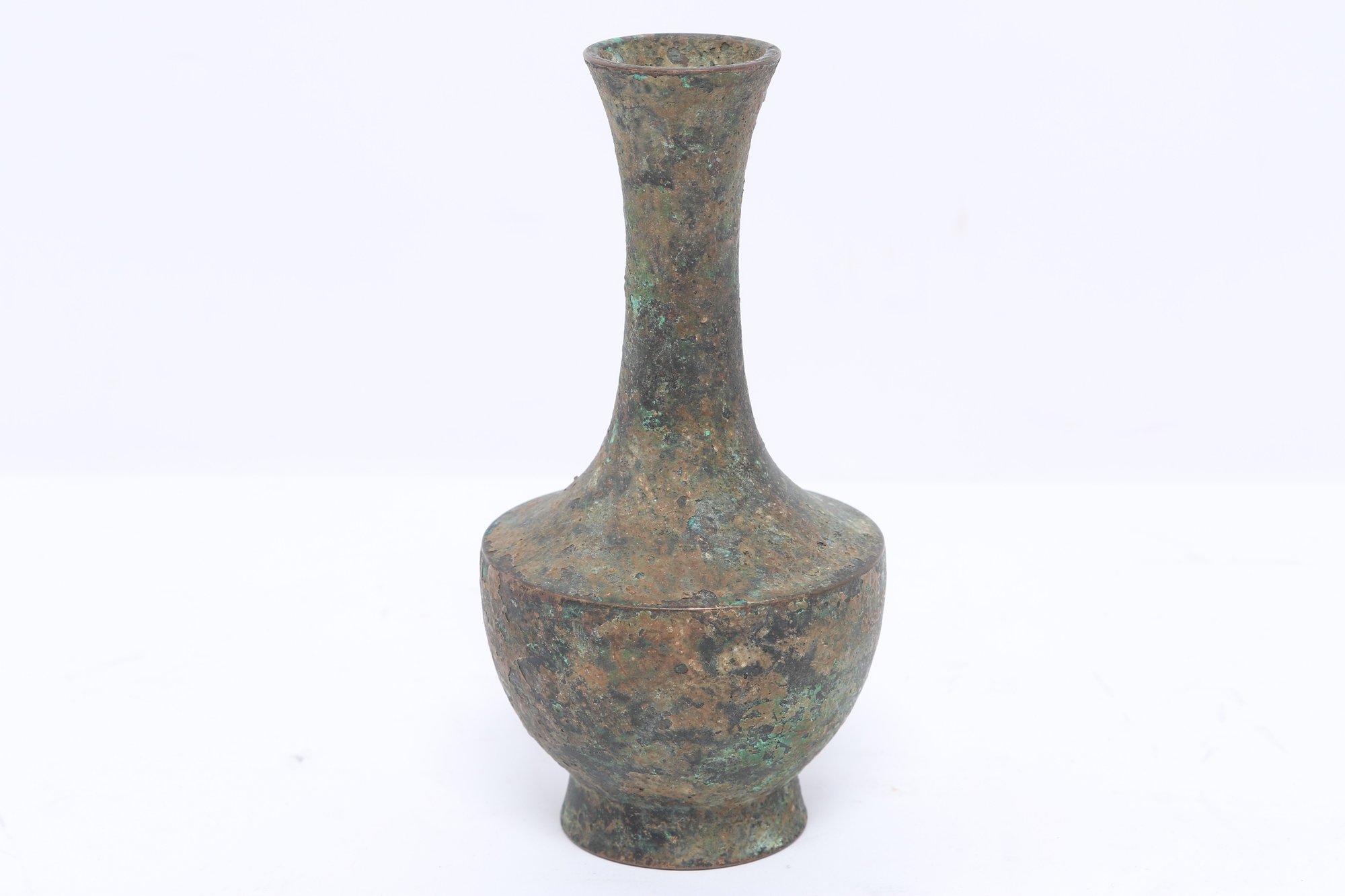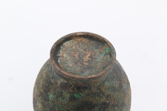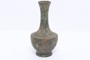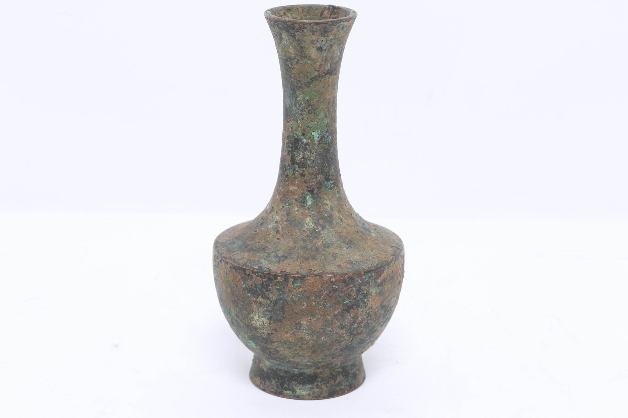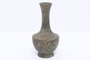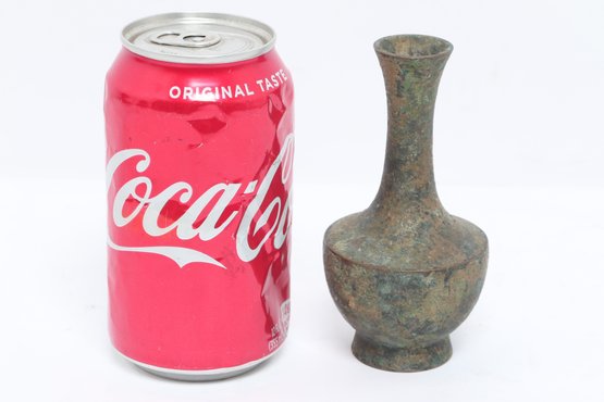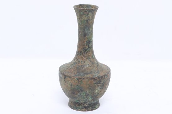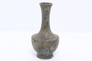 Small Asian bronze bud vase nice patina showing green and brown tones. Slender neck with rounded body; a decorative accent piece for shelf or tabletop display.
