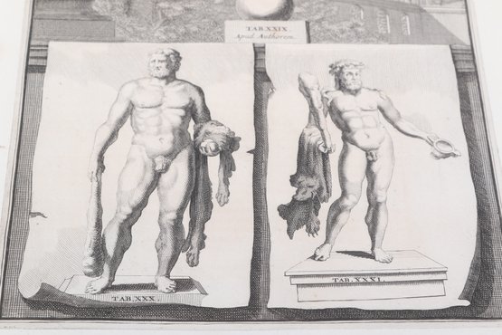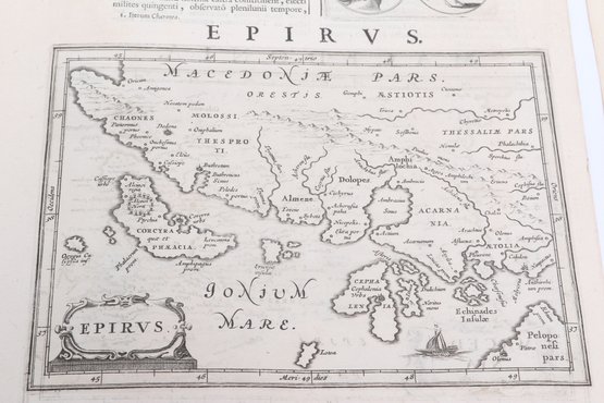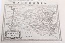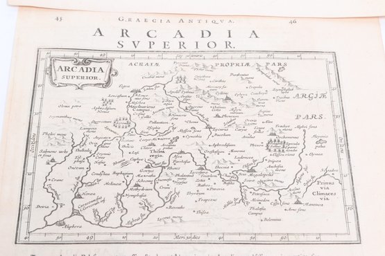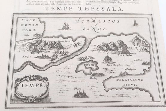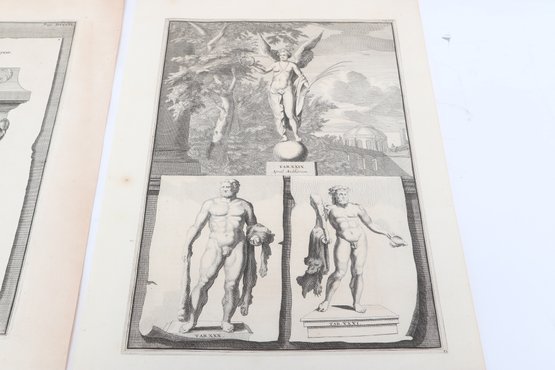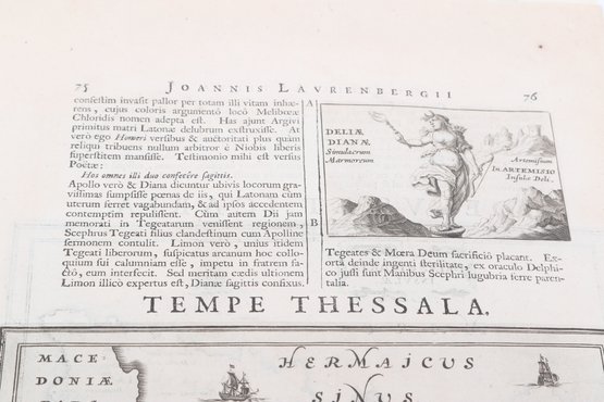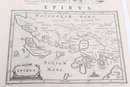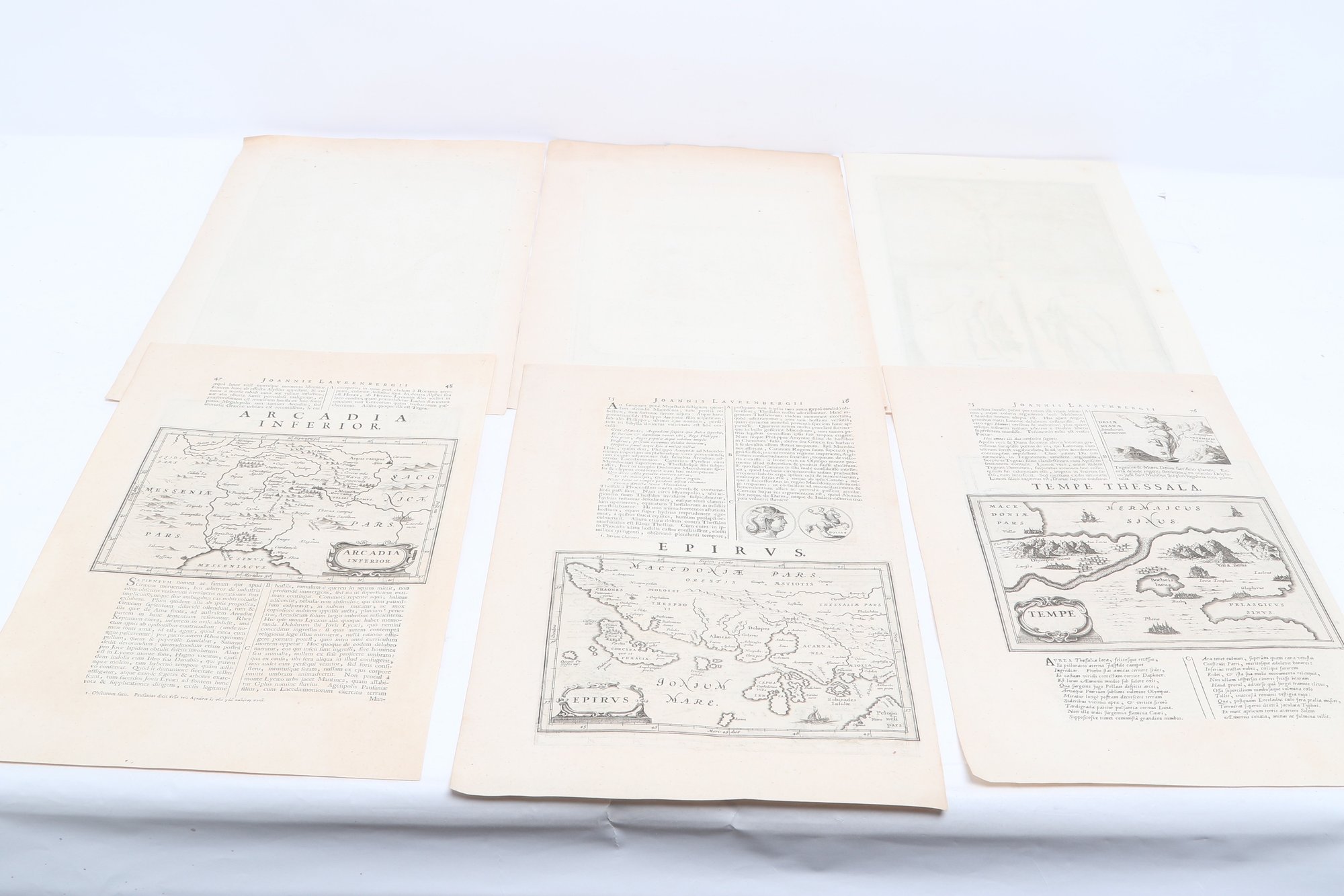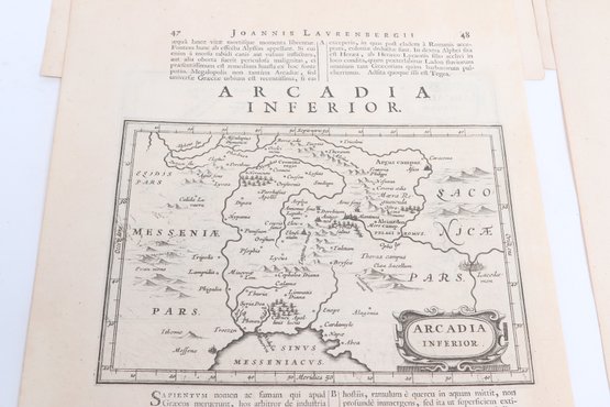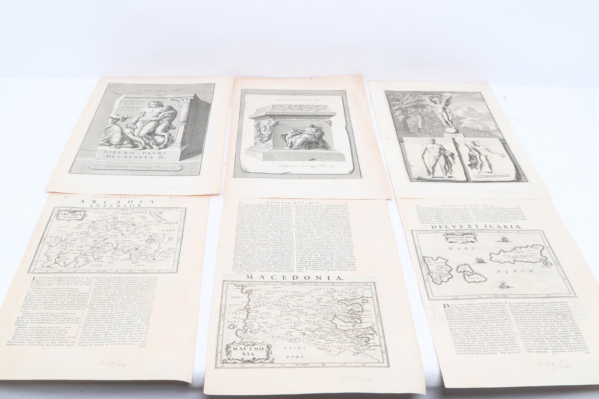 Group of antique engravings and maps featuring classical scenes, sculptures, and detailed cartography including Arcadia, Epirus, and Tempe regions. Finely printed with intricate linework and Latin text, likely from early publications. Condition varies with age-related toning, edge wear, and some imperfections; overall an appealing collection for display or study.
