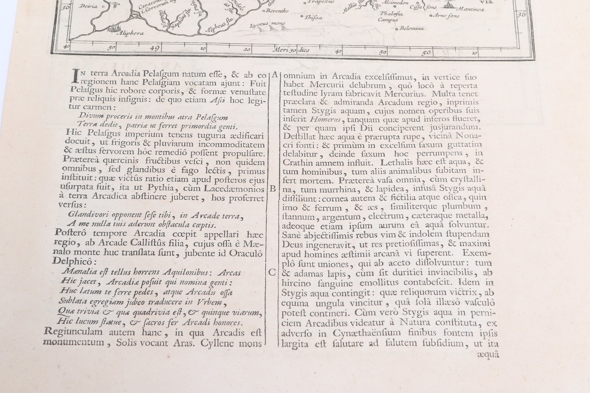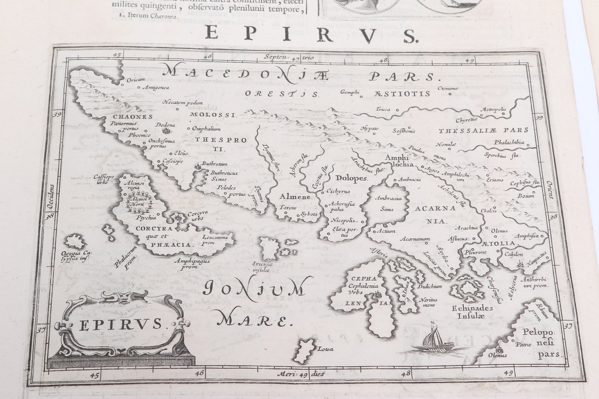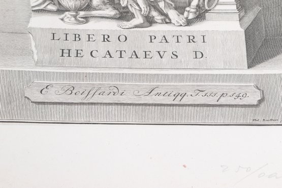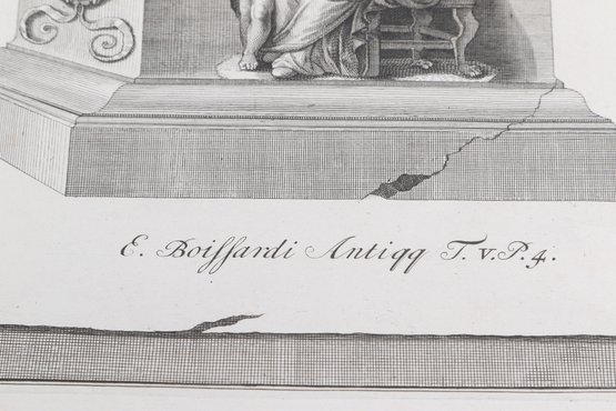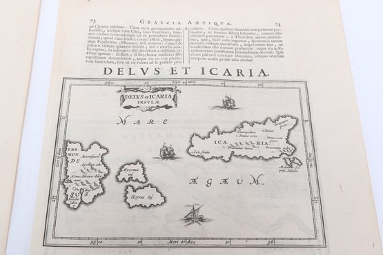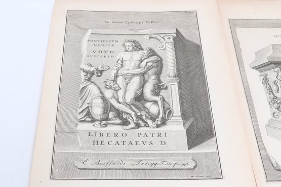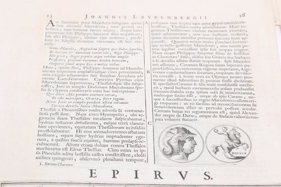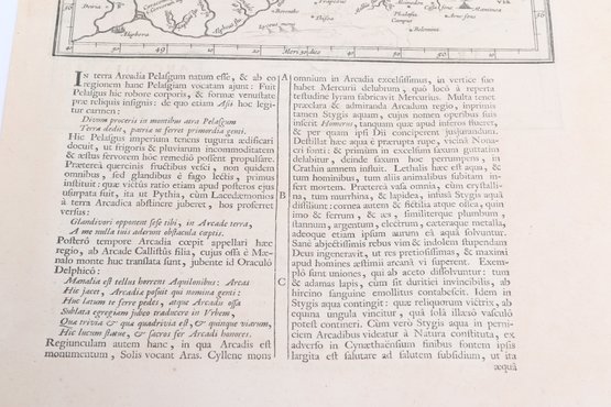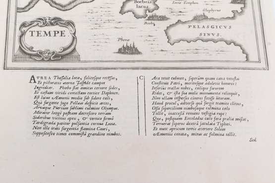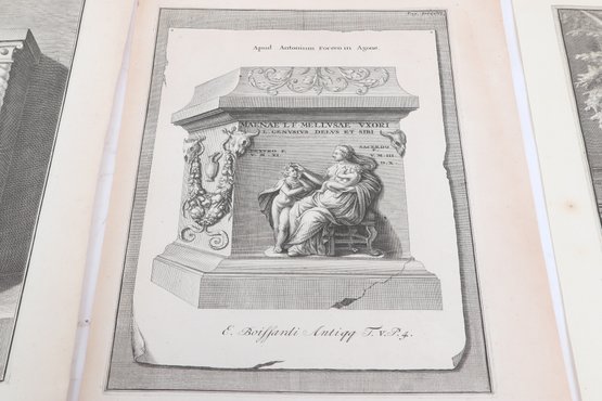 Group of antique engravings and maps featuring classical scenes, sculptures, and detailed cartography including Arcadia, Epirus, and Tempe regions. Finely printed with intricate linework and Latin text, likely from early publications. Condition varies with age-related toning, edge wear, and some imperfections; overall an appealing collection for display or study.