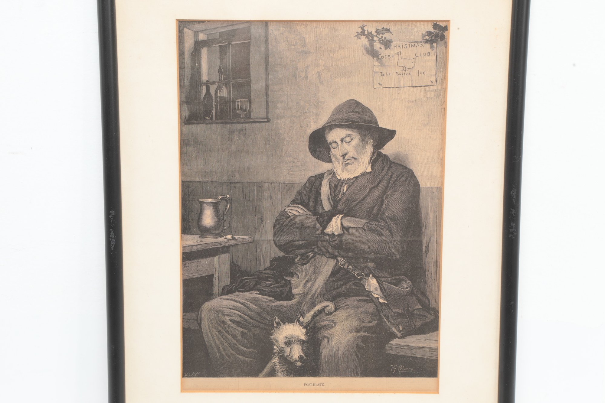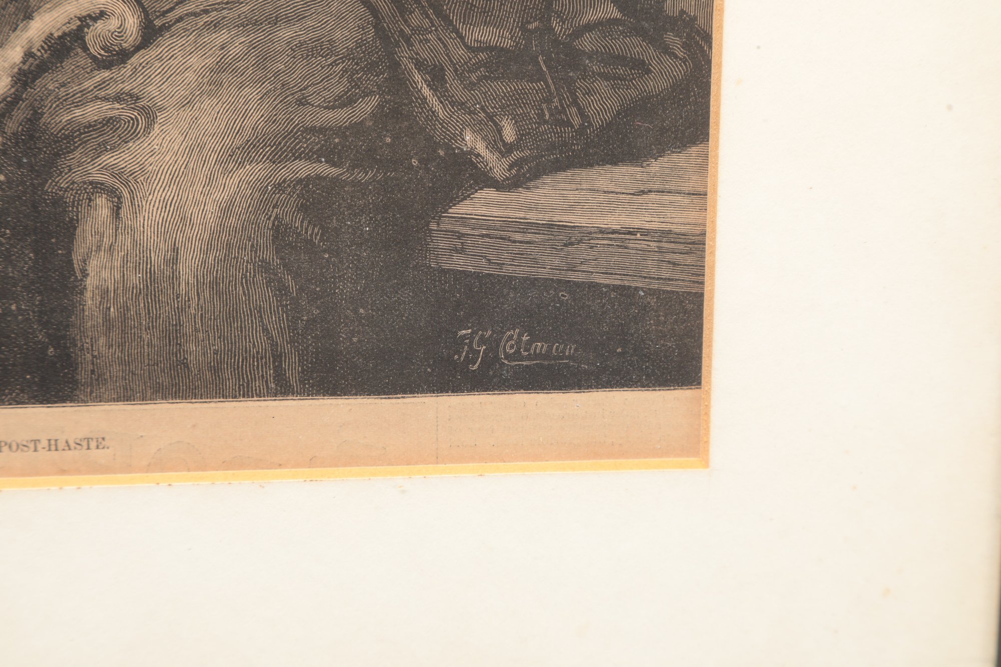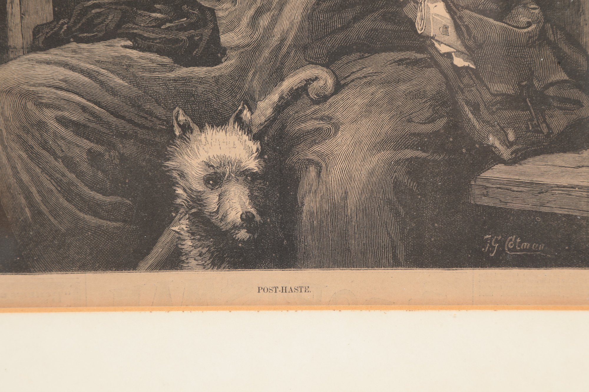 Antique Framed Wood Cut Engraving Print Of Post-Haste. Measures approximately 13" x 17.5". See pictures carefully for details on size and condition of frame.