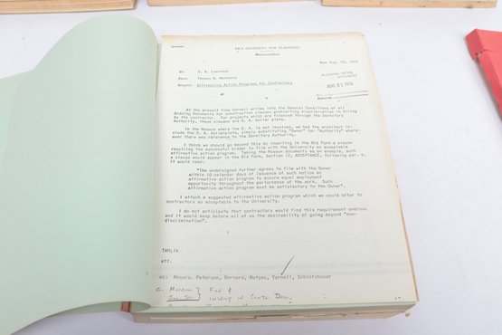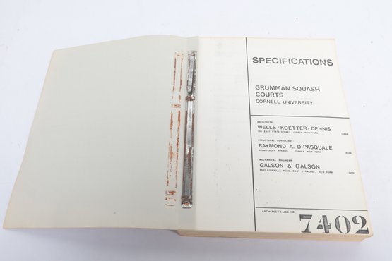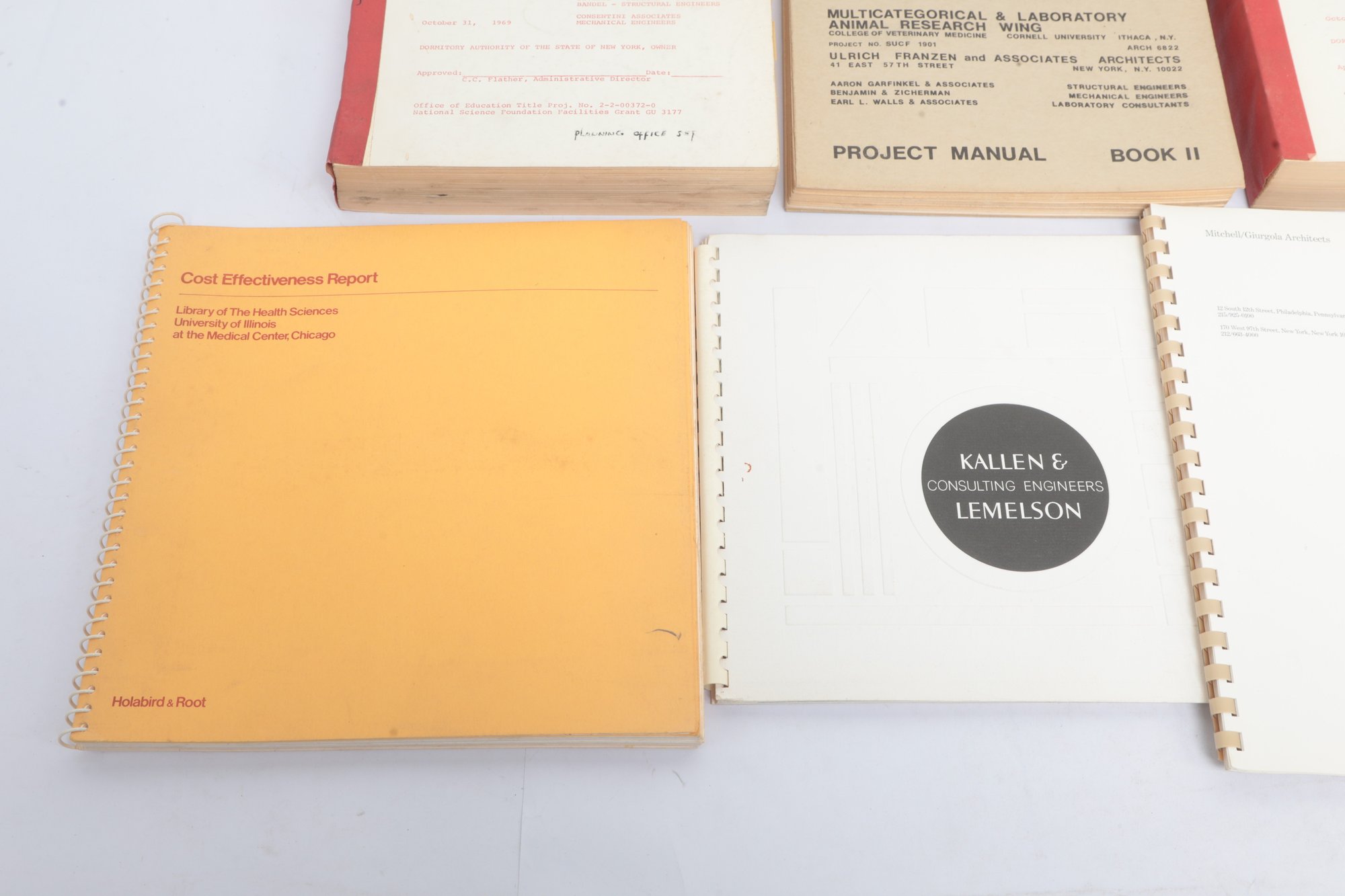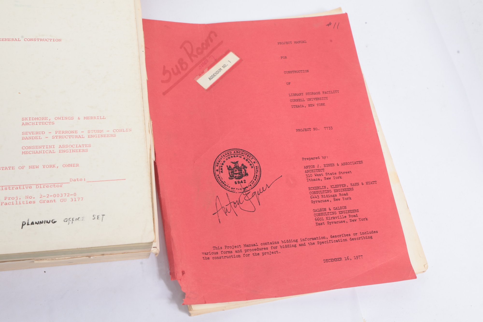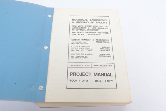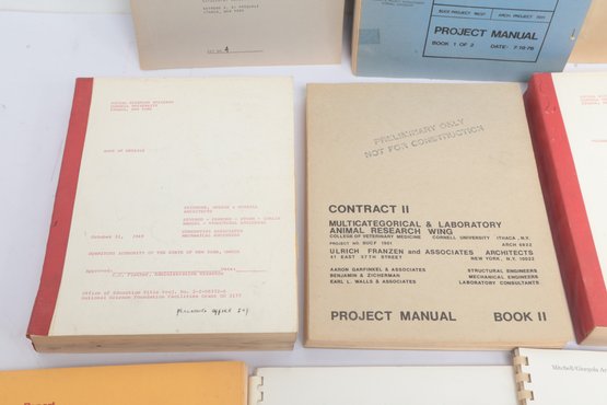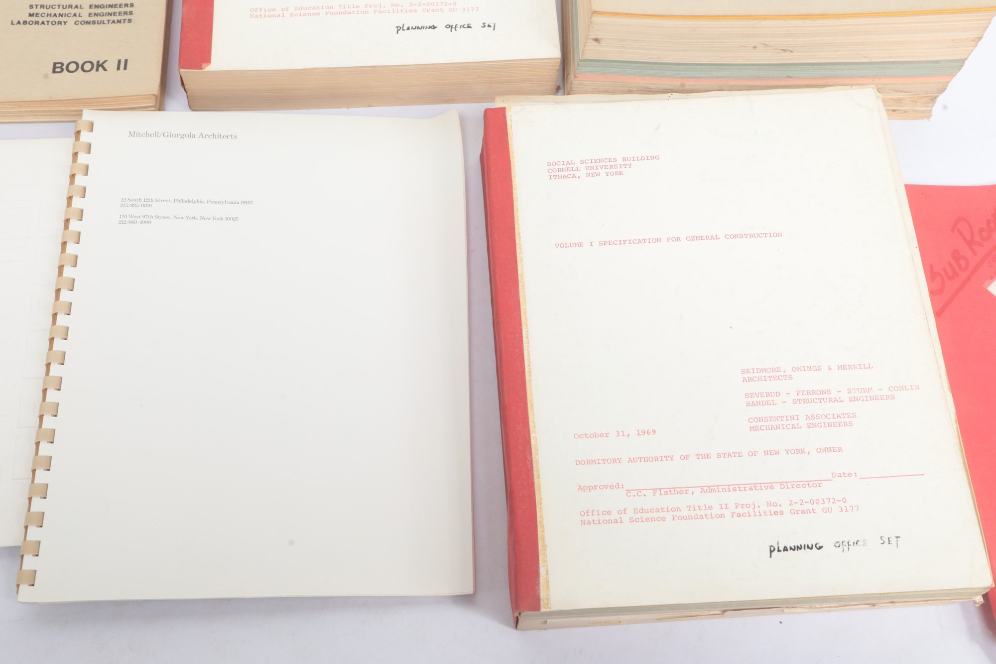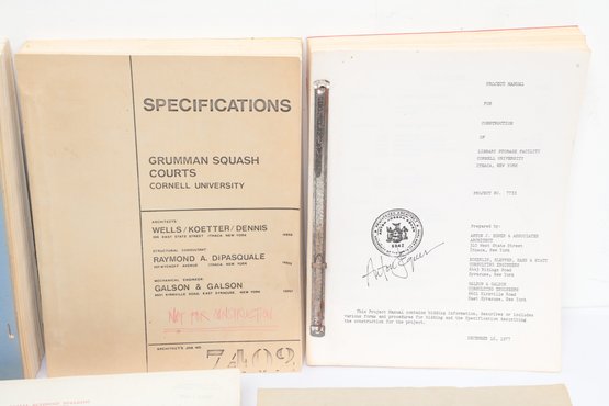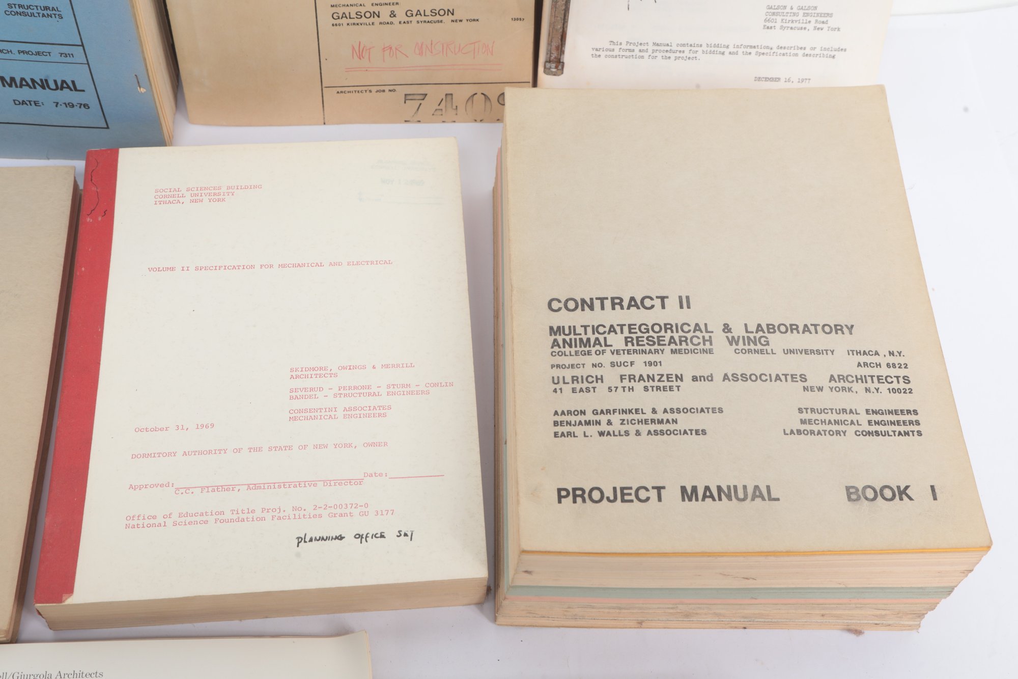 Mixed box of Cornell University architectural and construction project manuals, specifications, and proposal documents from campus capital projects files, circa late 1960s–1970s.