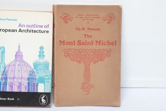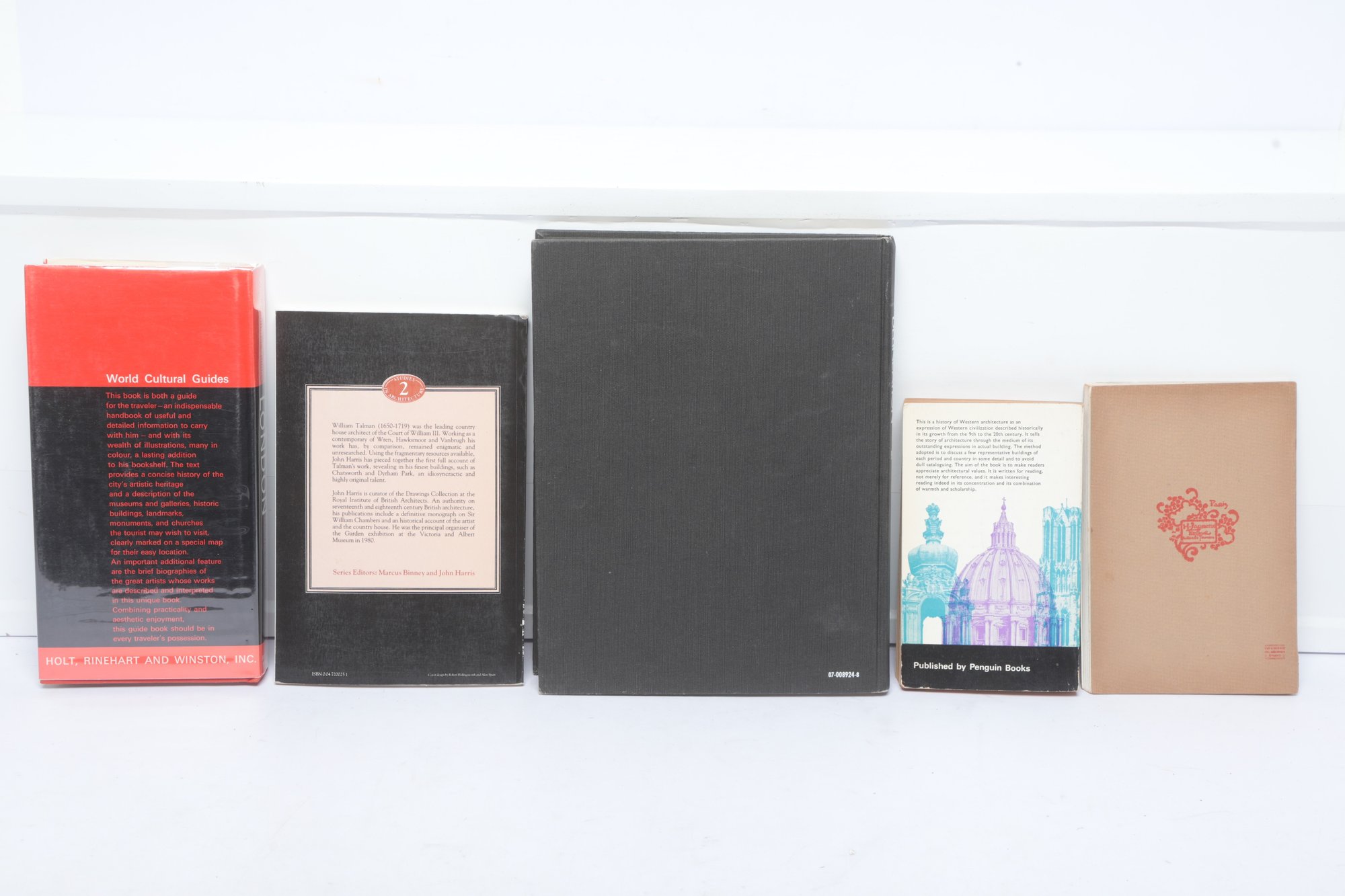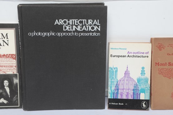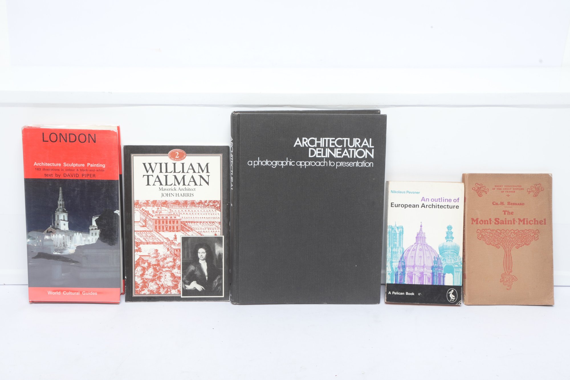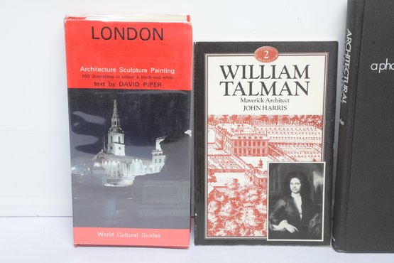 Five architectural history volumes including Piper’s "London," "William Talman: Maverick Architect" by John Harris, and Pevsner’s "An Outline of European Architecture." The lot features diverse formats including a large-scale "Architectural Delineation" hardcover and a Pelican paperback. Bindings show moderate shelf wear and some edge chipping to dust jackets.