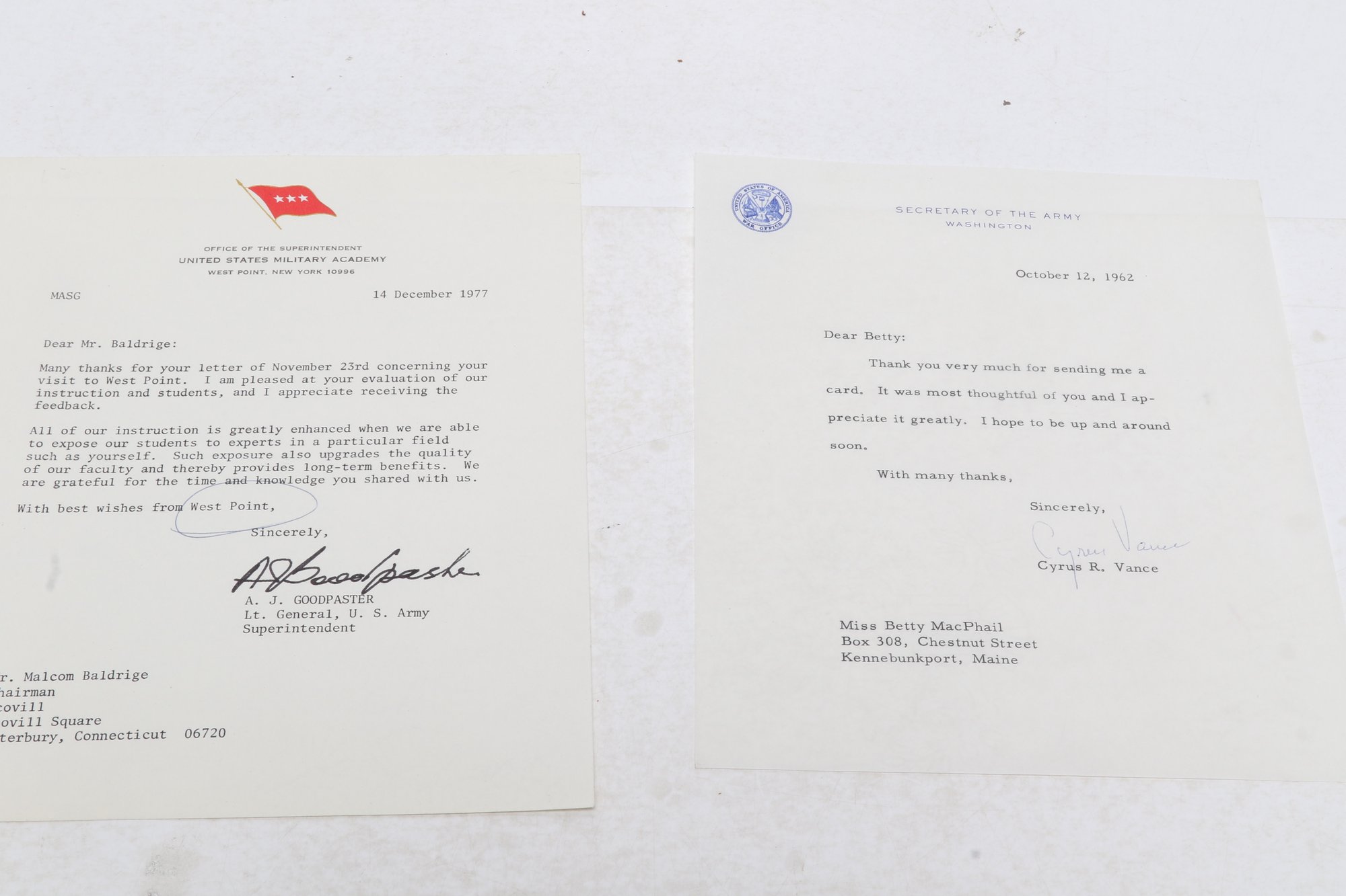 2 typed letters signed— Cyrus Roberts Vance (March 27, 1917 – January 12, 2002) was an American lawyer and United States Secretary of State under President Jimmy Carter from 1977 to 1980. Prior to serving in that position, he was the United States Deputy Secretary of Defense in the Johnson administration. During the Kennedy administration he was Secretary of the Army and General Counsel of the Department of Defense. Wikipedia TOGETHER WITH 1977 letter to Malcolm Baldridge, Scovill Chairman.