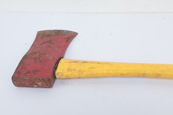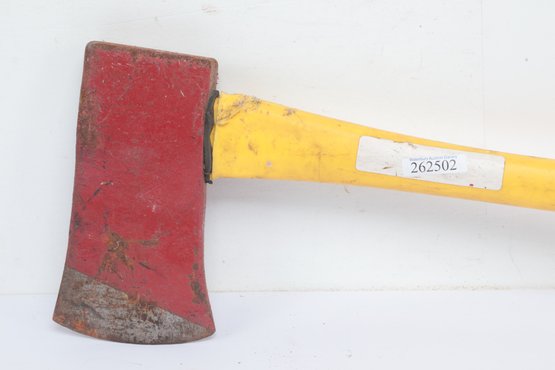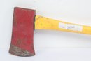 Axe with yellow plastic handle. Has wear from use. See pictures carefully for details on size and condition.