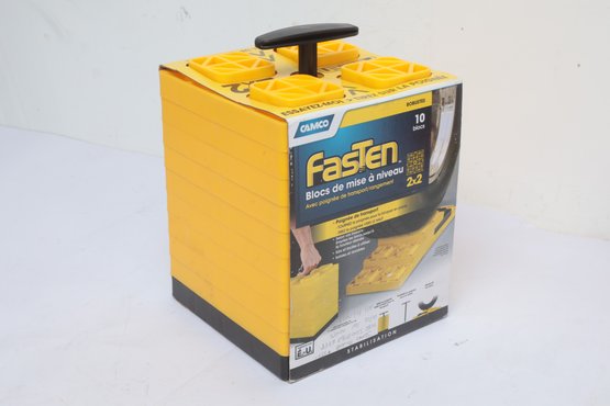 BAL X-Chock Tire Locking Chocks Double Pack #28012 And Camco FasTen Leveling Blocks. See pictures carefully for details. Chocks appear unused in open box. Leveling blocks are new.