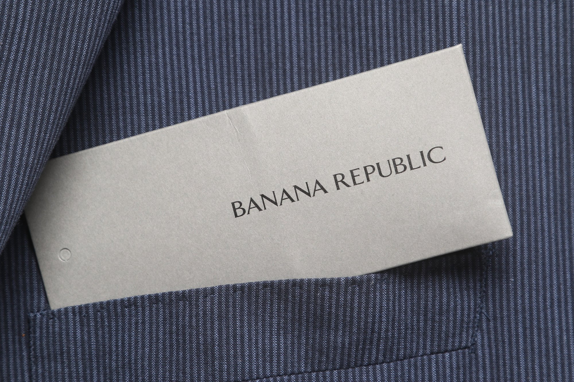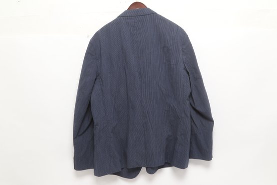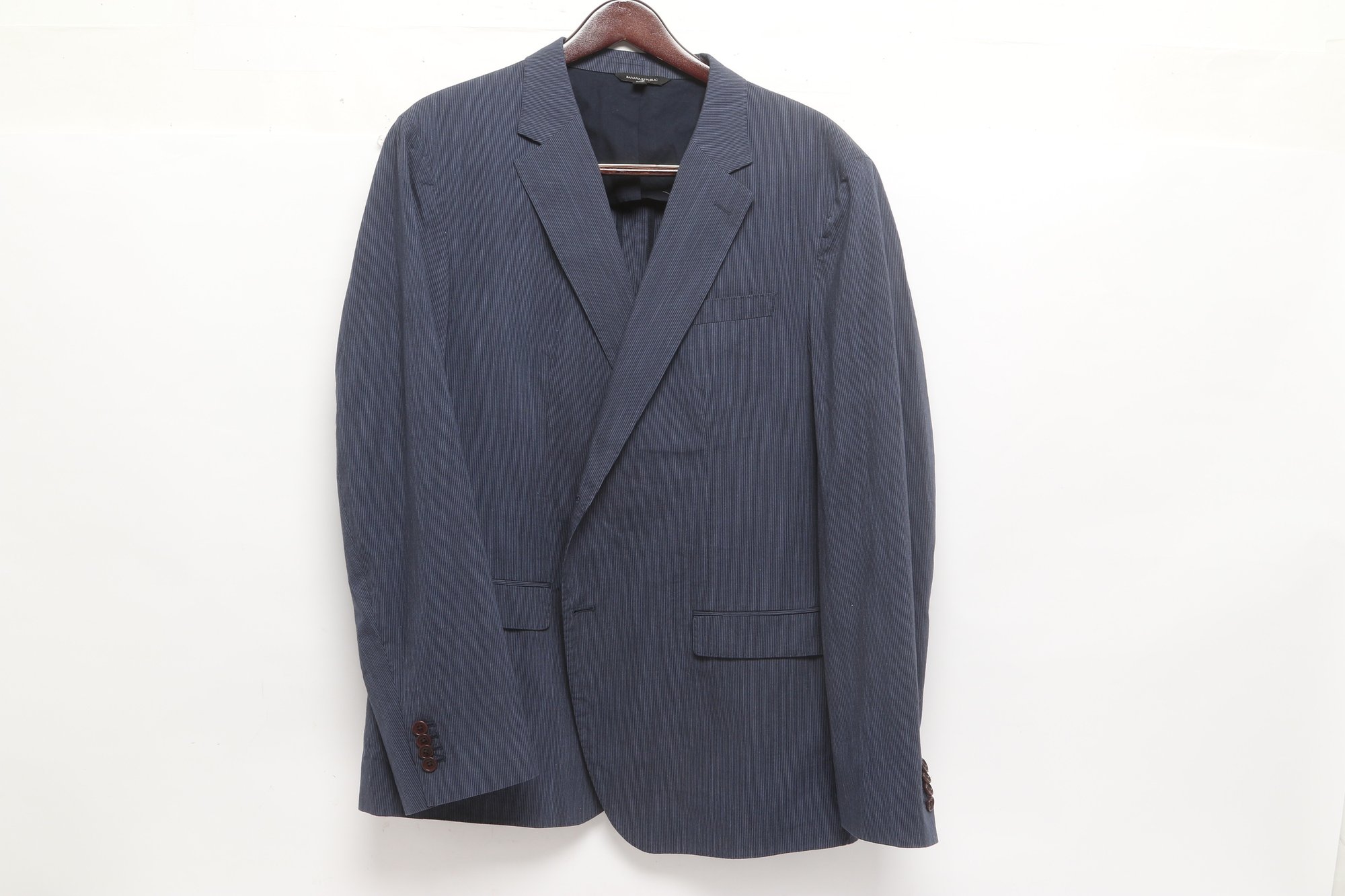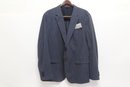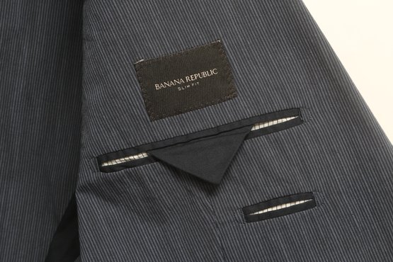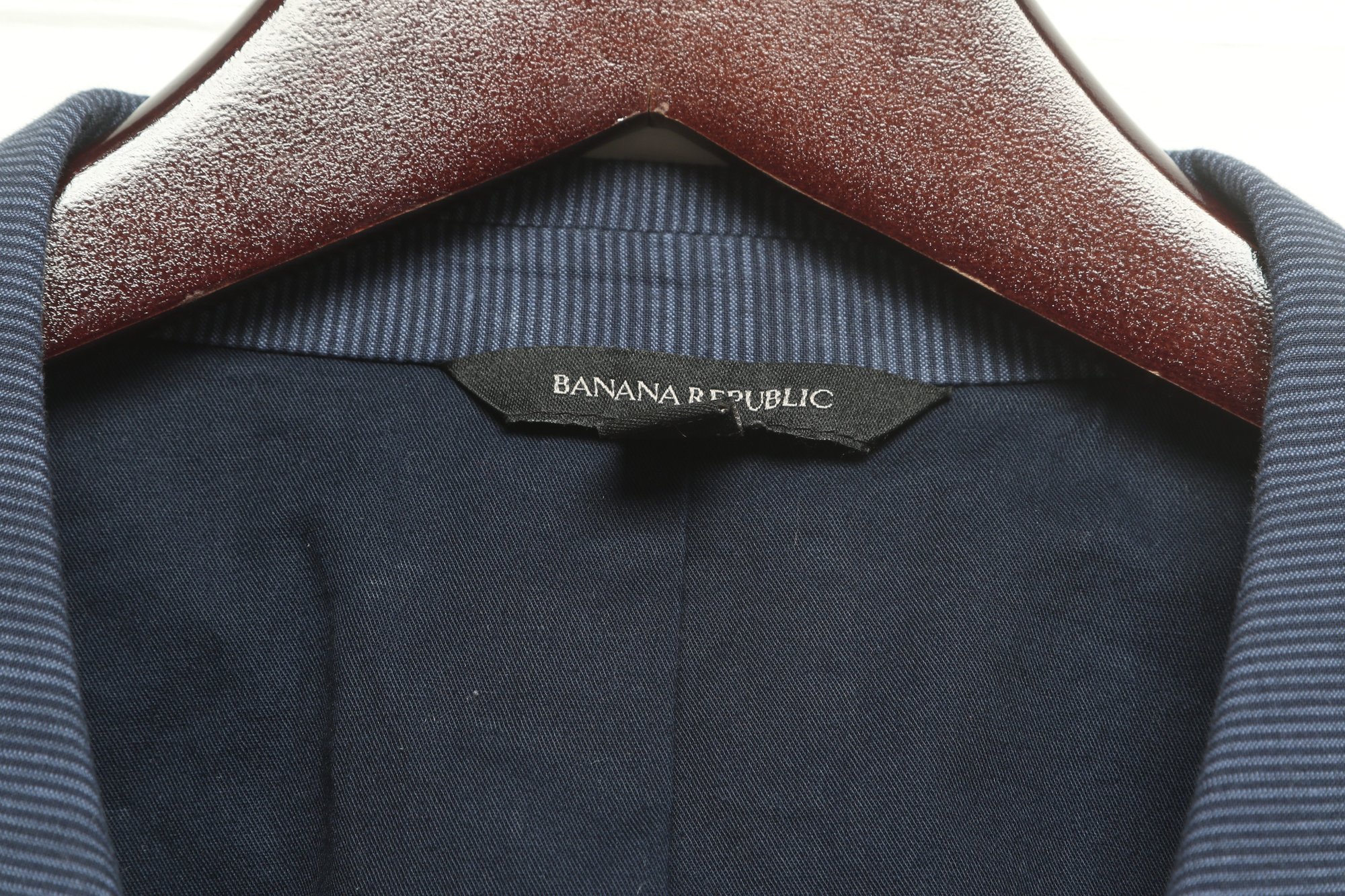 Banana Republic men’s suit jacket in a refined blue pinstripe pattern, size 50 Regular. Features a classic tailored fit with button front, flap pockets, and a fully lined interior. New with original tag attached, offering a polished look for business or formal wear.