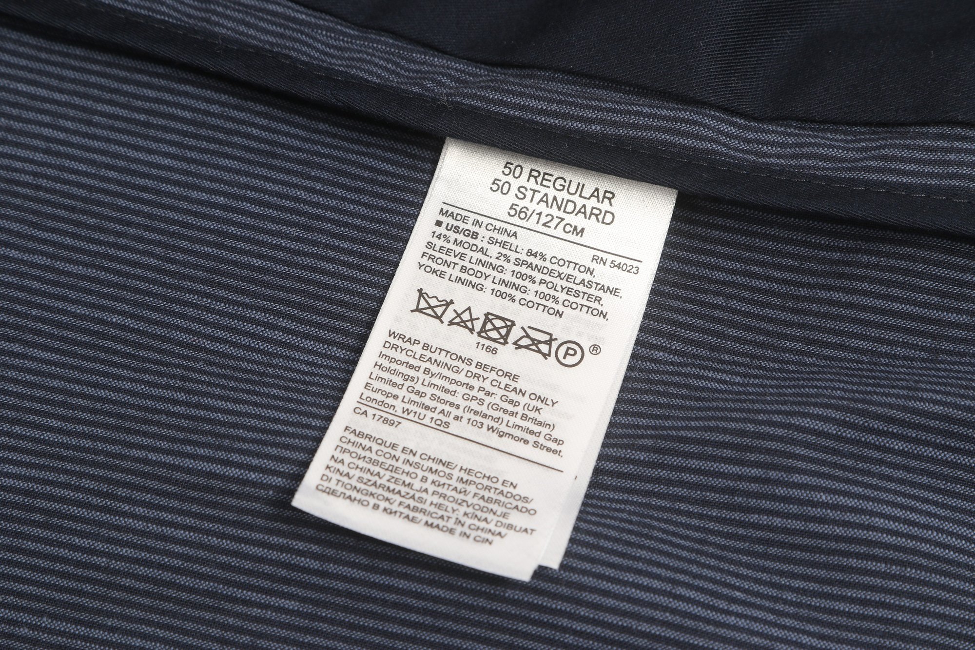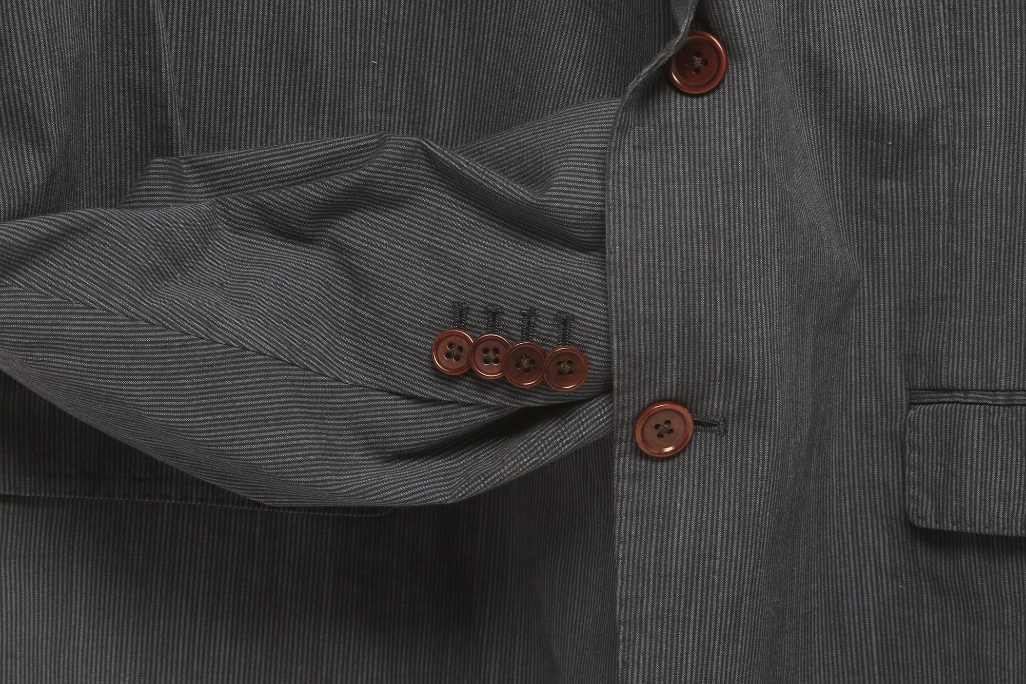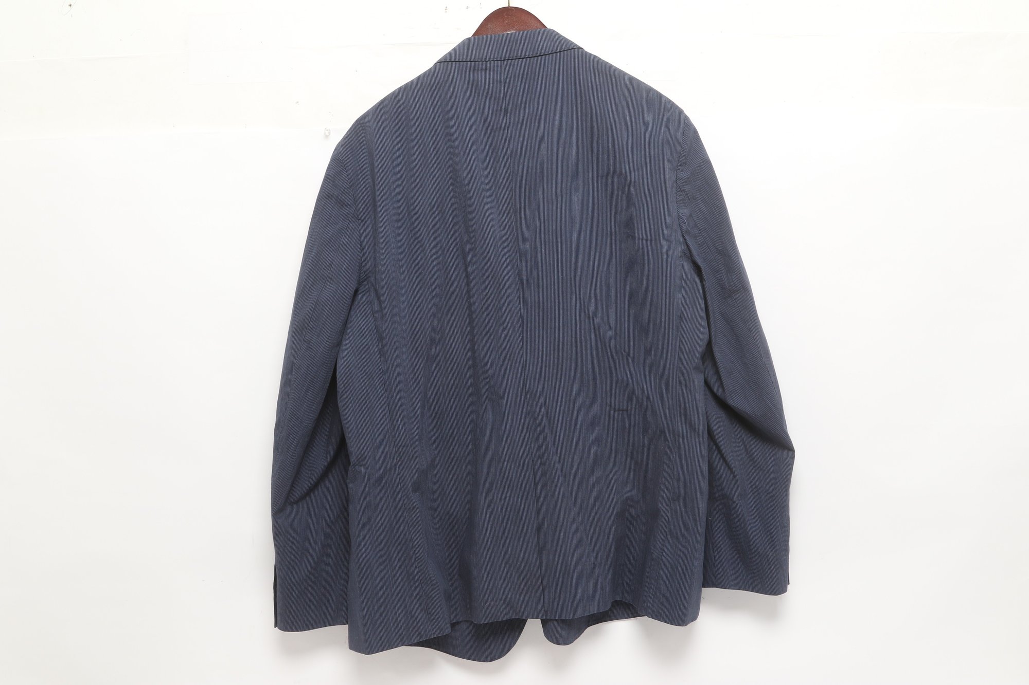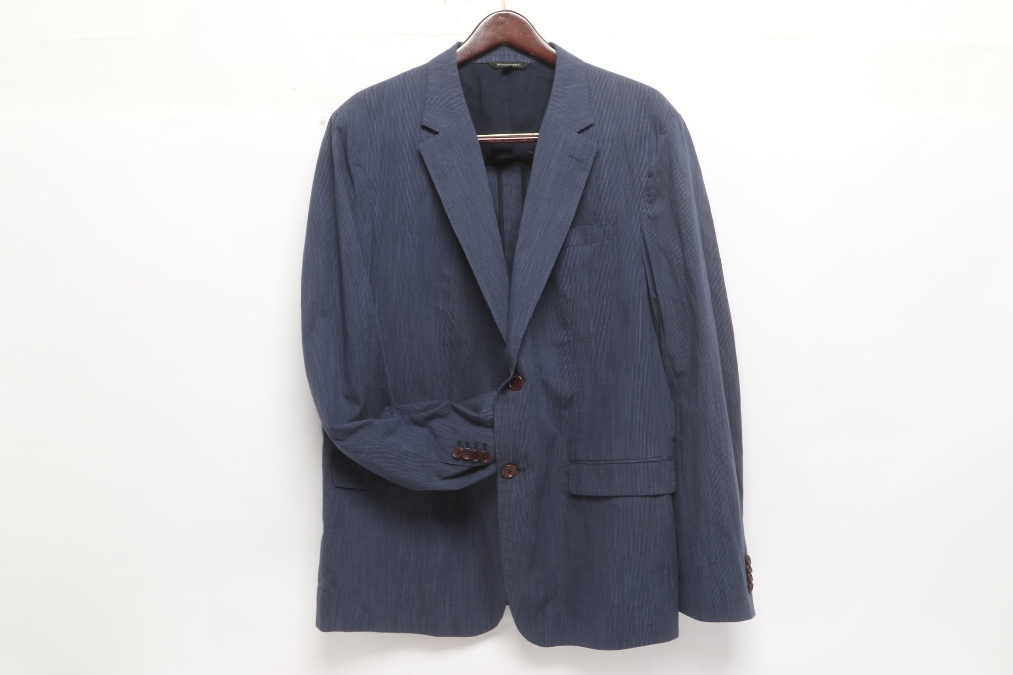 Banana Republic men’s suit jacket in a refined blue pinstripe pattern, size 50 Regular. Features a classic tailored fit with button front, flap pockets, and a fully lined interior. New with original tag attached, offering a polished look for business or formal wear.