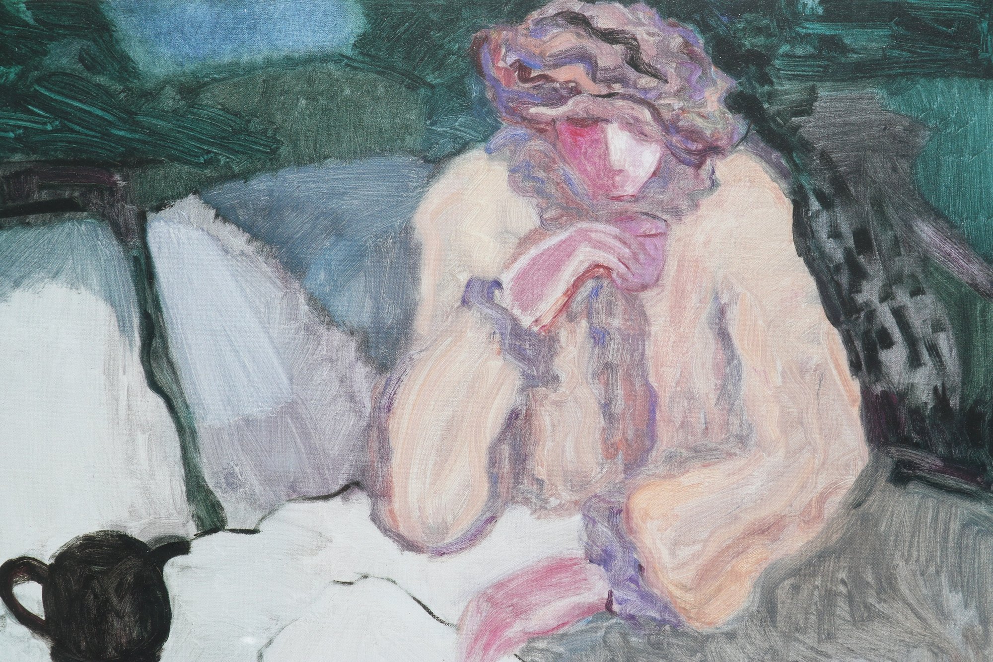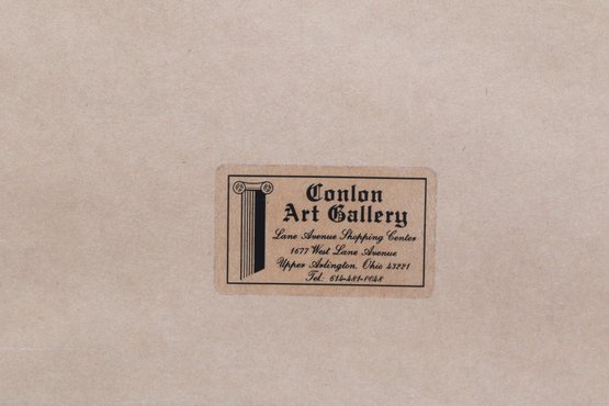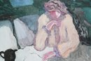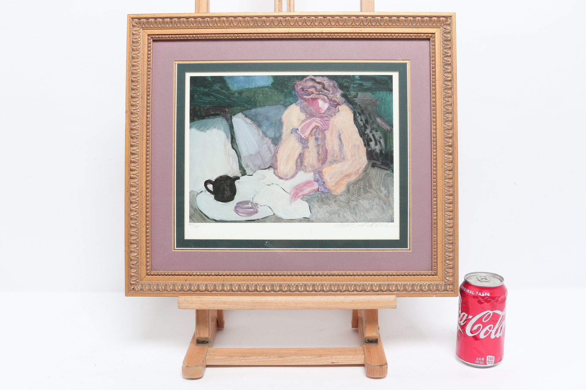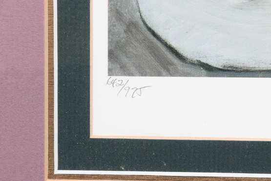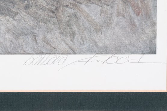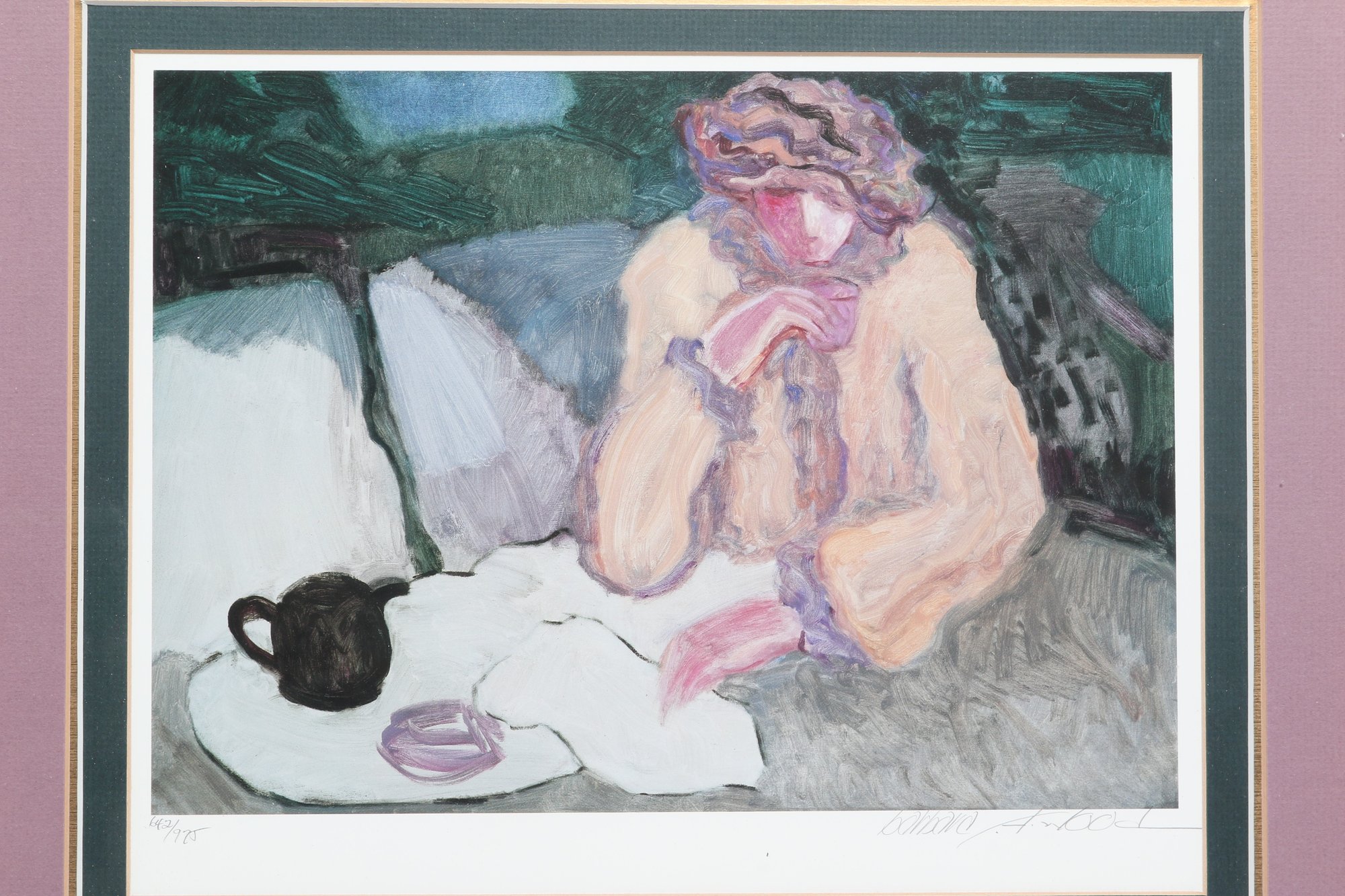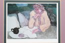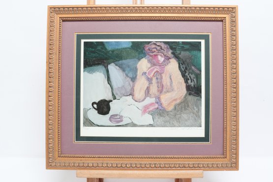 Artist signed limited edition lithograph by Barbara A. Wood depicting a seated figure at a tea setting in a softly rendered interior scene. Features muted pastel tones and expressive brushwork, presented in a decorative frame with matting. Measures approximately 17.75" x 15.25". Pre-owned, overall in good condition.