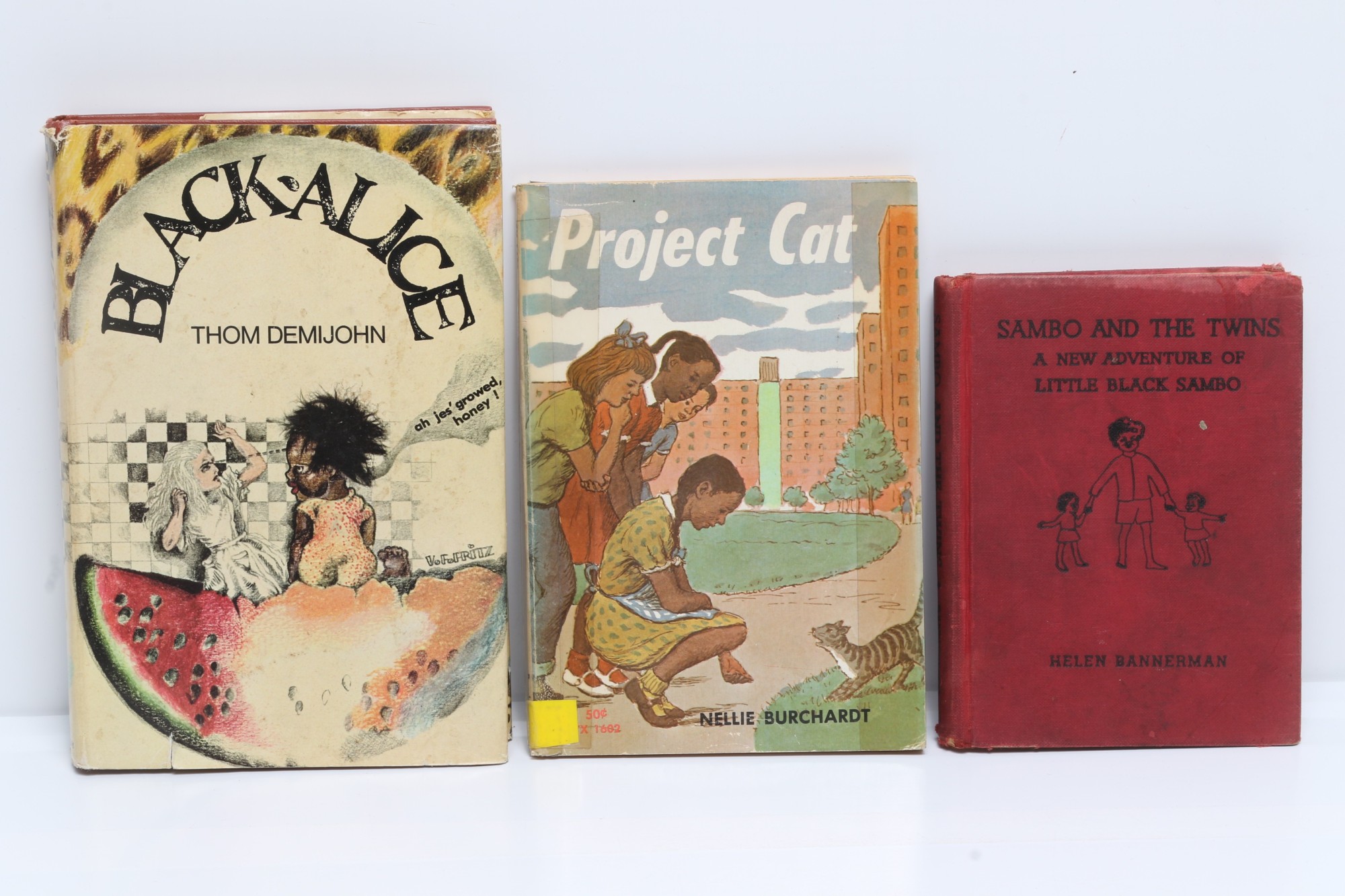 Lot of three books: Black Alice by Thom Demijohn (Doubleday 1968, first edition, jacket rubbed and chipped); Project Cat by Nellie Burchardt (Scholastic 1969, first printing, tape reinforced); and Sambo and the Twins by Helen Bannerman (Frederick A. Stokes 1936, red pictorial cloth, spine ends frayed).