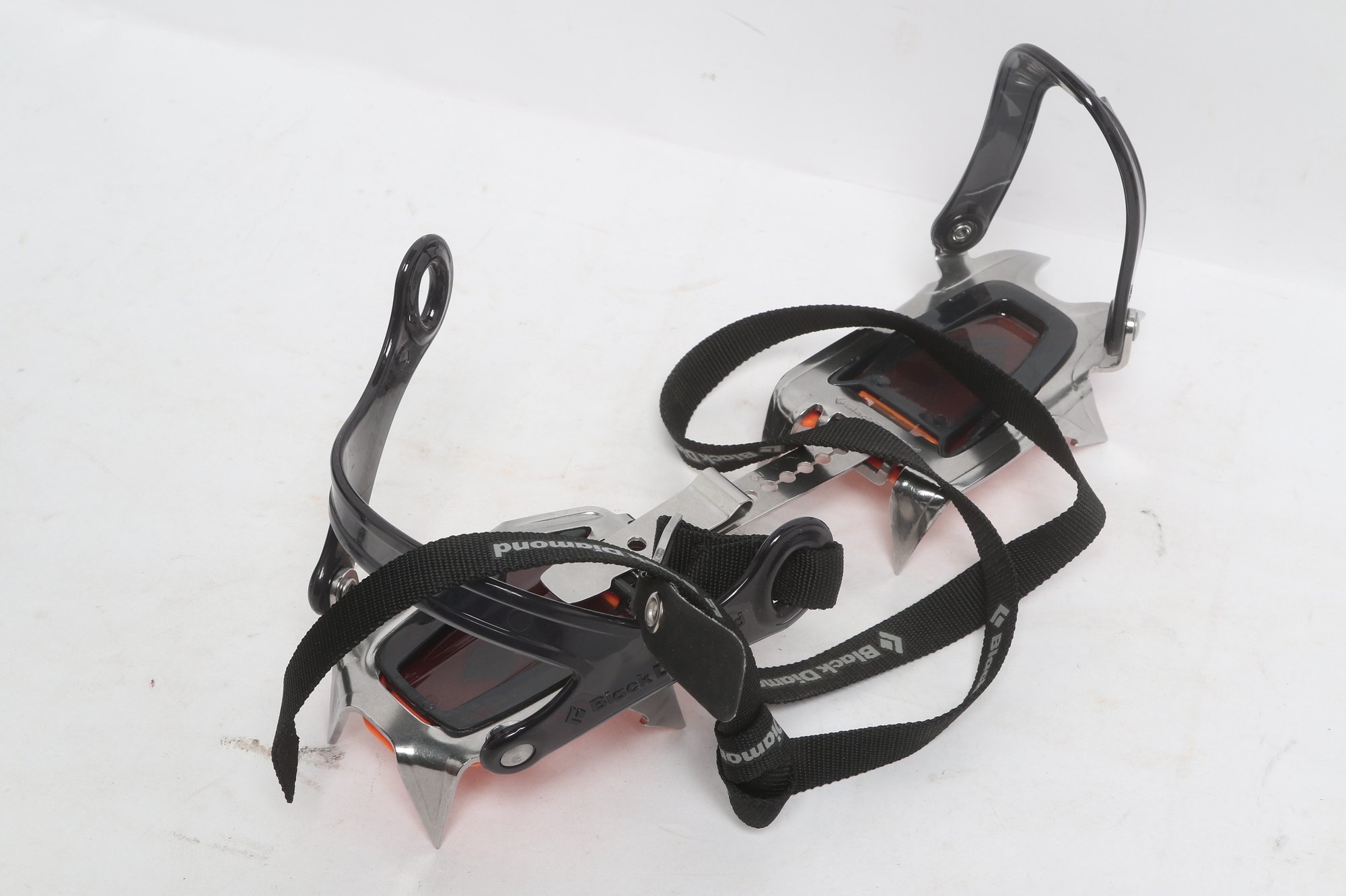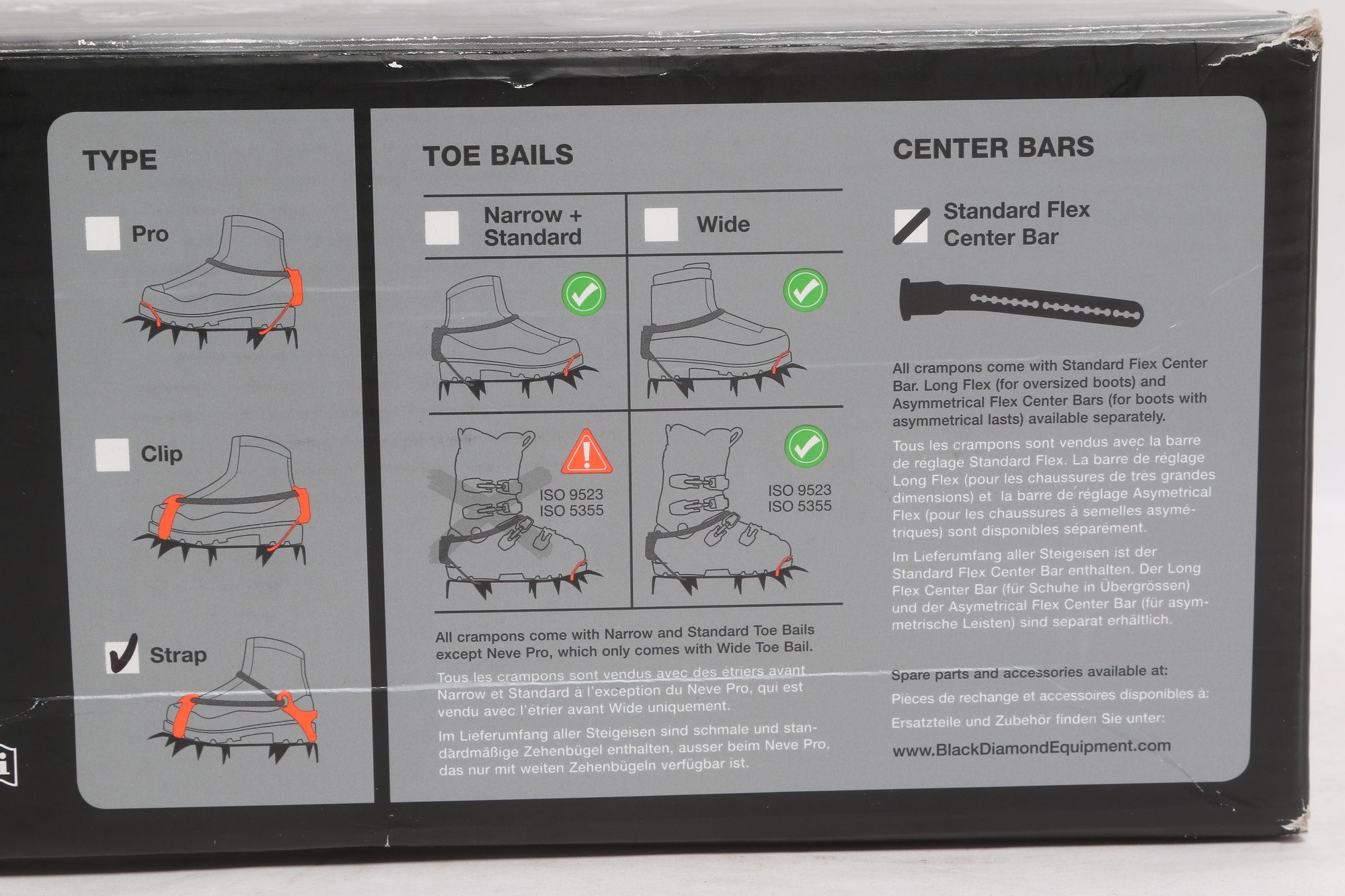 Black Diamond Contact Strap crampons designed for mountaineering and ice traction, featuring durable steel construction with adjustable strap bindings. Includes original box and appears new and unused. Ideal for hiking, climbing, and winter alpine conditions.