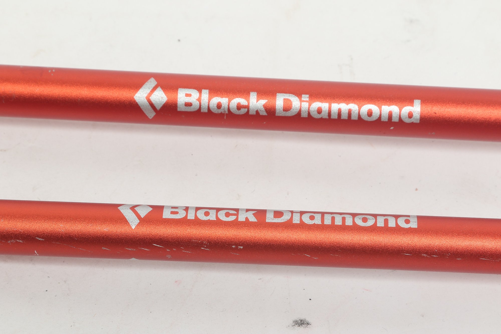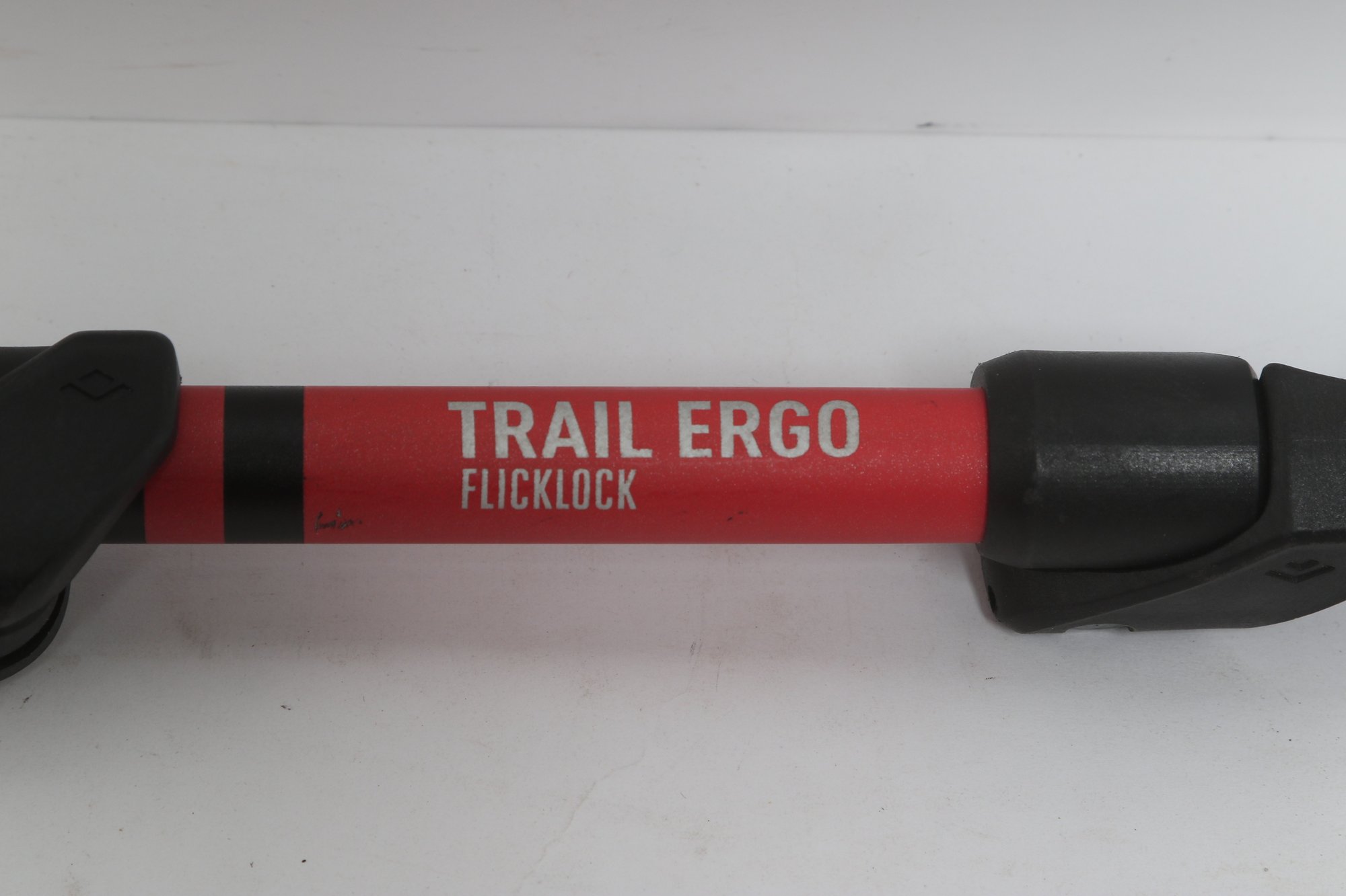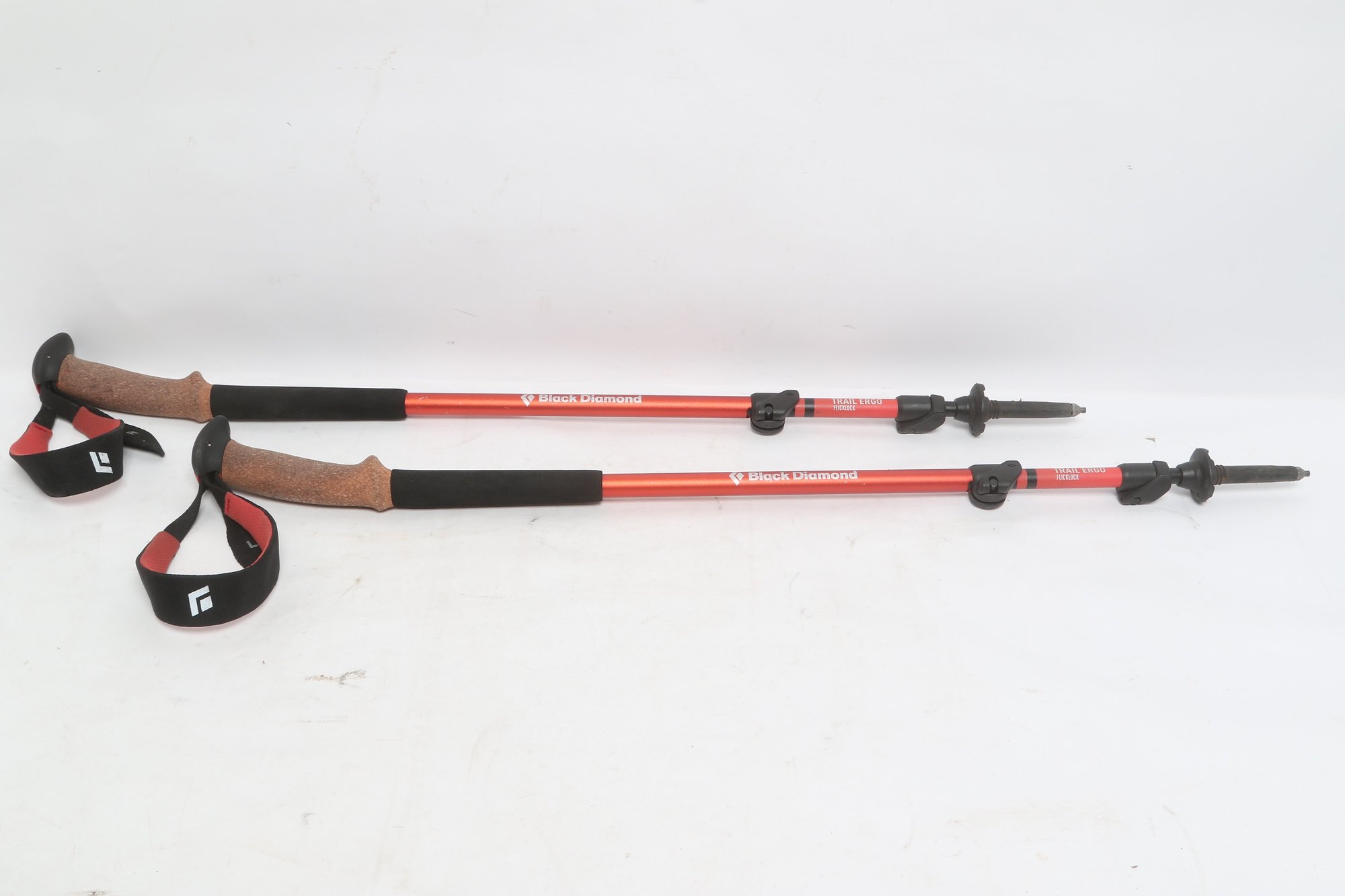 Pair of Black Diamond Trail Ergo trekking poles featuring durable aluminum construction with ergonomic cork handles and FlickLock adjustability. Designed for hiking and outdoor use with adjustable length and sturdy tips. Pre-owned with light wear from use, overall in good condition.
