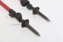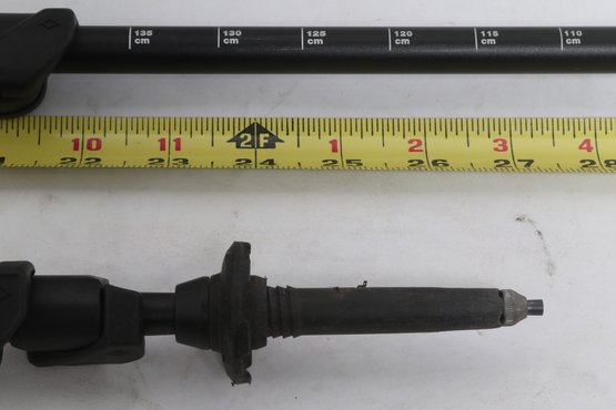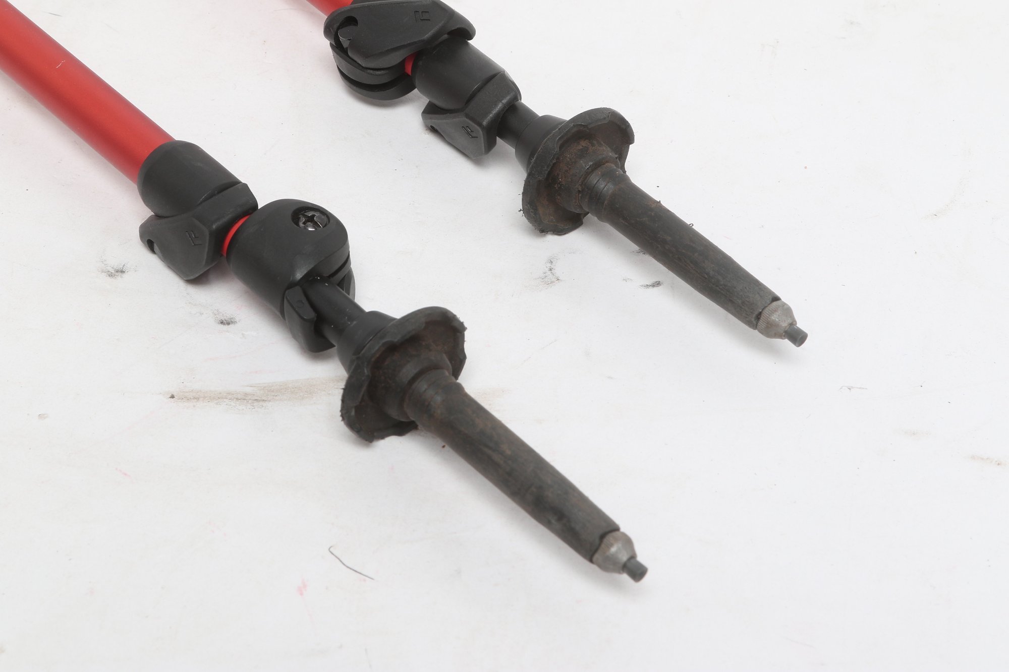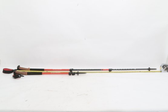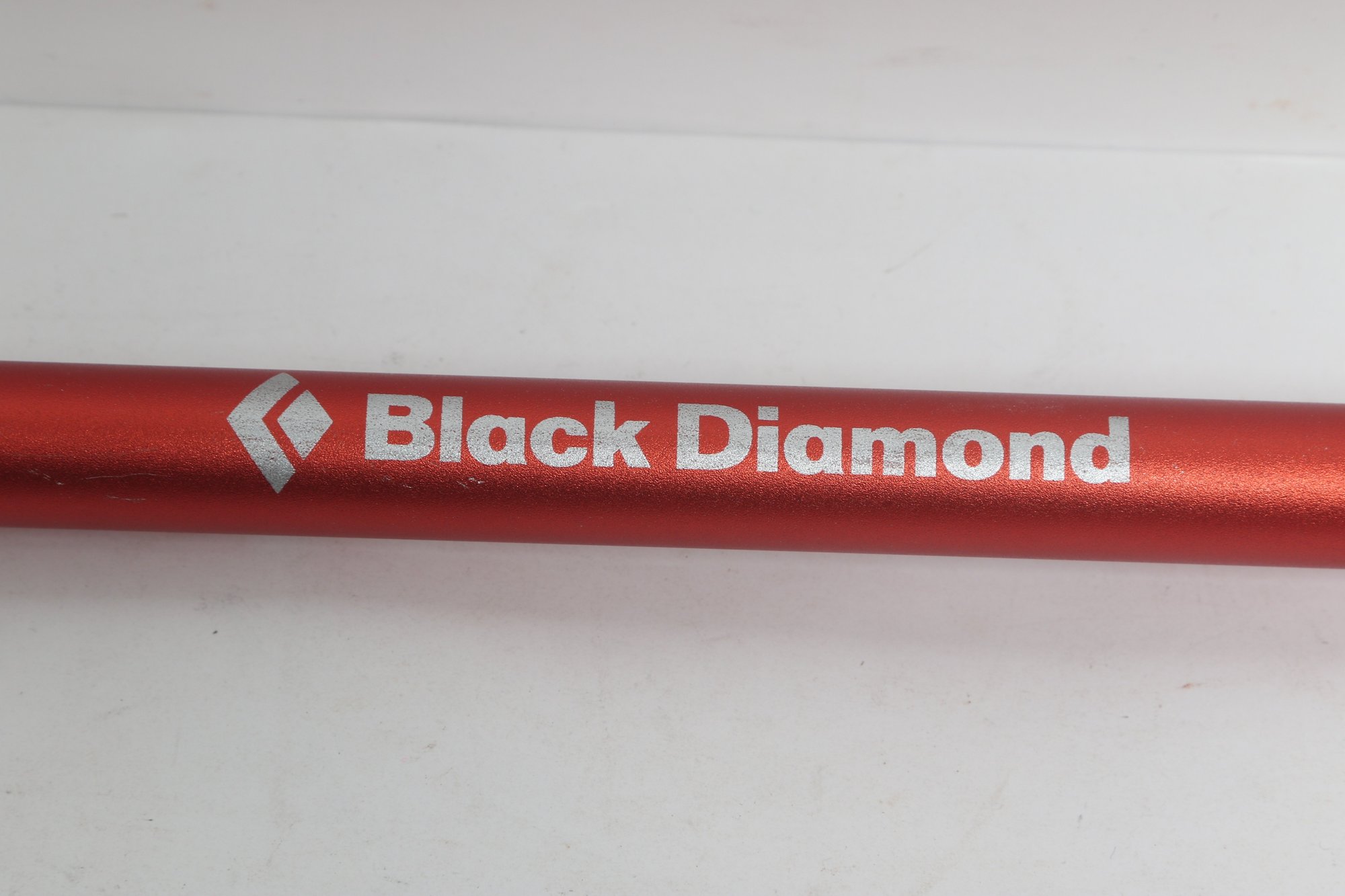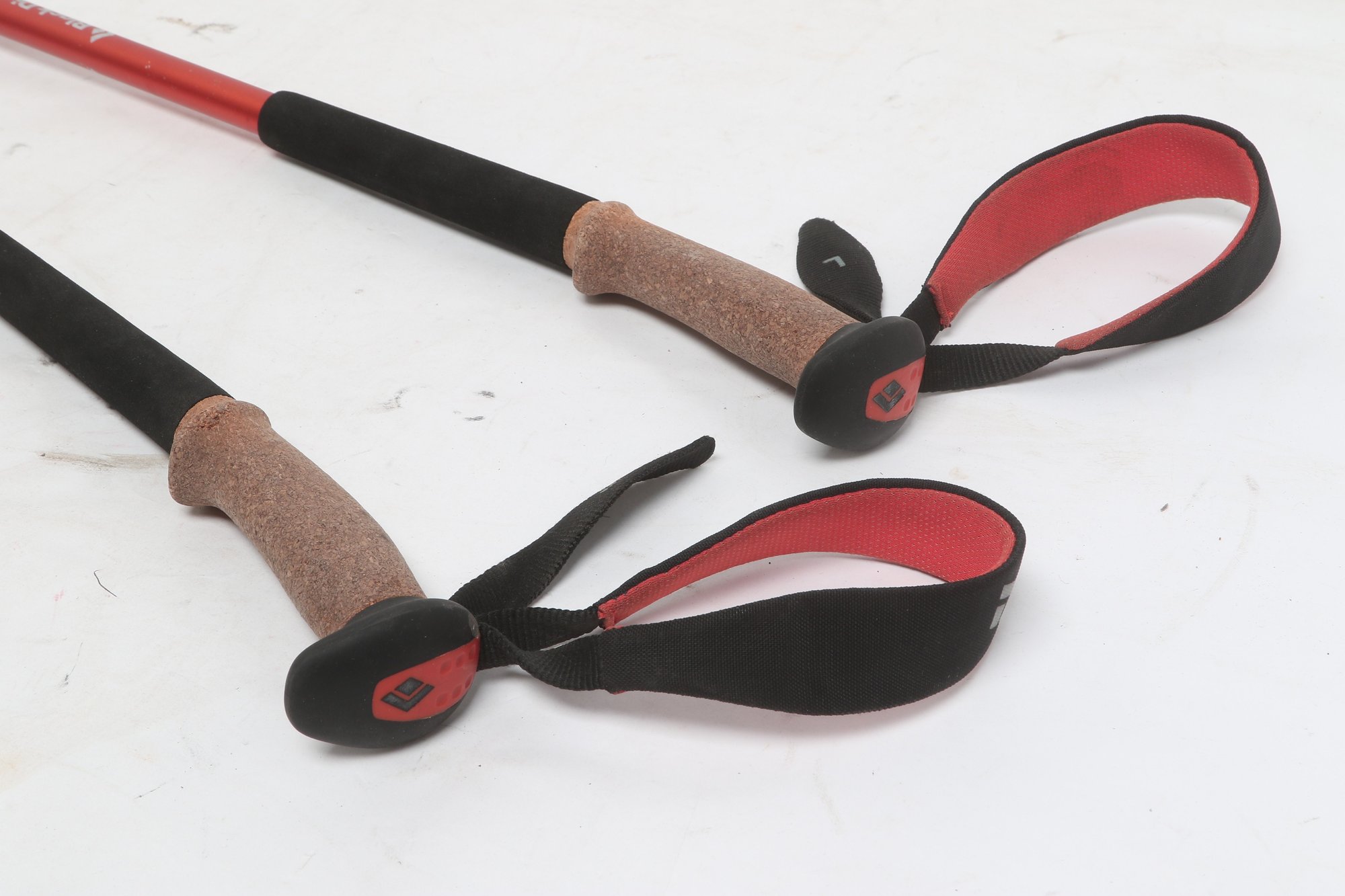 Pair of Black Diamond Trail Ergo trekking poles featuring durable aluminum construction with ergonomic cork handles and FlickLock adjustability. Designed for hiking and outdoor use with adjustable length and sturdy tips. Pre-owned with light wear from use, overall in good condition.