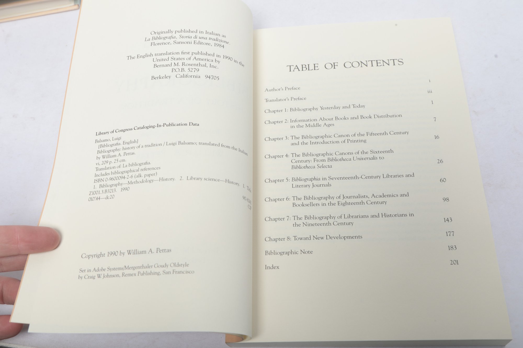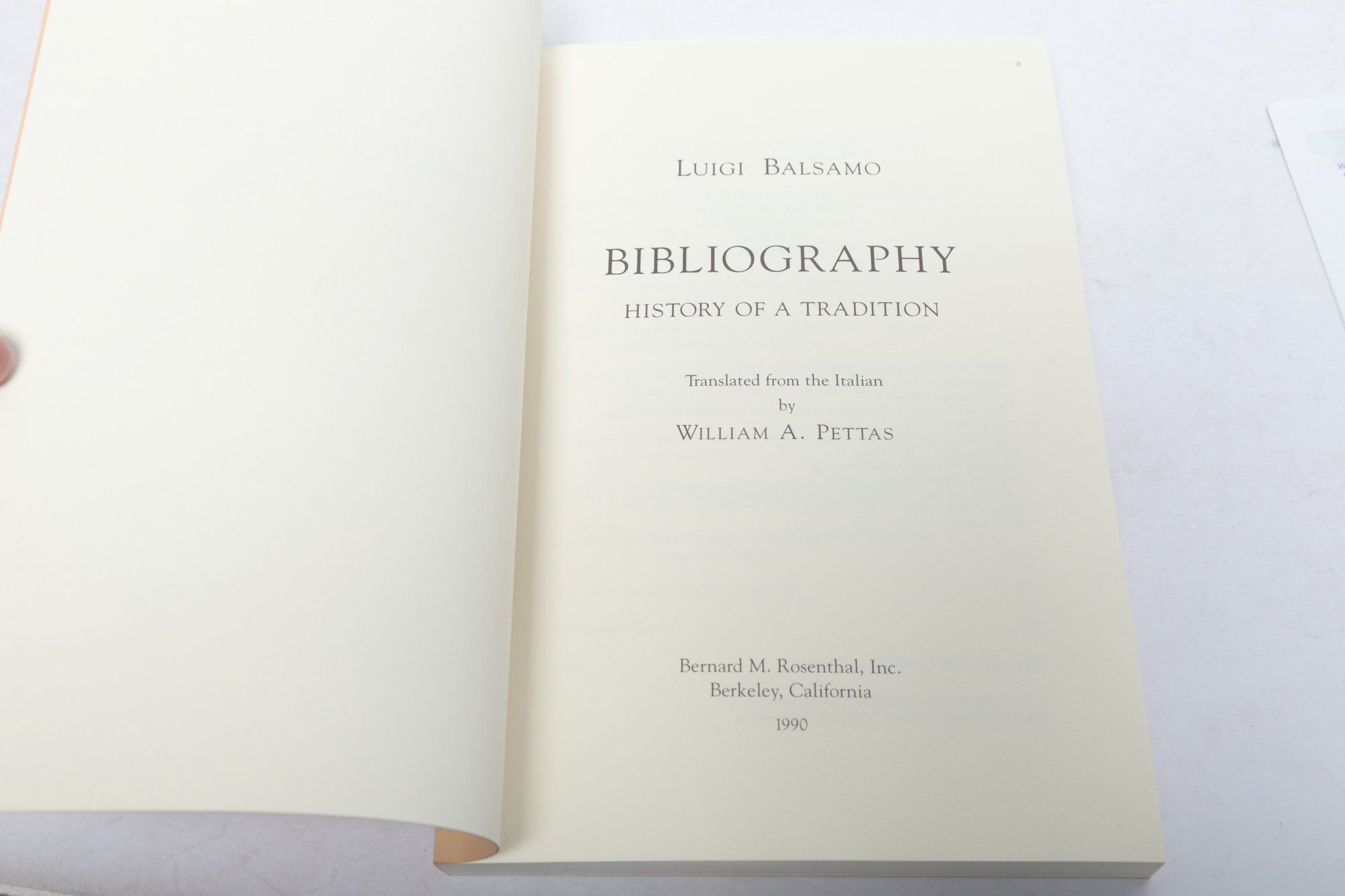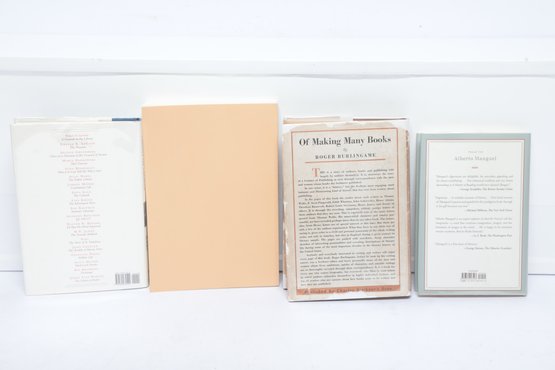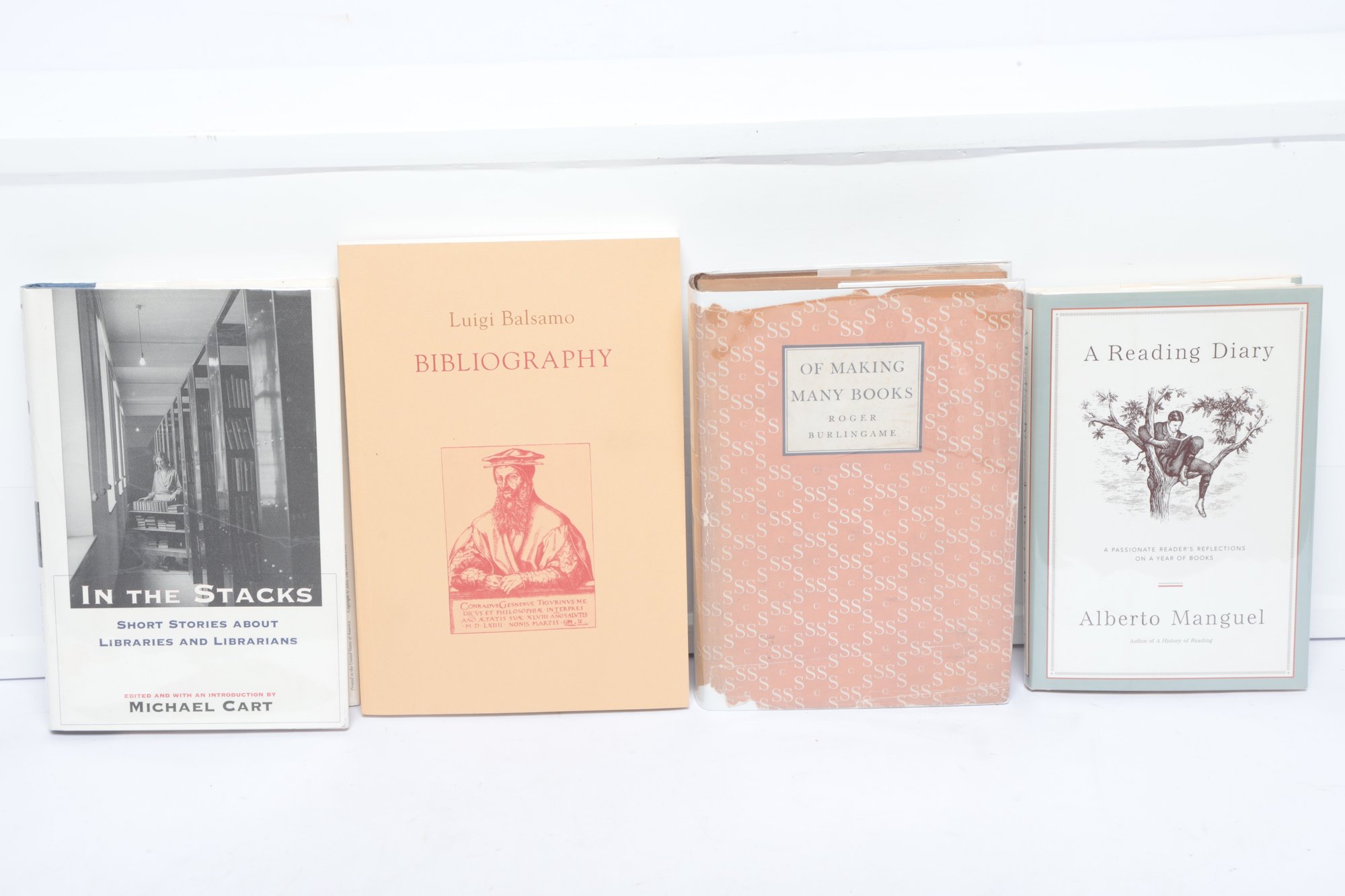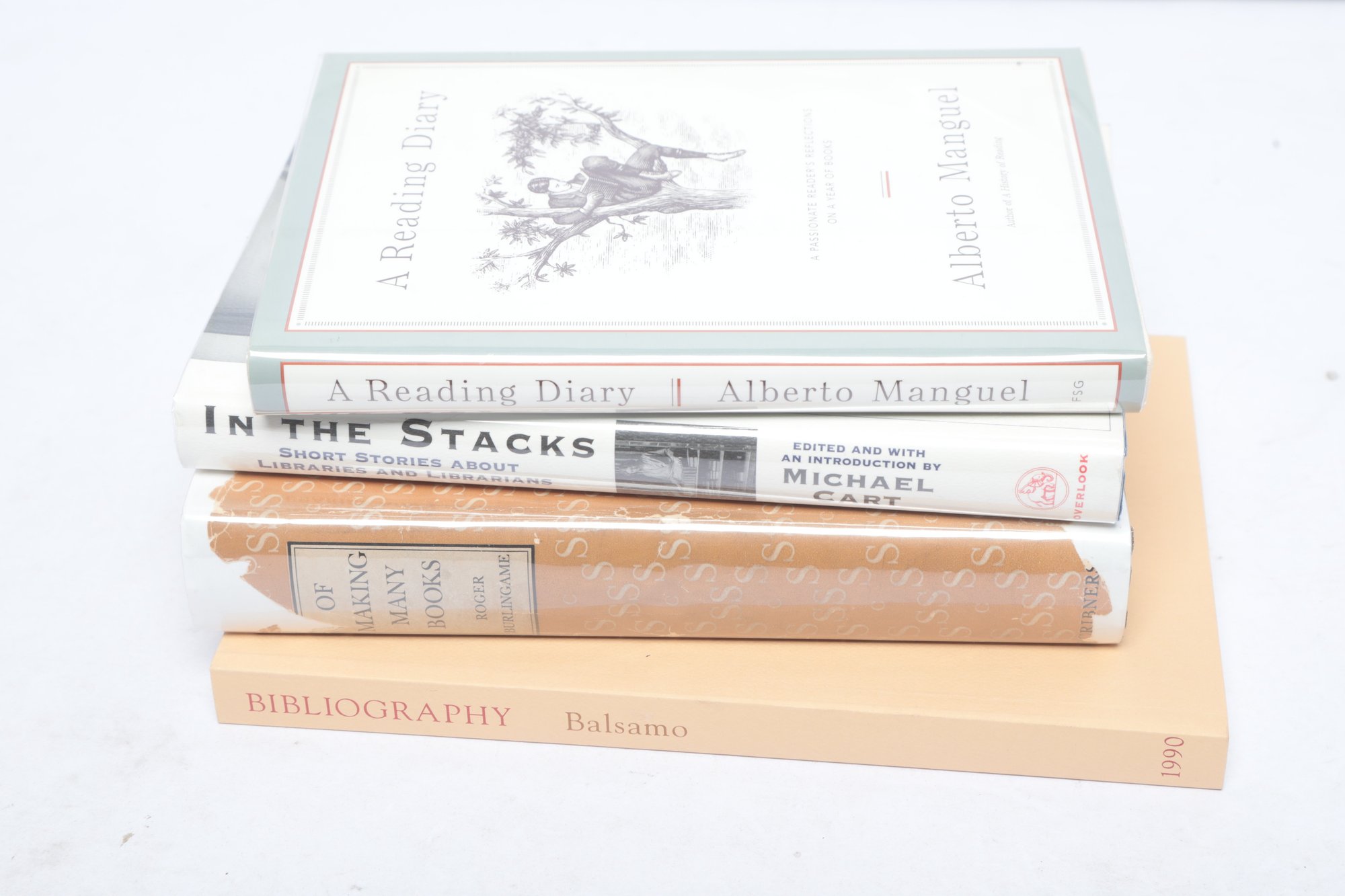 This scholarly lot focuses on the history of books and libraries, featuring A Reading Diary by Alberto Manguel, In the Stacks edited by Michael Cart, Of Making Many Books by Roger Burlingame, and Luigi Balsamo’s Bibliography (1990). The collection consists of three cloth-bound hardcovers in dust jackets and one softcover volume. GOOD OR BETTER CONDITION.