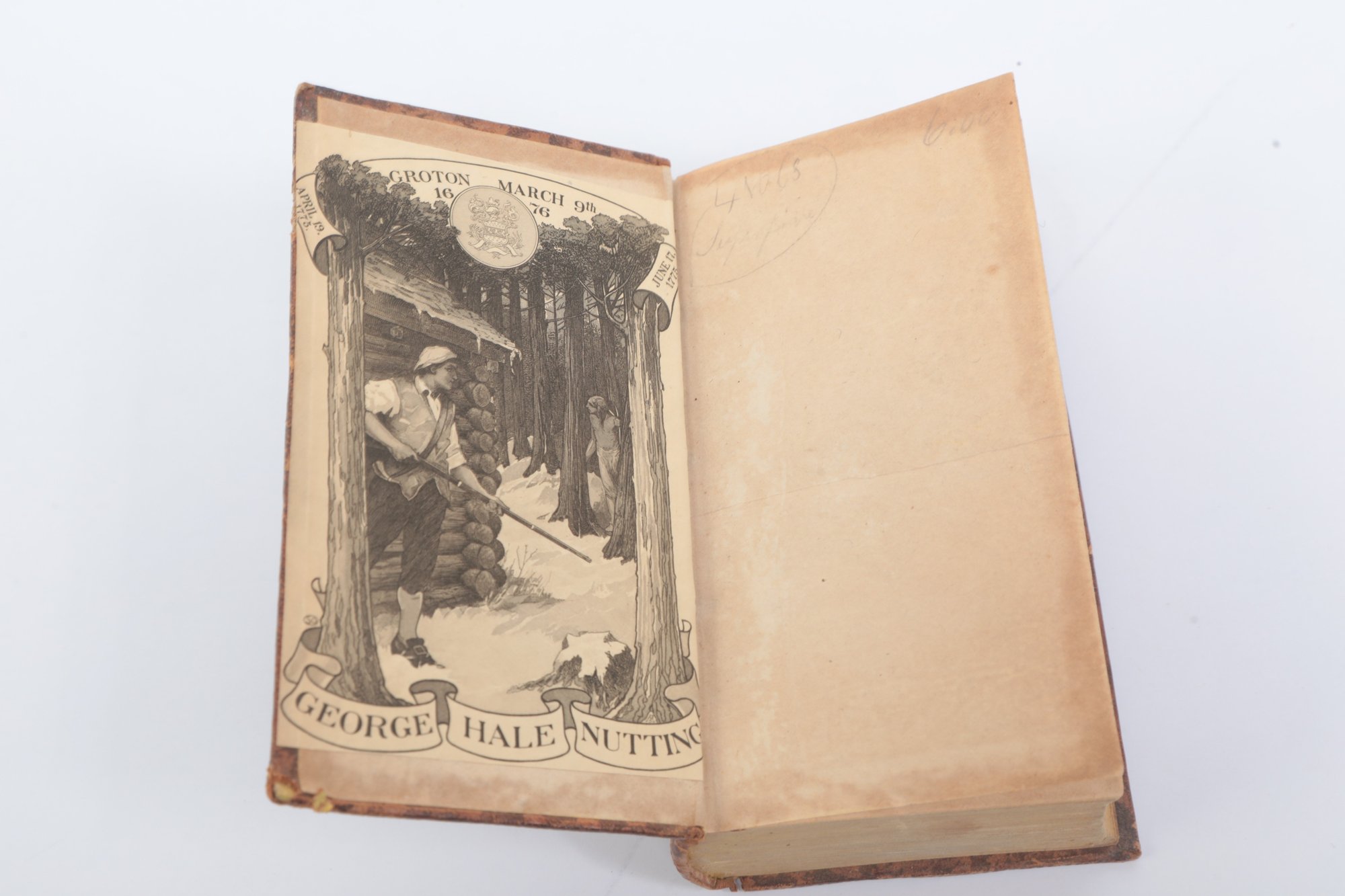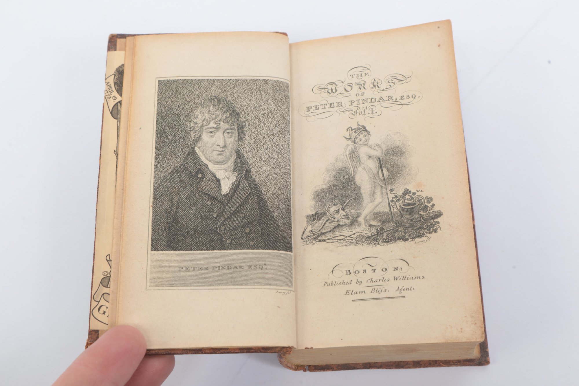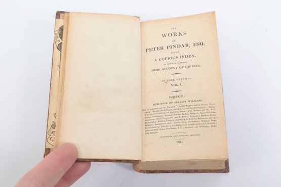 Pindar, Peter [pseud. of John Wolcot]. The Works of Peter Pindar, Esq., with a Copious Index, to Which is Prefixed Some Account of His Life. In Four Volumes. Boston: Published by Charles Williams, Greenough and Stebbins, Printers, 1811. First American edition of the complete works of the celebrated English satirist, with engraved frontispiece portrait and decorative title page vignette. With the handsome engraved bookplate of George Hale Nutting, depicting a colonial militiaman before a log fort, with Groton battle honors (March 9, 1676; April 19, 1775; June 17, 1775). Original full leather; binding worn with some loss, contents toned.