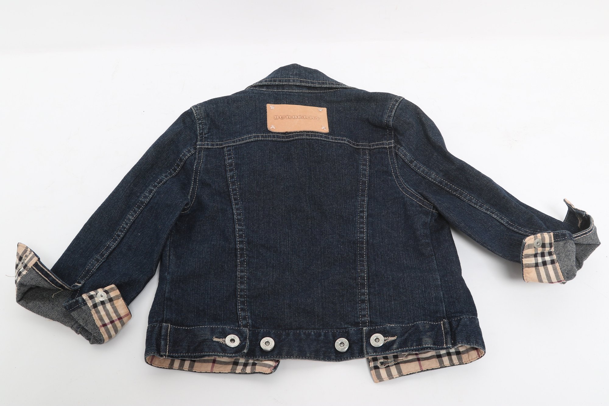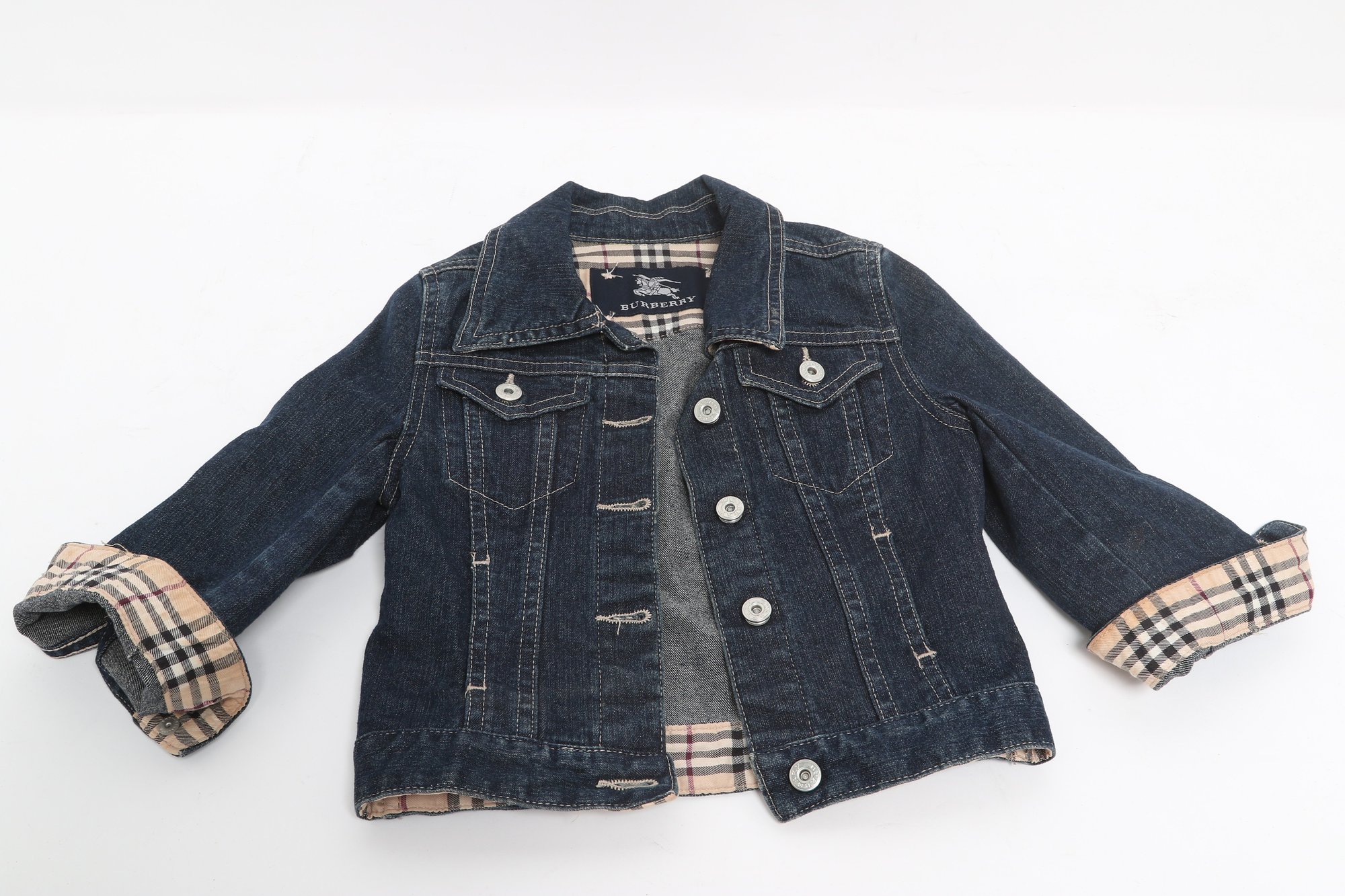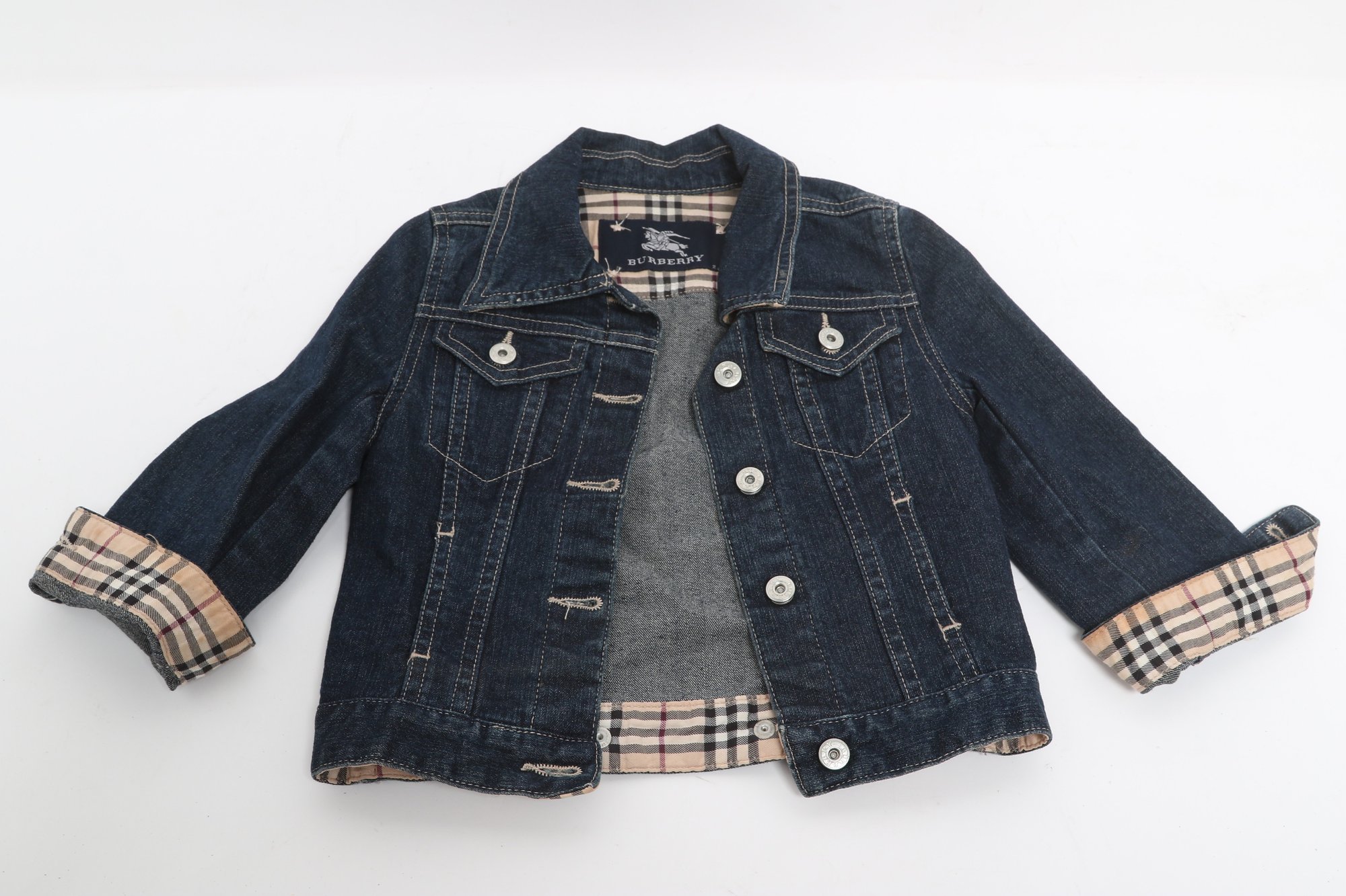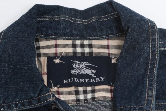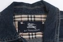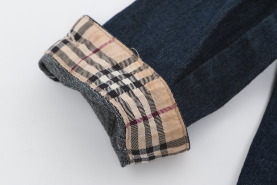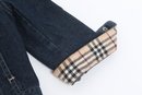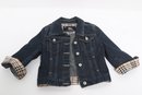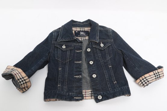 Burberry children’s denim jacket featuring classic Nova Check lining and cuff accents. Size 2Y with button front and structured fit; pre-owned with light wear, a stylish designer piece for kids.