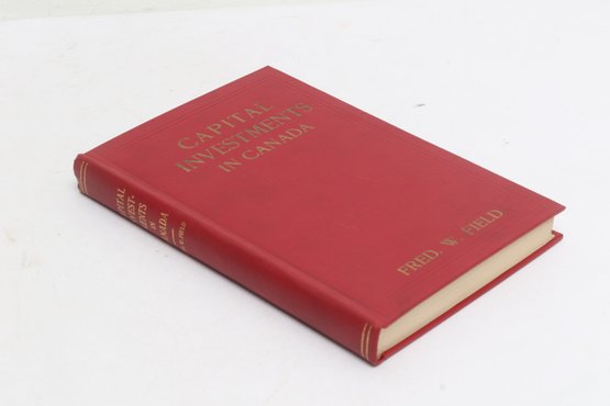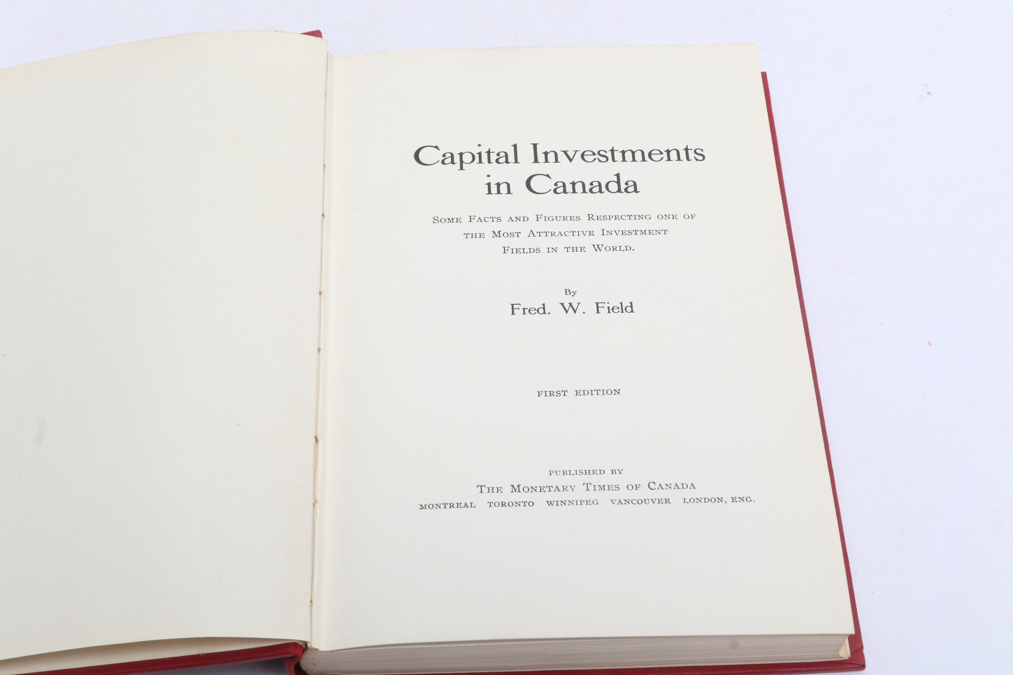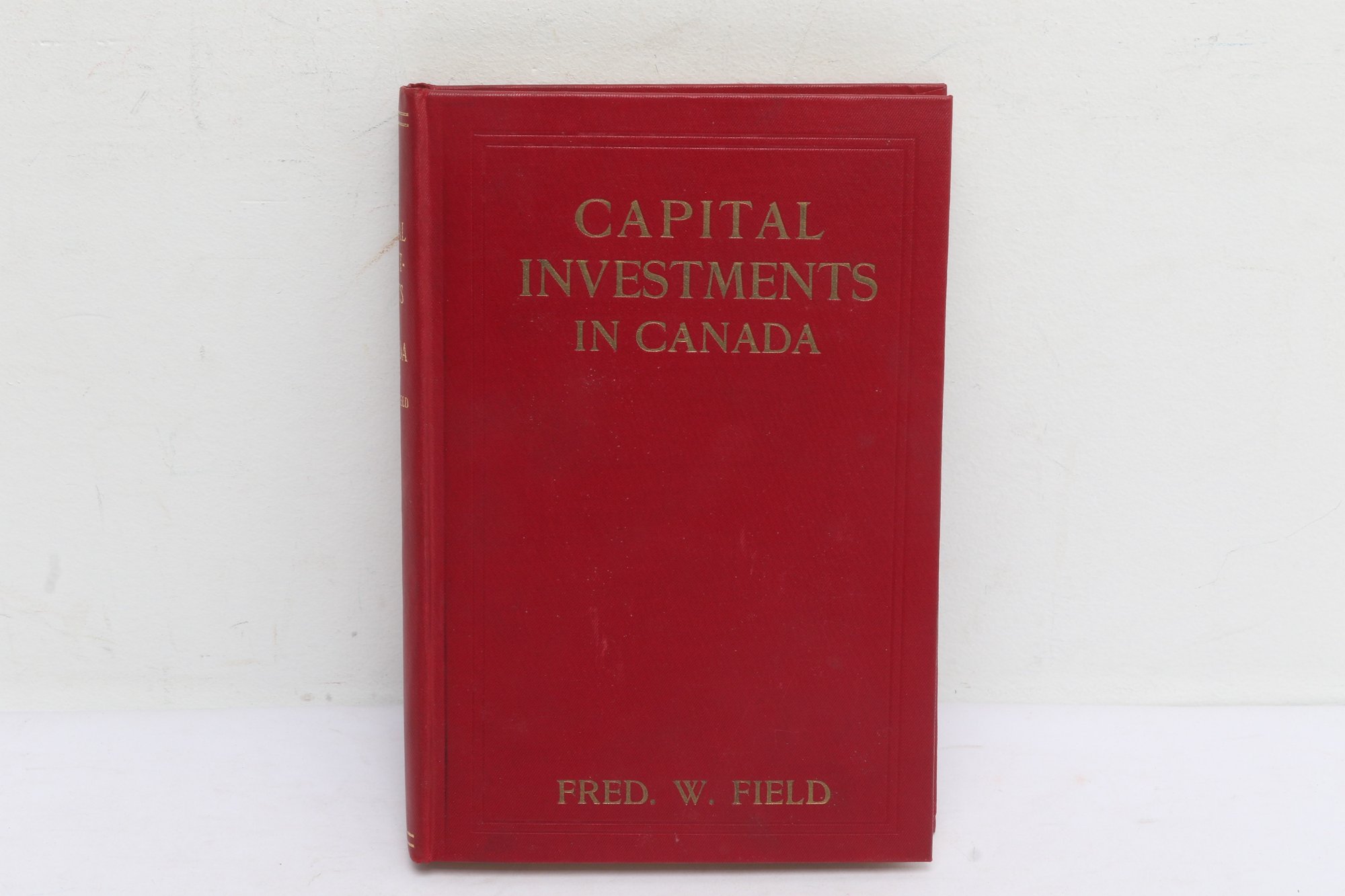 FIELD, Fred. W. Capital Investments in Canada. Some Facts and Figures Respecting one of the Most Attractive Investment Fields in the World. Montreal, Toronto, Winnipeg, Vancouver, London: The Monetary Times of Canada, 1911. First edition. Octavo, red gilt-stamped binding. Promotional economic study published by The Monetary Times advocating Canadian investment opportunities during the Dominion's pre-WWI expansion period. Copyright entered 1911. Binding shows light wear, interior clean.