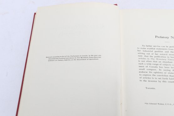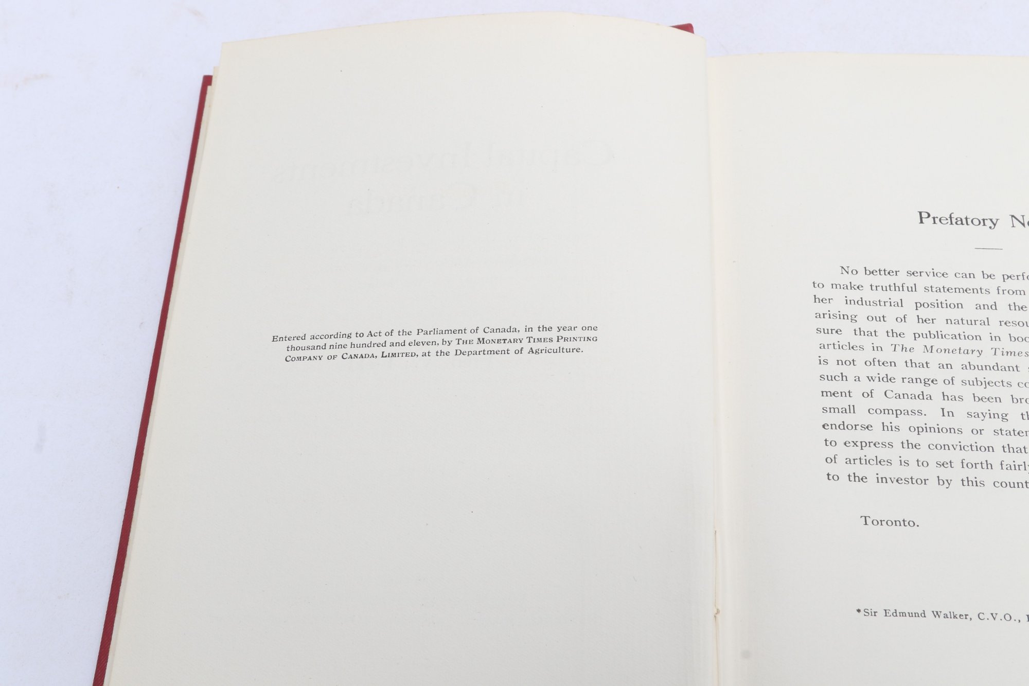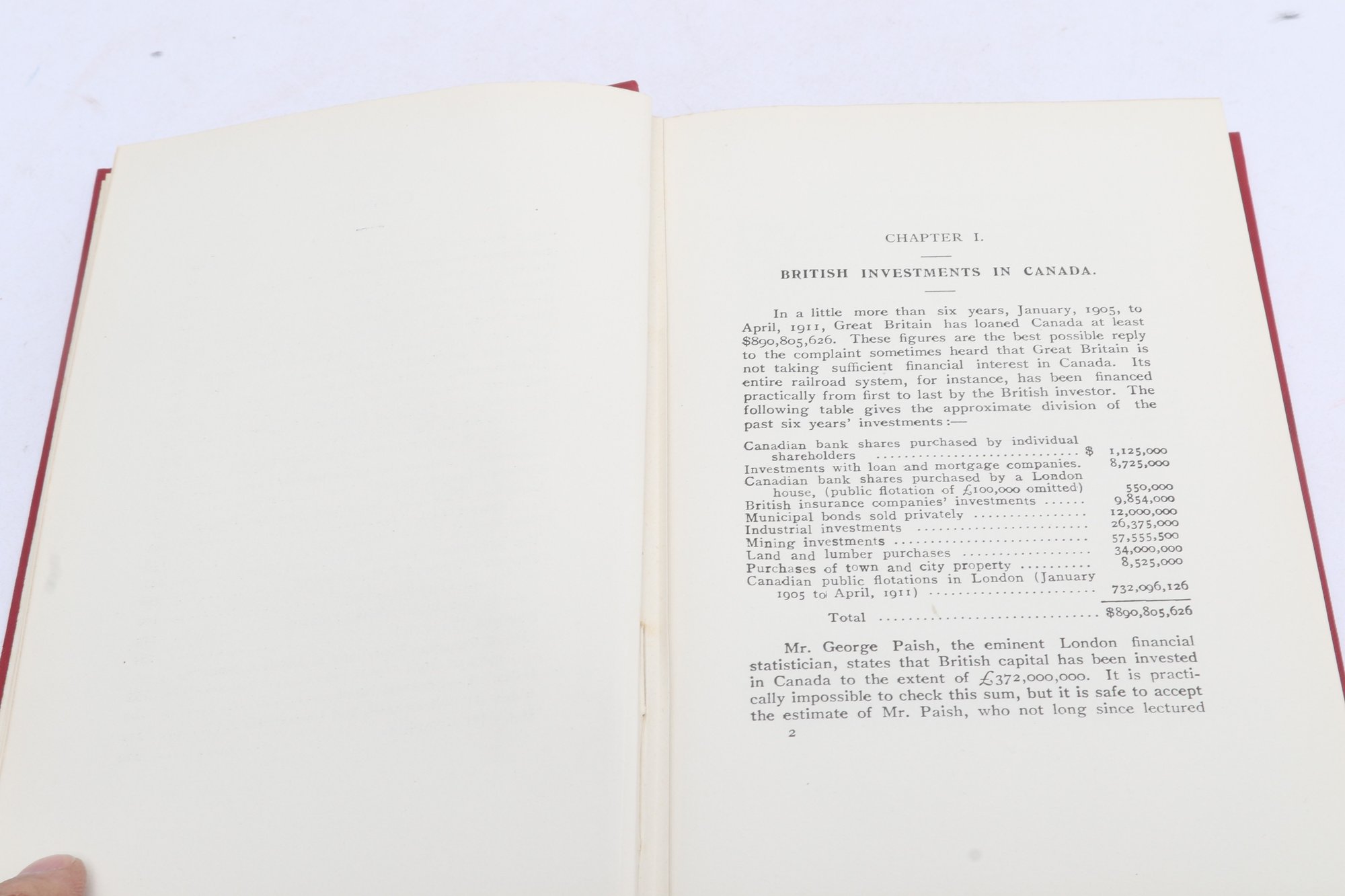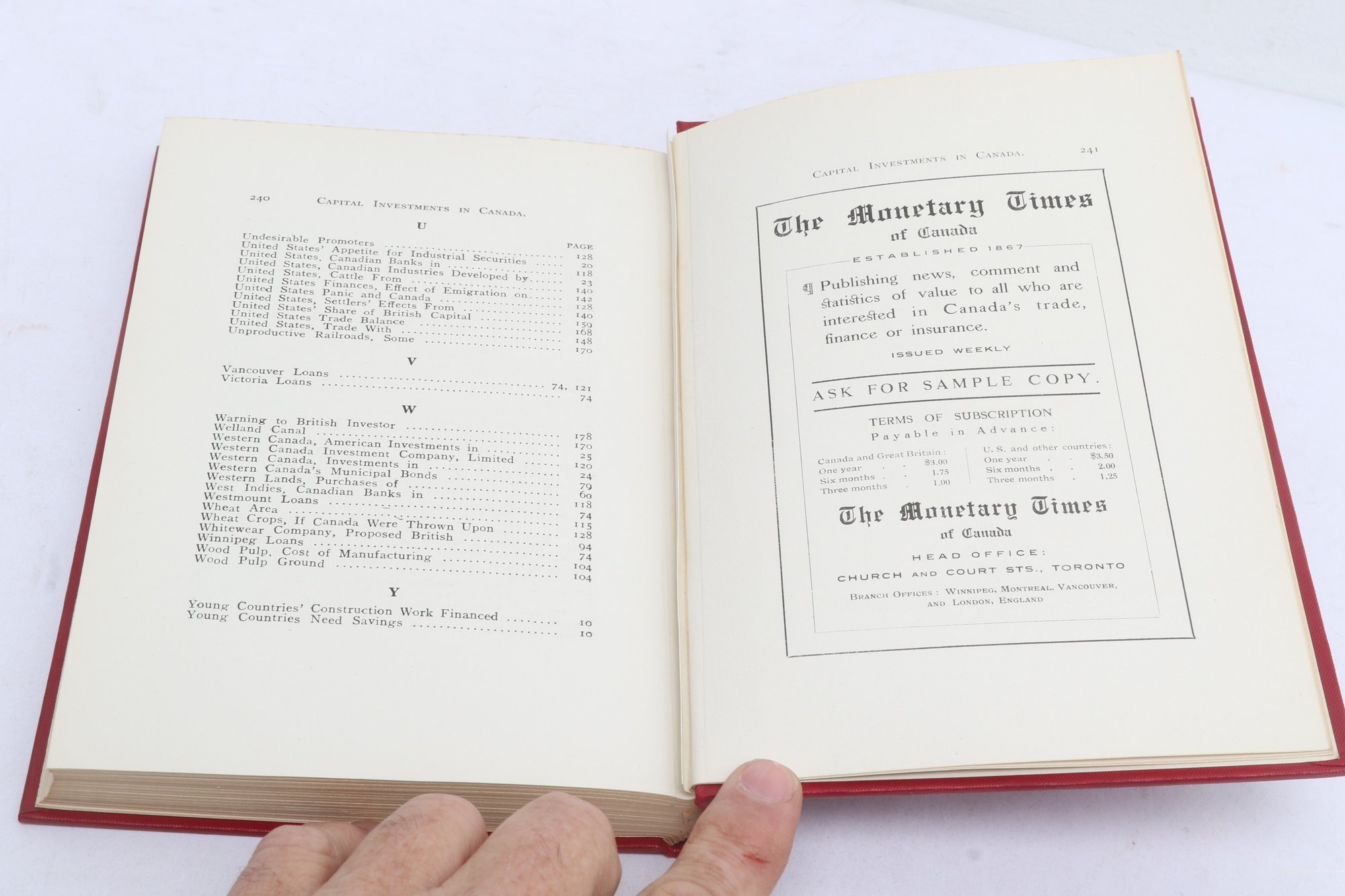 FIELD, Fred. W. Capital Investments in Canada. Some Facts and Figures Respecting one of the Most Attractive Investment Fields in the World. Montreal, Toronto, Winnipeg, Vancouver, London: The Monetary Times of Canada, 1911. First edition. Octavo, red gilt-stamped binding. Promotional economic study published by The Monetary Times advocating Canadian investment opportunities during the Dominion's pre-WWI expansion period. Copyright entered 1911. Binding shows light wear, interior clean.