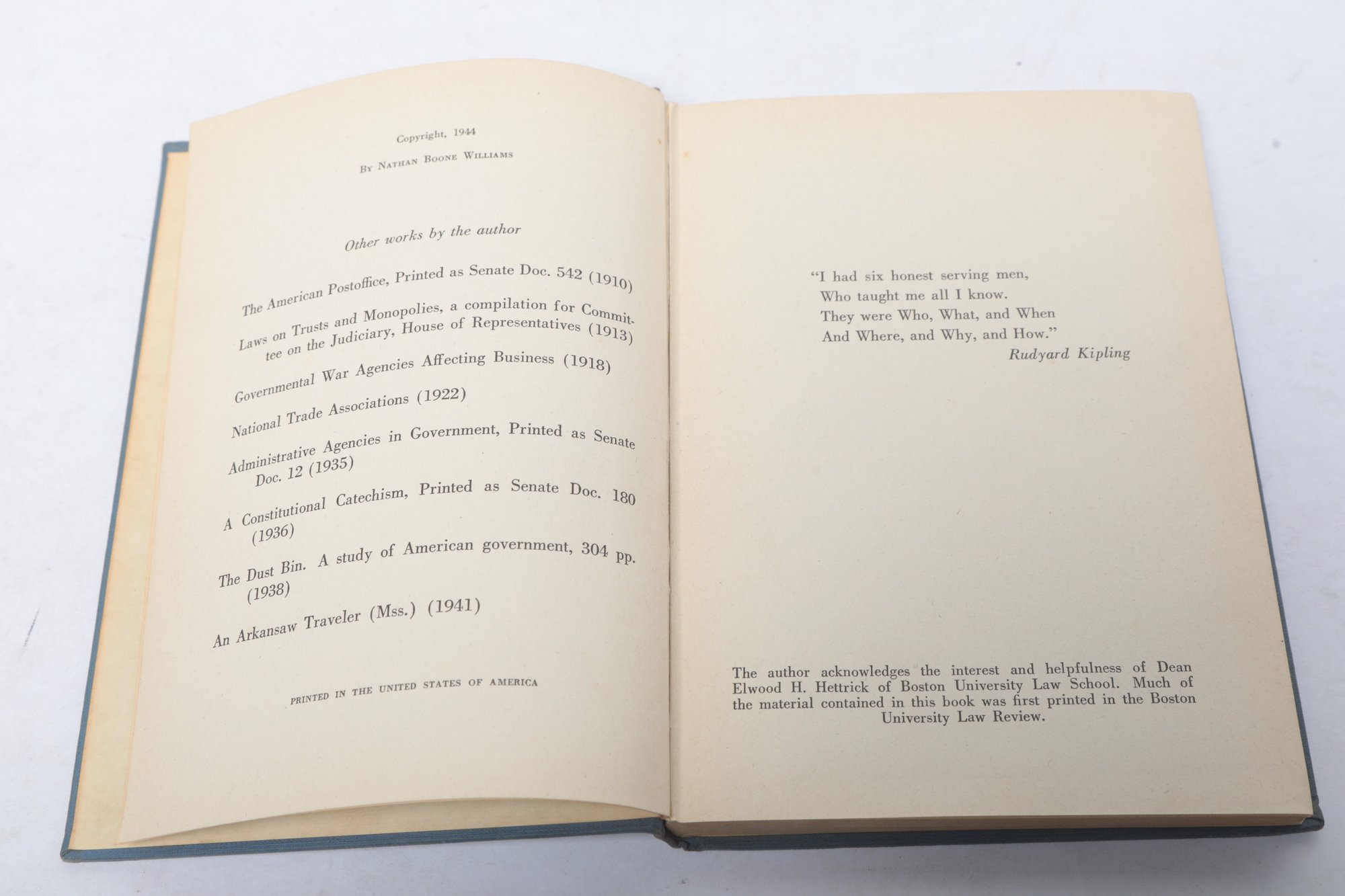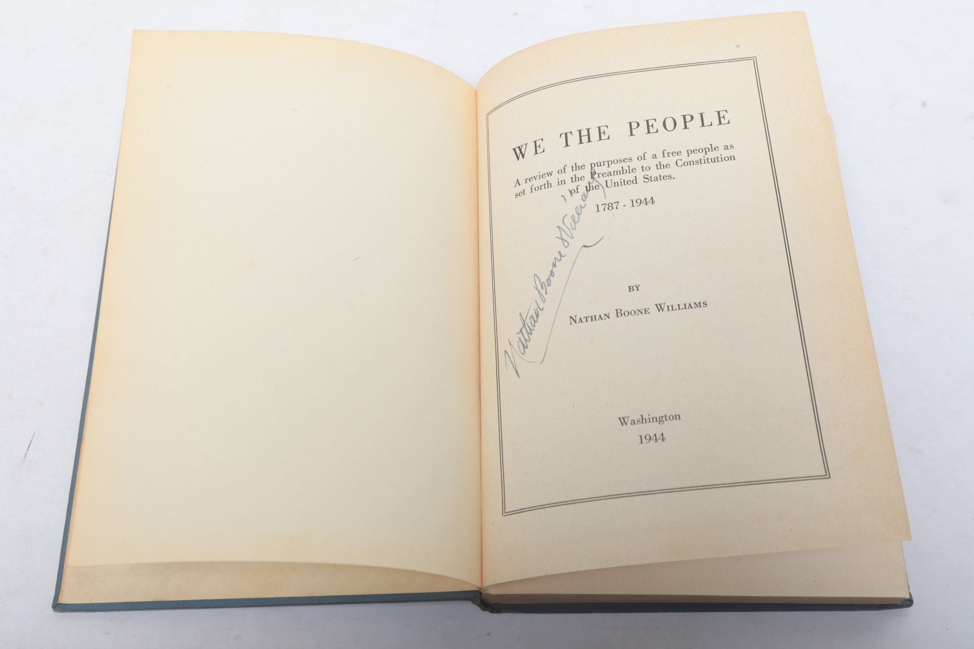 Washington: [Self-Published/Nathan Boone Williams] 1944. Hardcover in blue cloth. A review of the Preamble to the Constitution from 1787–1944. Binding shows light shelf wear with some toning to the page edges. Text block is clean and appears well-preserved. Inscribed by the author on the title page.