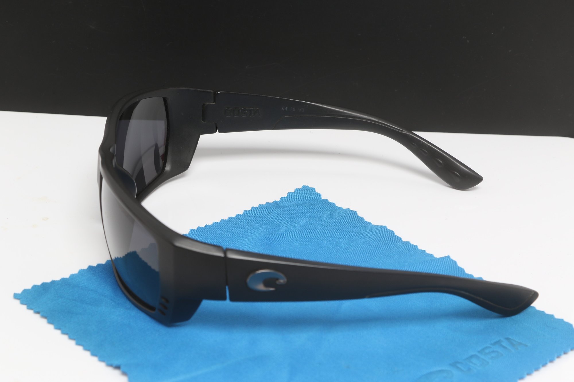 Costa Del Mar Tuna Alley sunglasses featuring black frames and blue polarized lenses. Includes original Costa case and cleaning cloth. Designed for performance and clarity, ideal for outdoor and water use. Pre-owned with light wear, overall in very good condition.