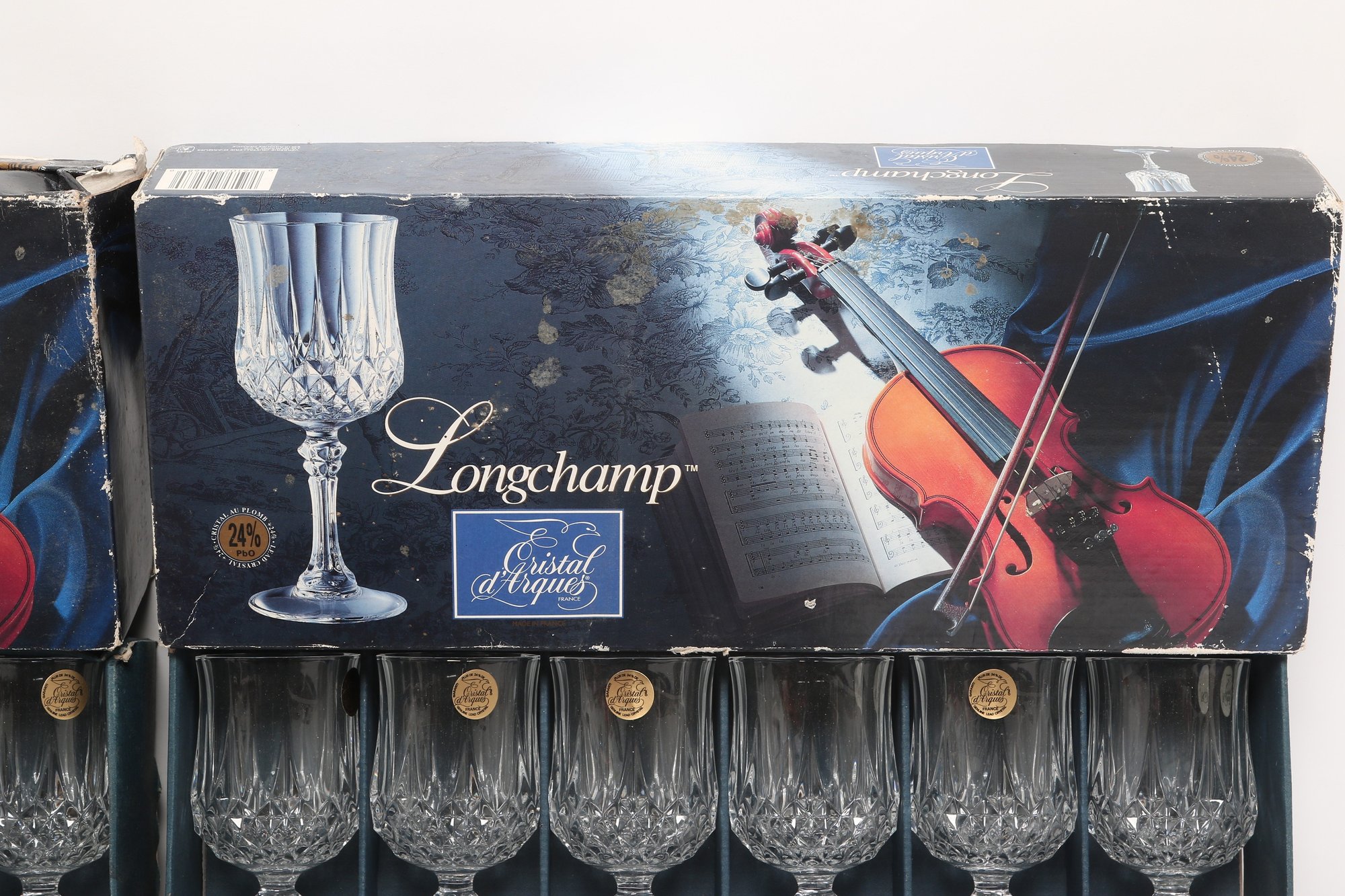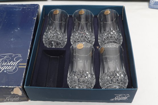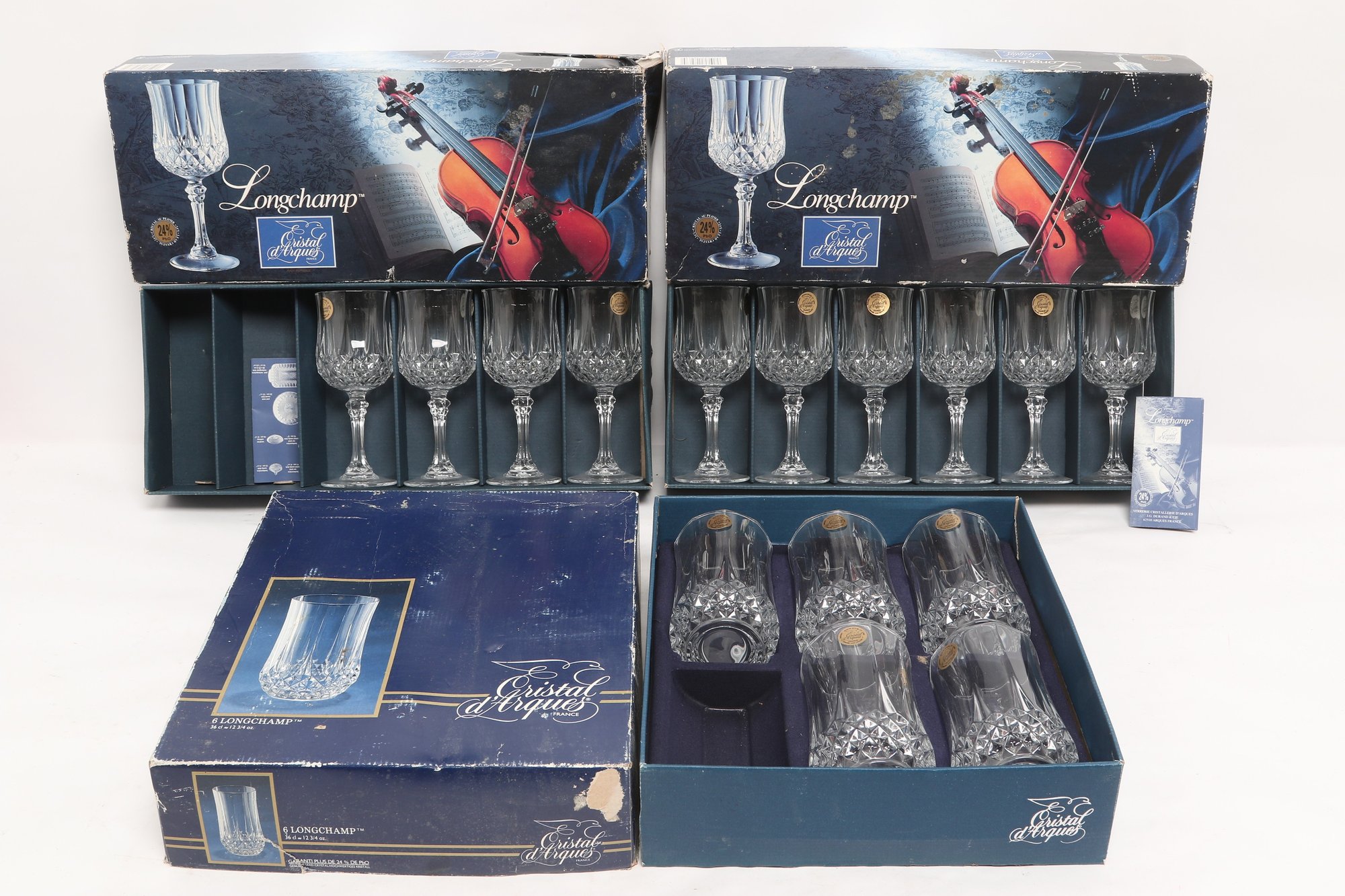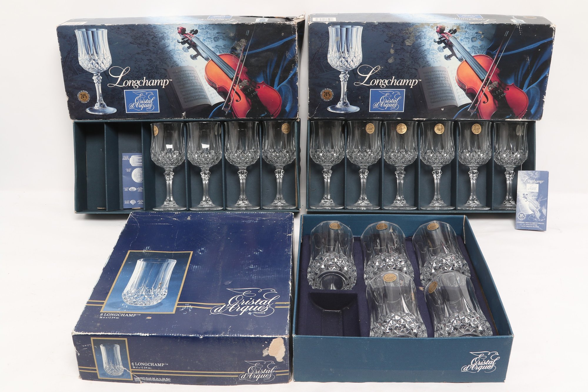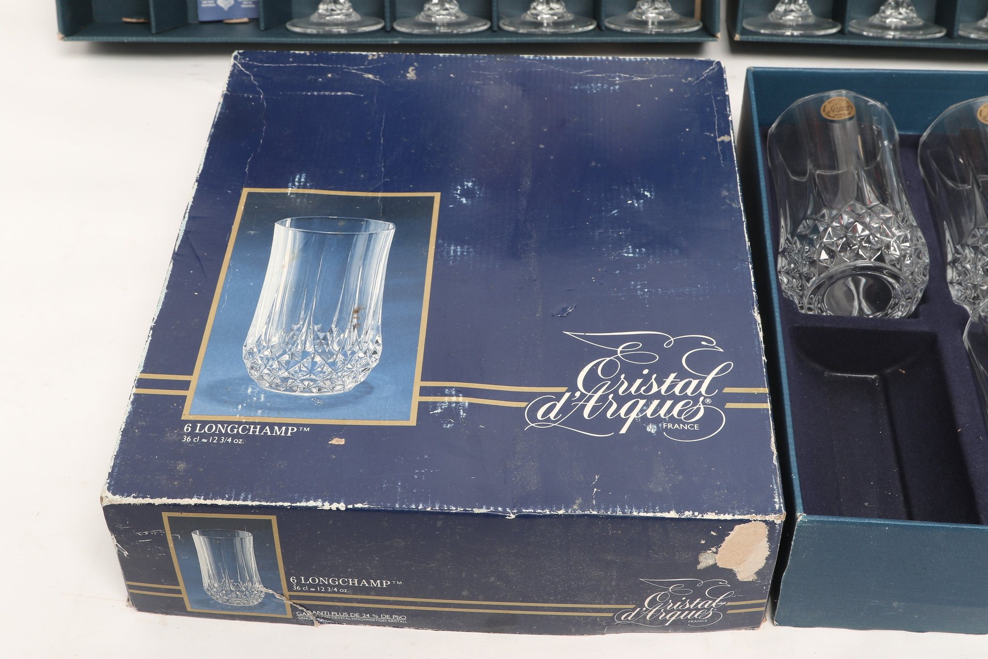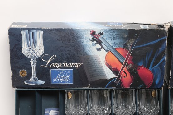 Collection of Cristal d'Arques “Longchamp” pattern glassware including multiple cut crystal stemware glasses and matching tumblers, presented in original fitted boxes. Features classic faceted design with elegant stems; boxes show visible shelf wear and scuffing. Overall a nice vintage set for entertaining or display.