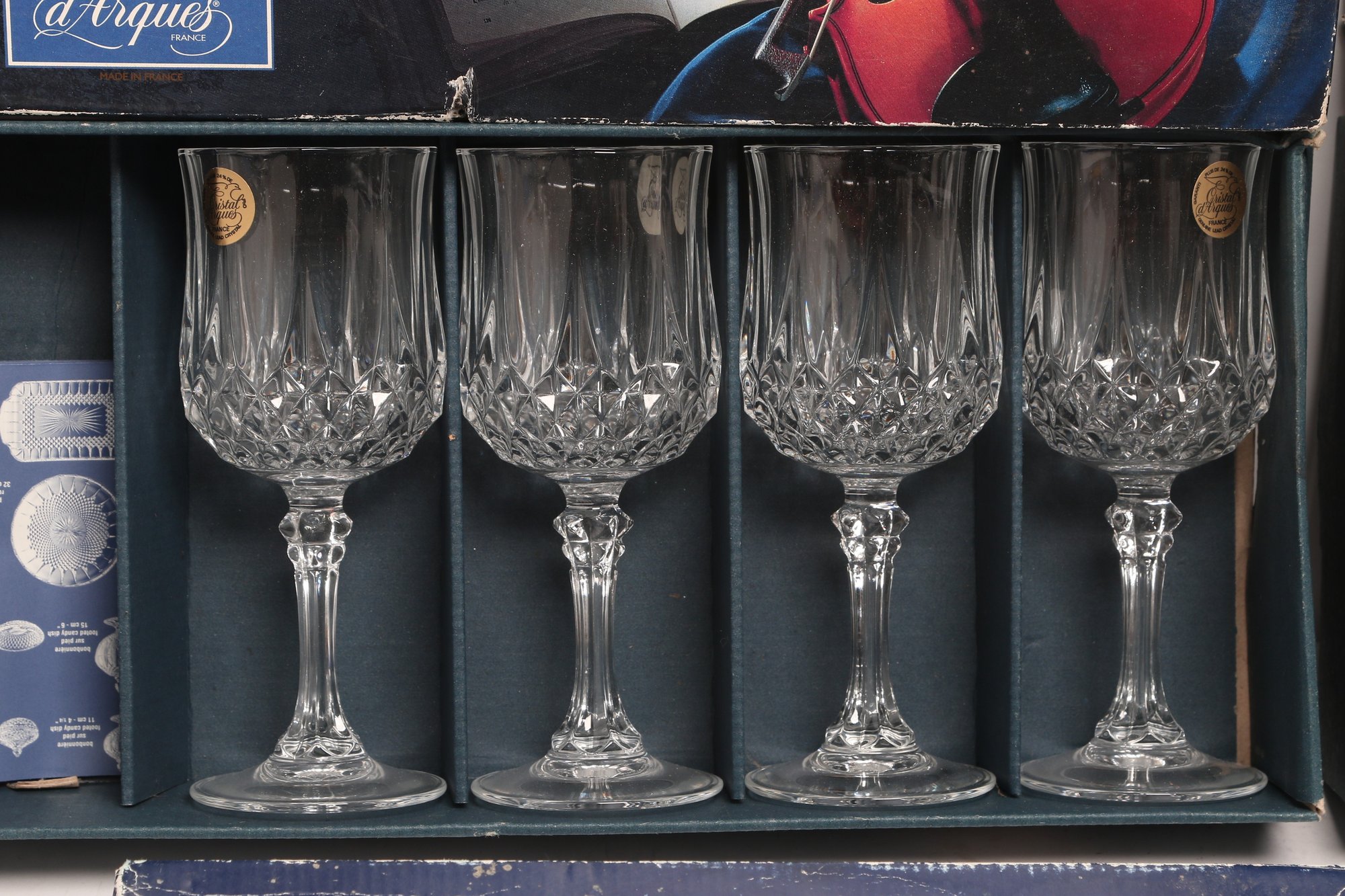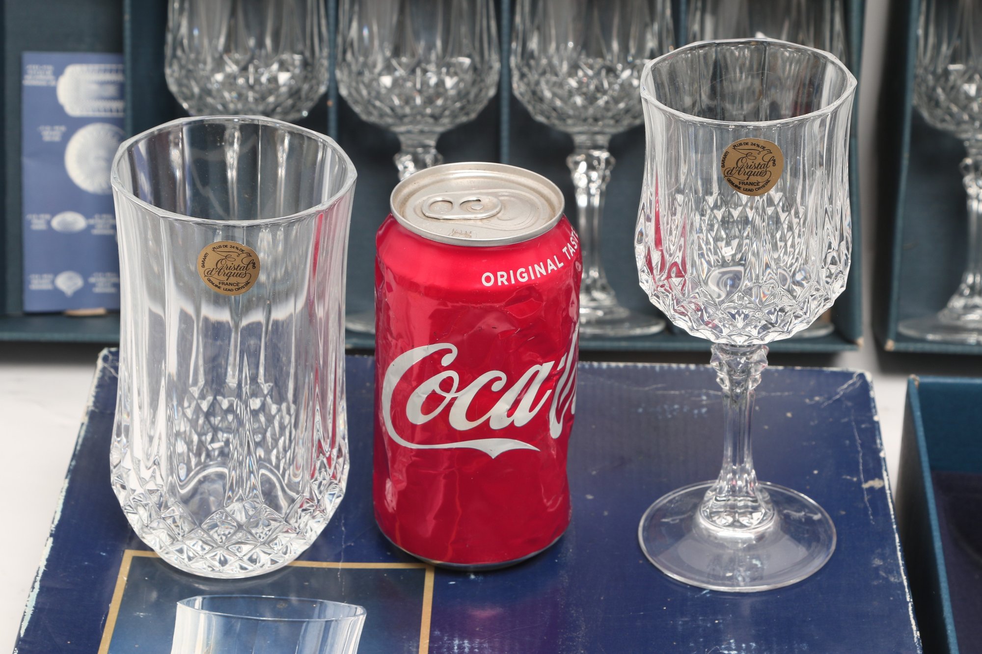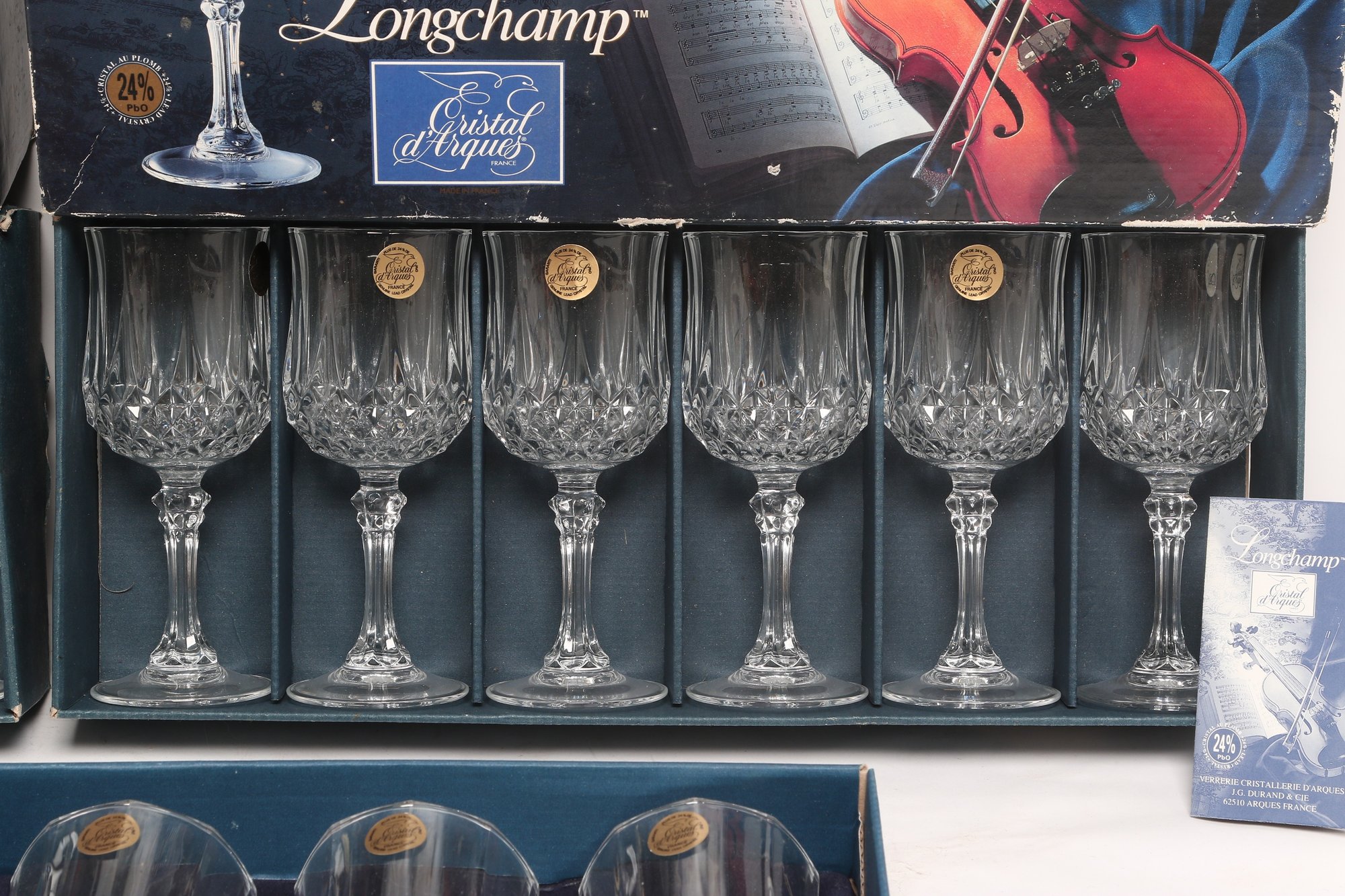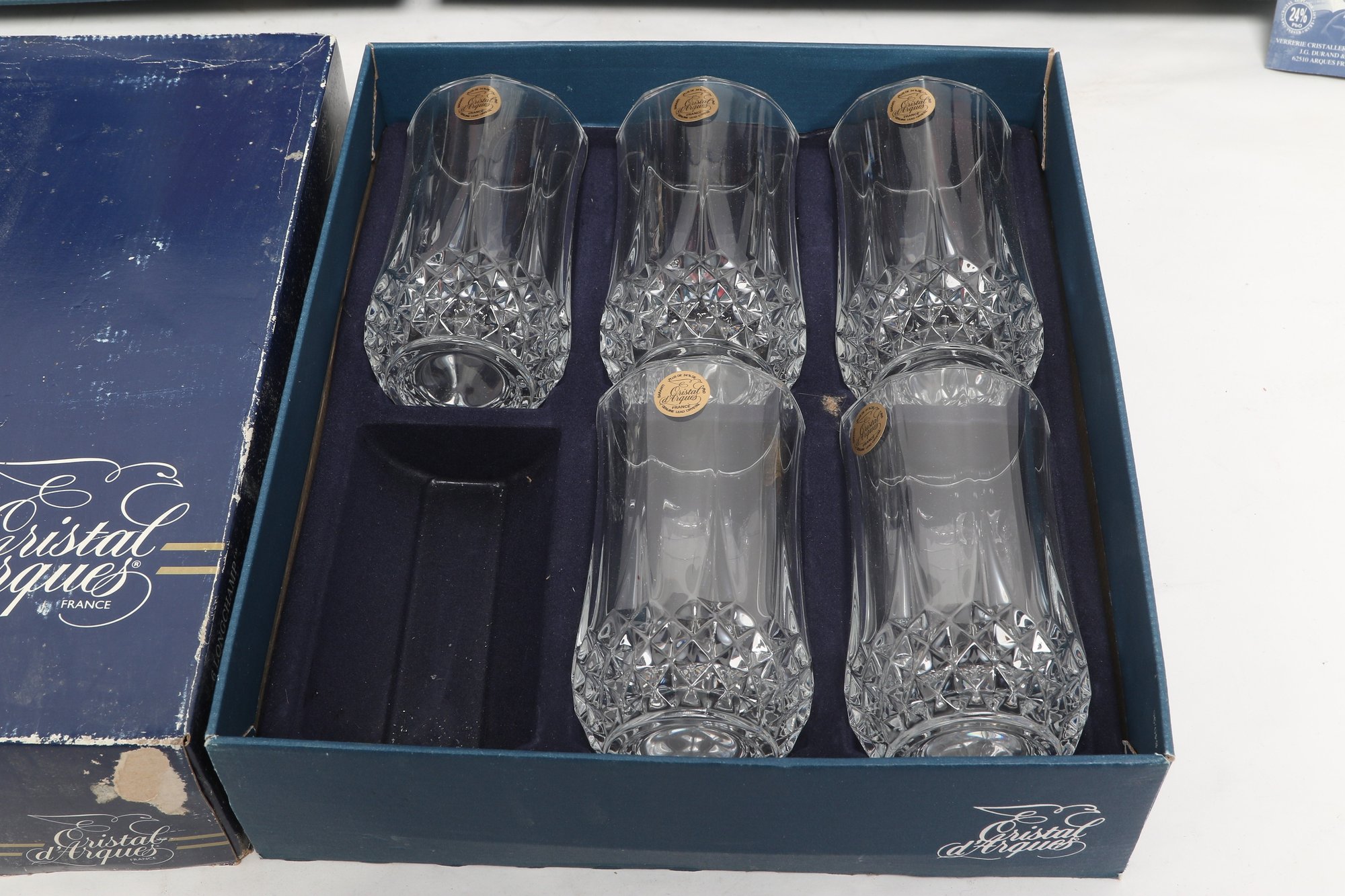Collection of Cristal d'Arques “Longchamp” pattern glassware including multiple cut crystal stemware glasses and matching tumblers, presented in original fitted boxes. Features classic faceted design with elegant stems; boxes show visible shelf wear and scuffing. Overall a nice vintage set for entertaining or display.