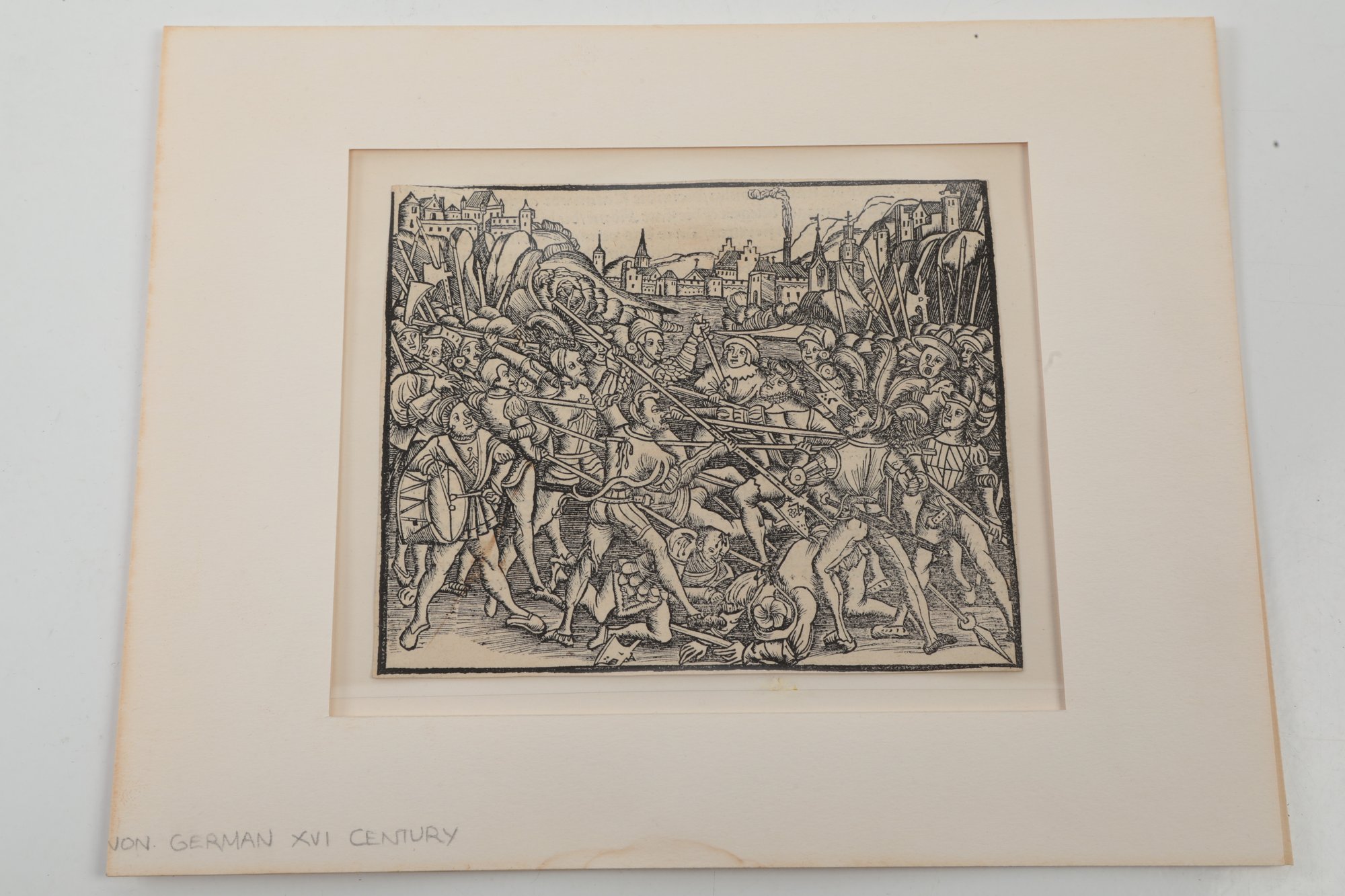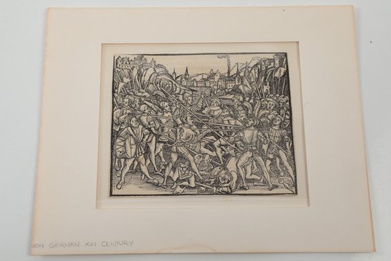 Early woodcut illustration depicting a violent battle scene with medieval city backdrop, from this important Cologne chronicle. Image size approx. 4⅝ x 5 11/16 inches. Dynamic composition shows two armed groups in conflict, with detailed architectural elements and cityscape in background. Sharp, dark impression; German text on back . In blackletter (Gothic) typeface. Rare. *Compare to Syracuse holding : https://onlinecollections.syr.edu/objects/24244/chronicle-of-the-holy-city-of-cologne