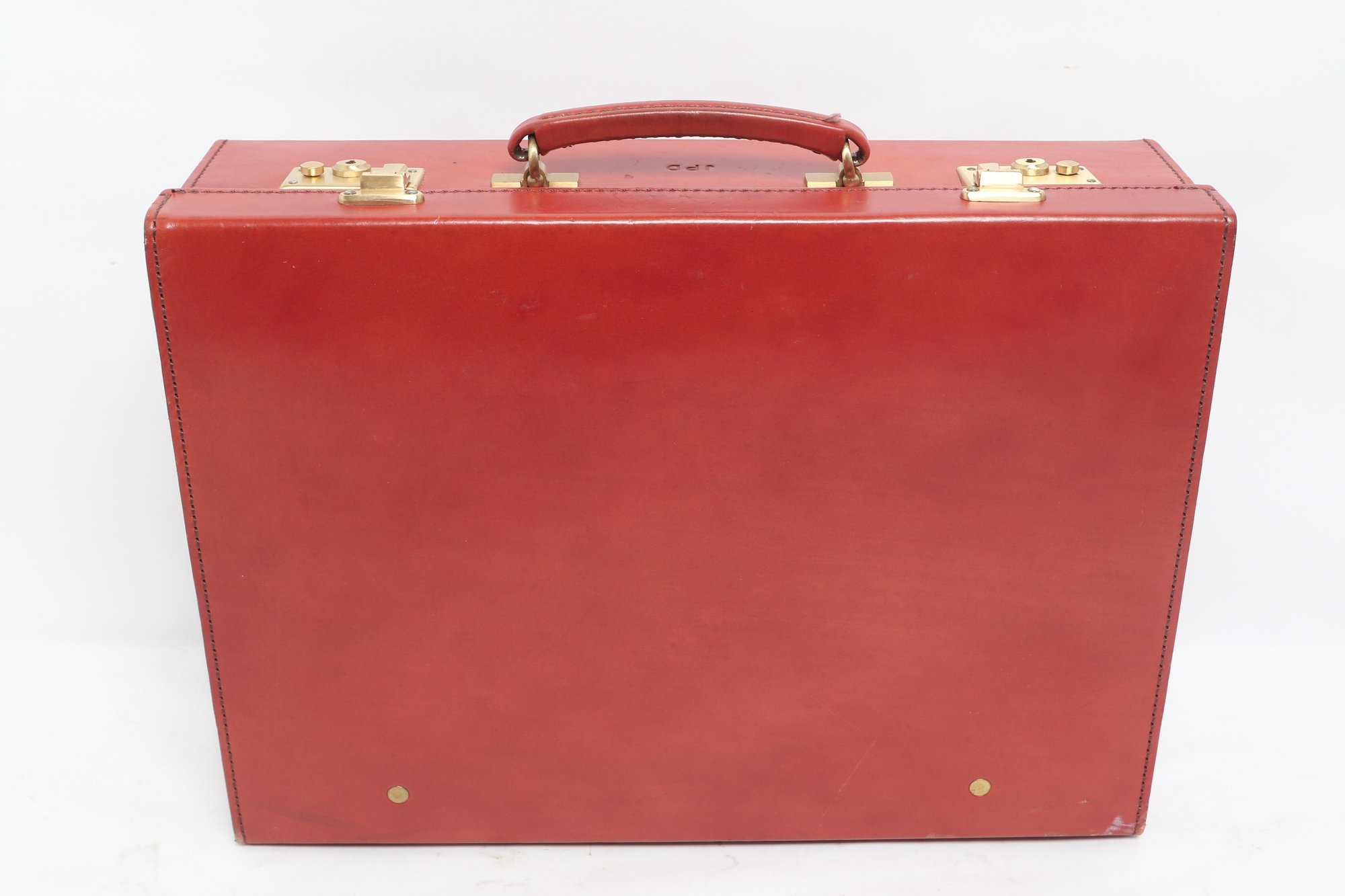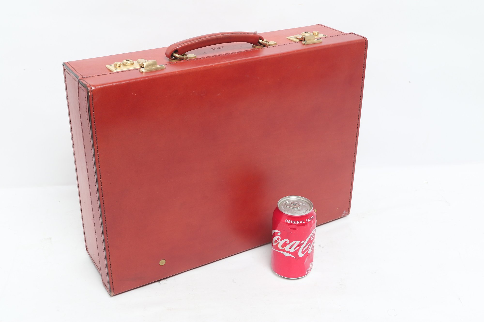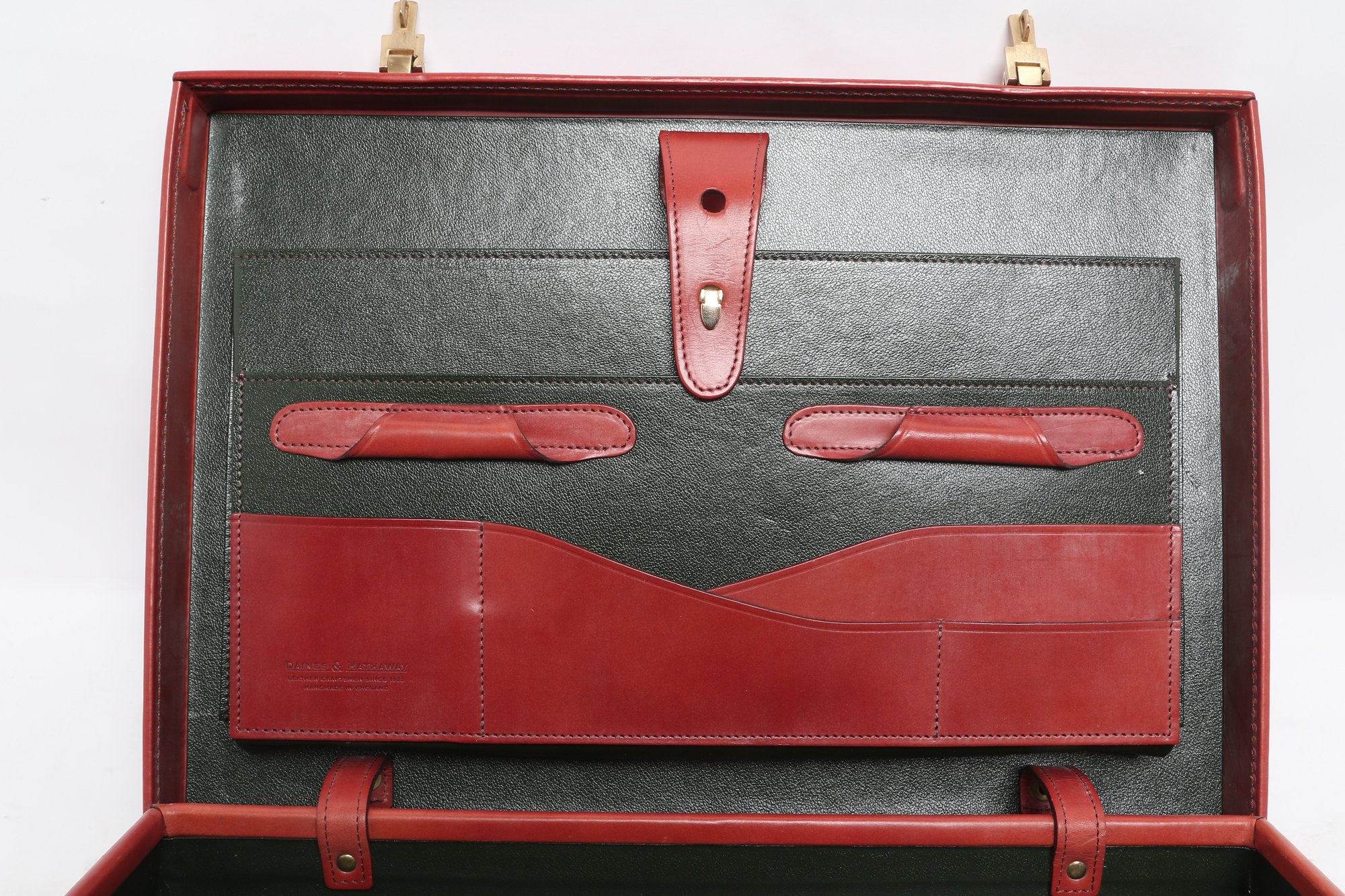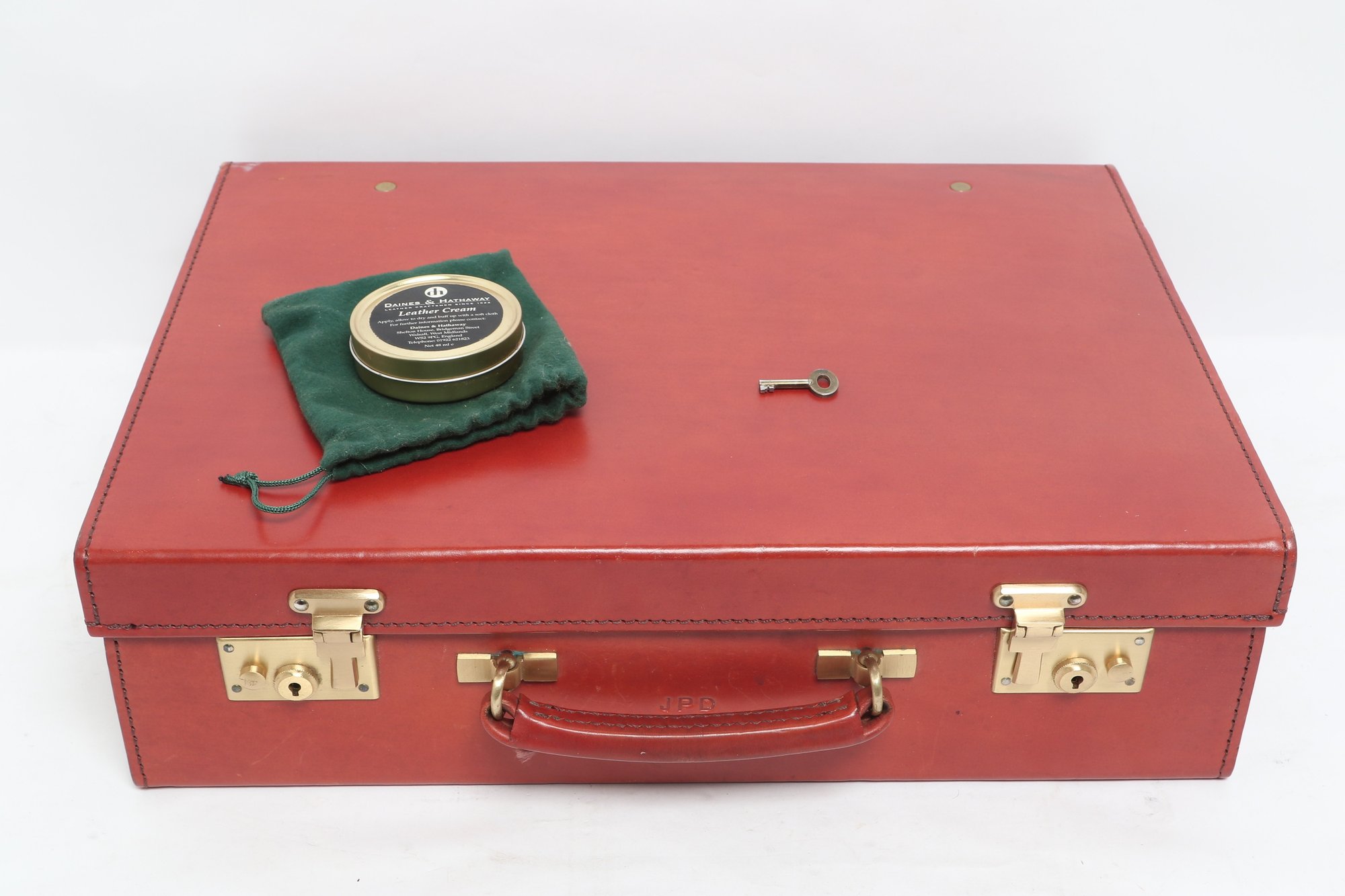 Quality Danes & Hathaway red leather attache briefcase featuring a structured form with brass-tone locking latches and fitted interior compartments for documents and essentials. Includes original key and matching leather care cream with cloth. Shows light wear consistent with use; well-crafted and presents nicely.
