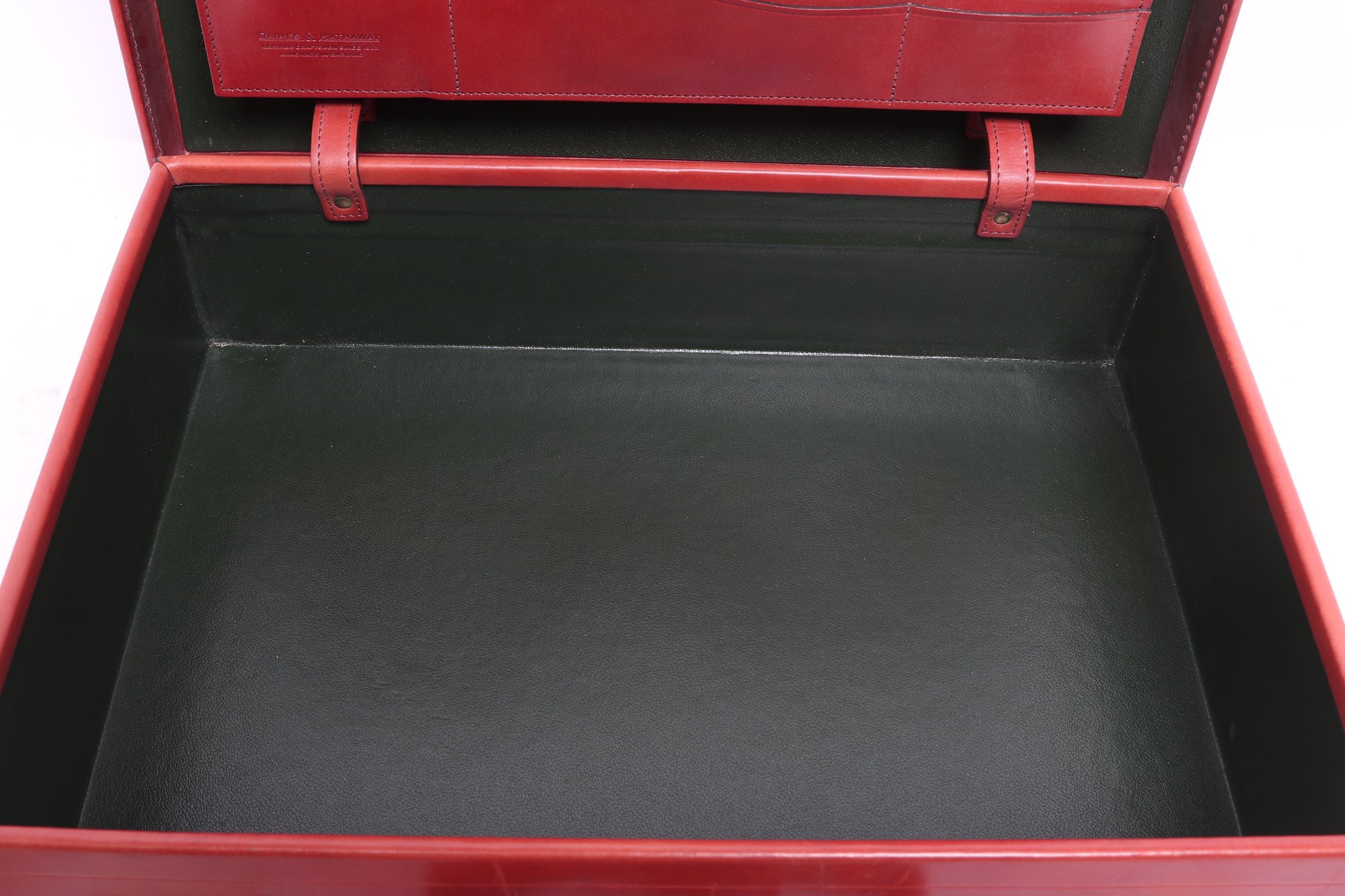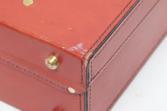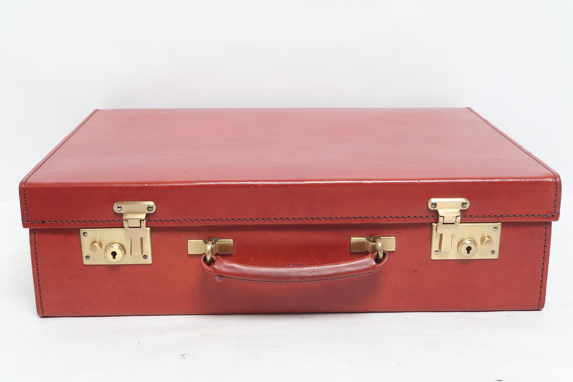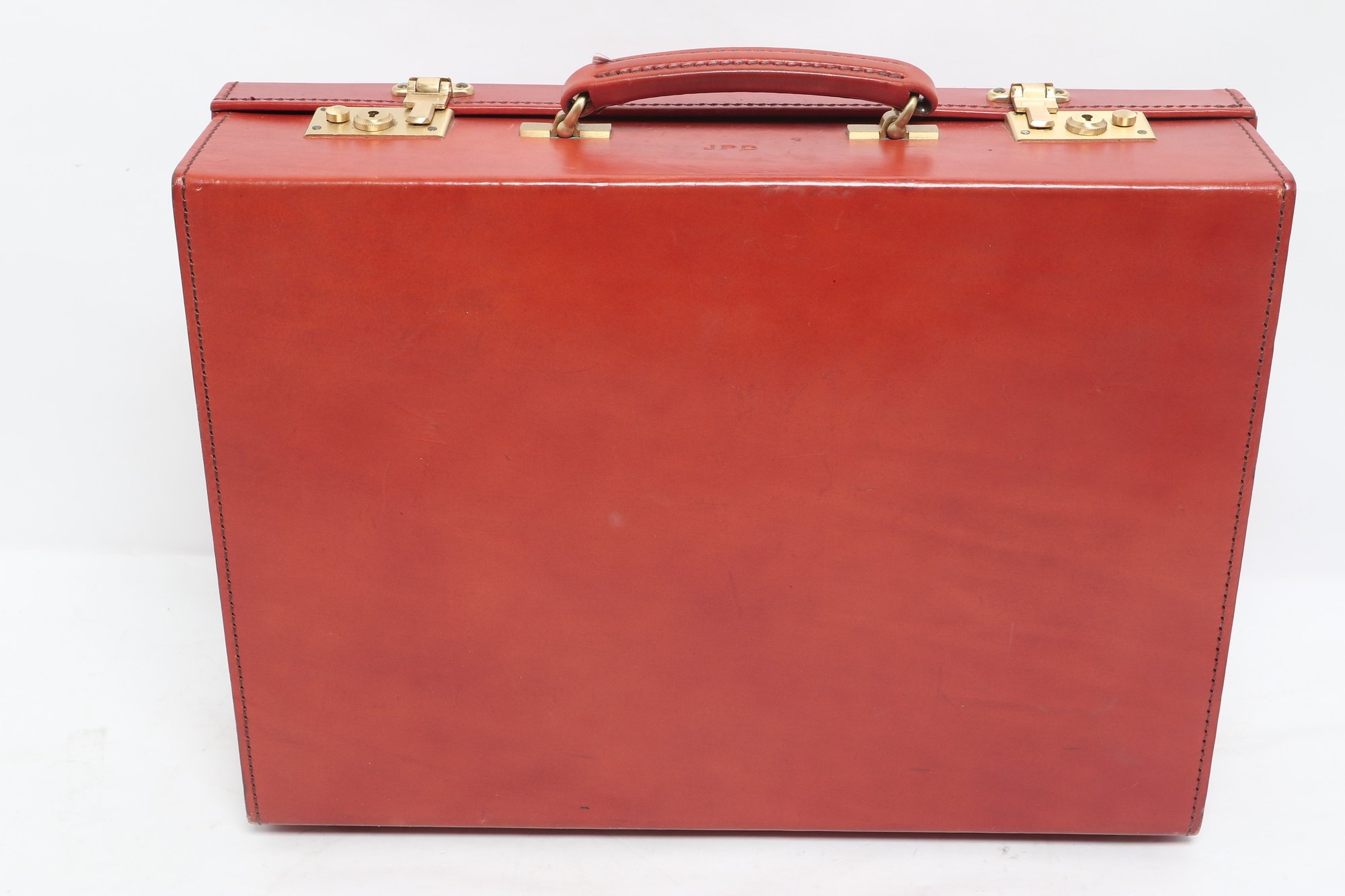 Quality Danes & Hathaway red leather attache briefcase featuring a structured form with brass-tone locking latches and fitted interior compartments for documents and essentials. Includes original key and matching leather care cream with cloth. Shows light wear consistent with use; well-crafted and presents nicely.