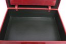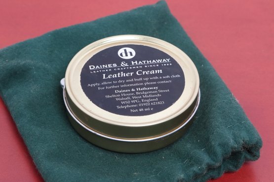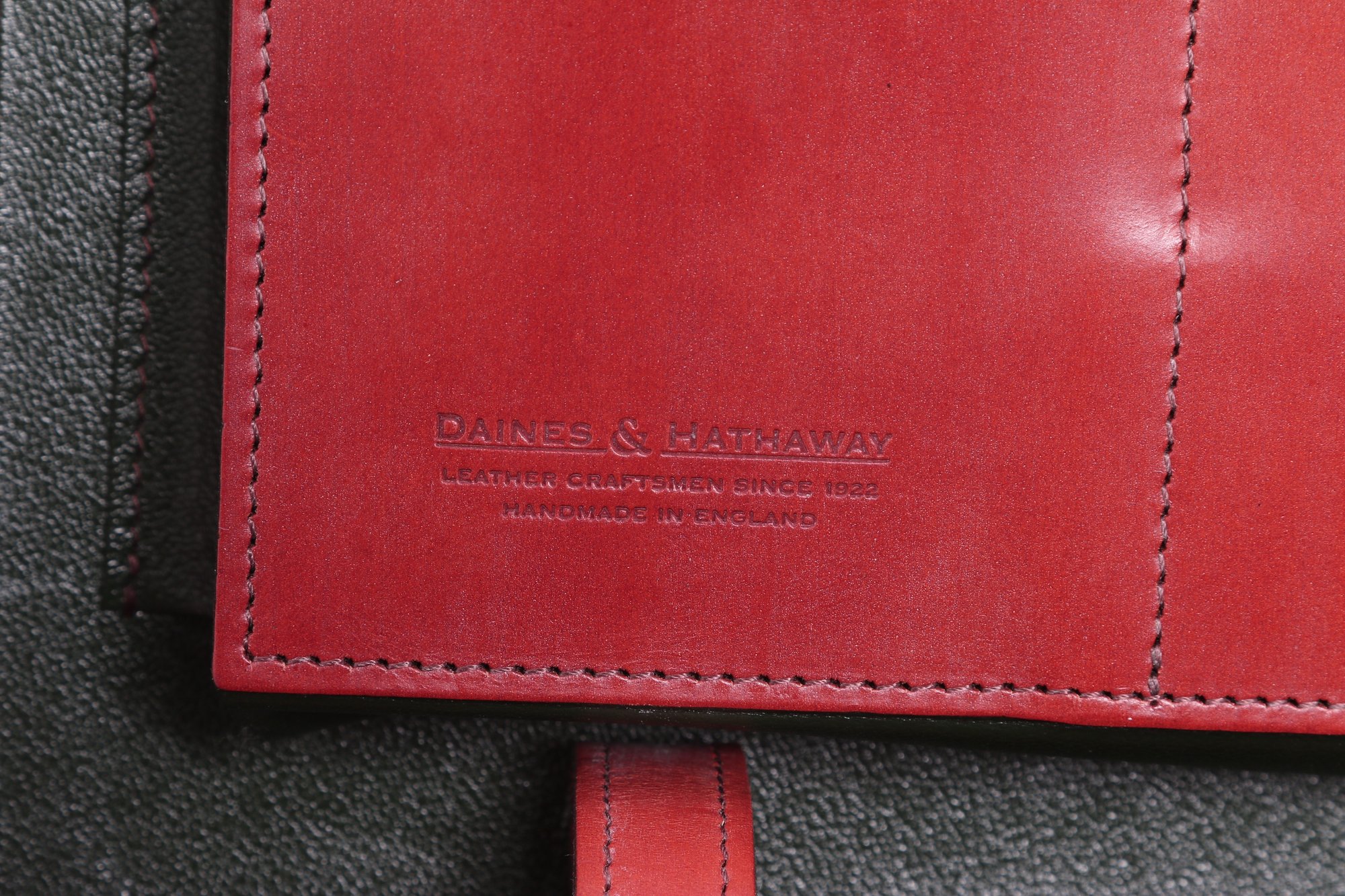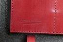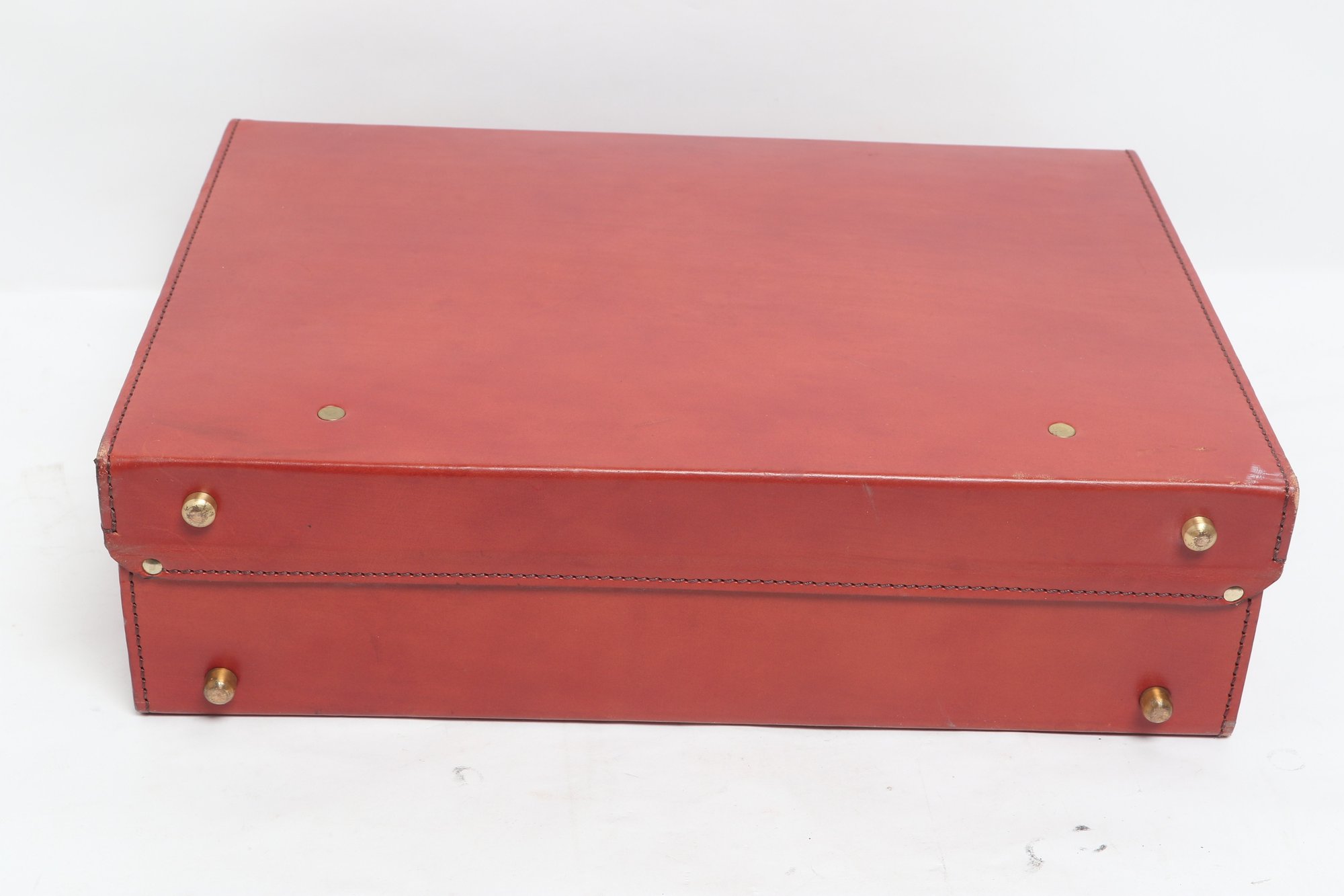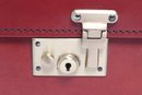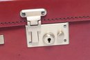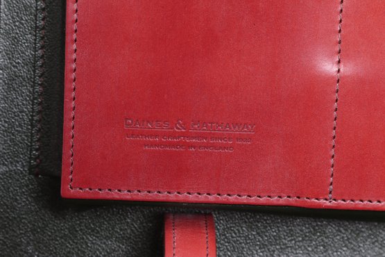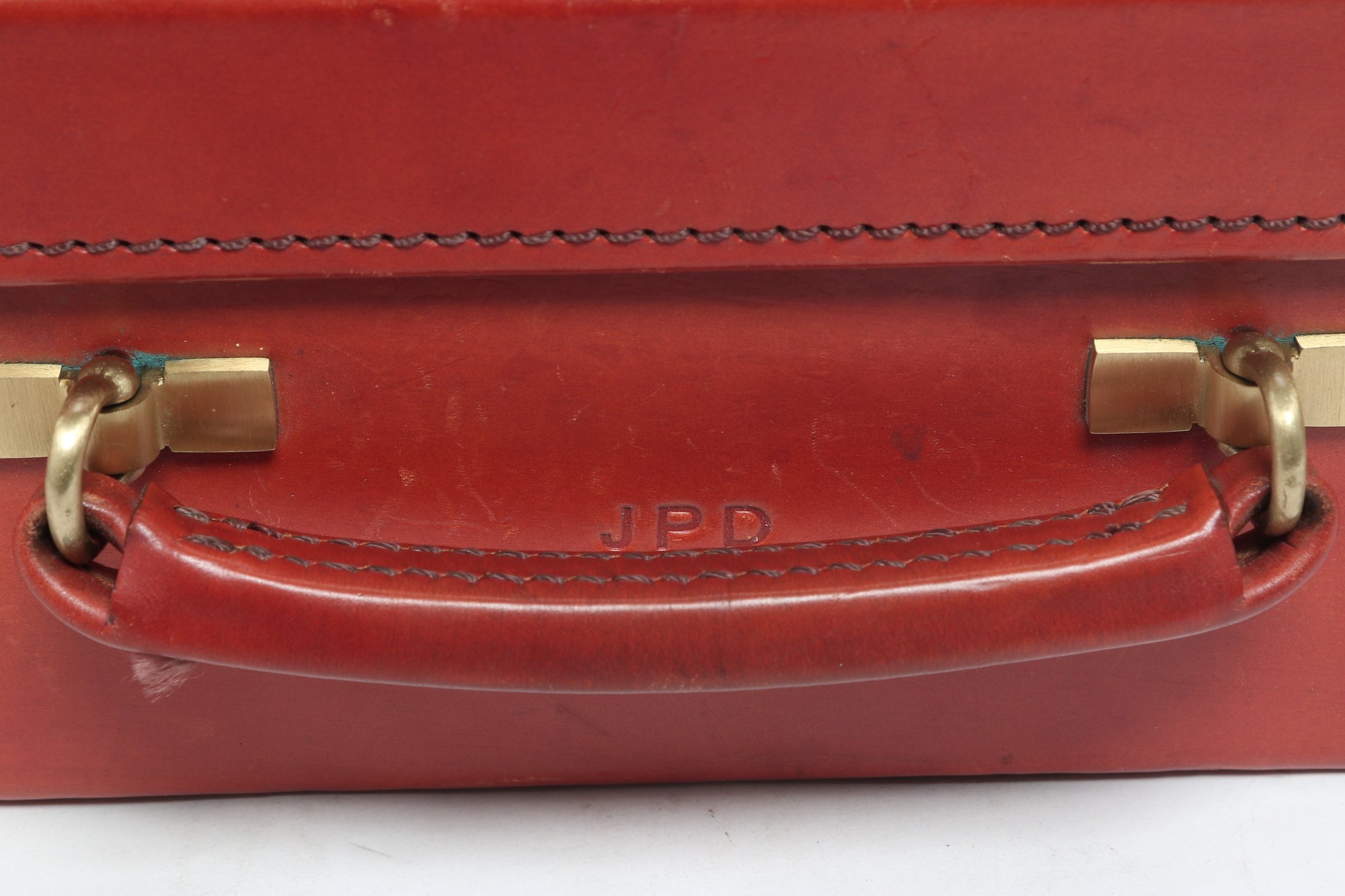 Quality Danes & Hathaway red leather attache briefcase featuring a structured form with brass-tone locking latches and fitted interior compartments for documents and essentials. Includes original key and matching leather care cream with cloth. Shows light wear consistent with use; well-crafted and presents nicely.