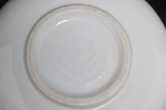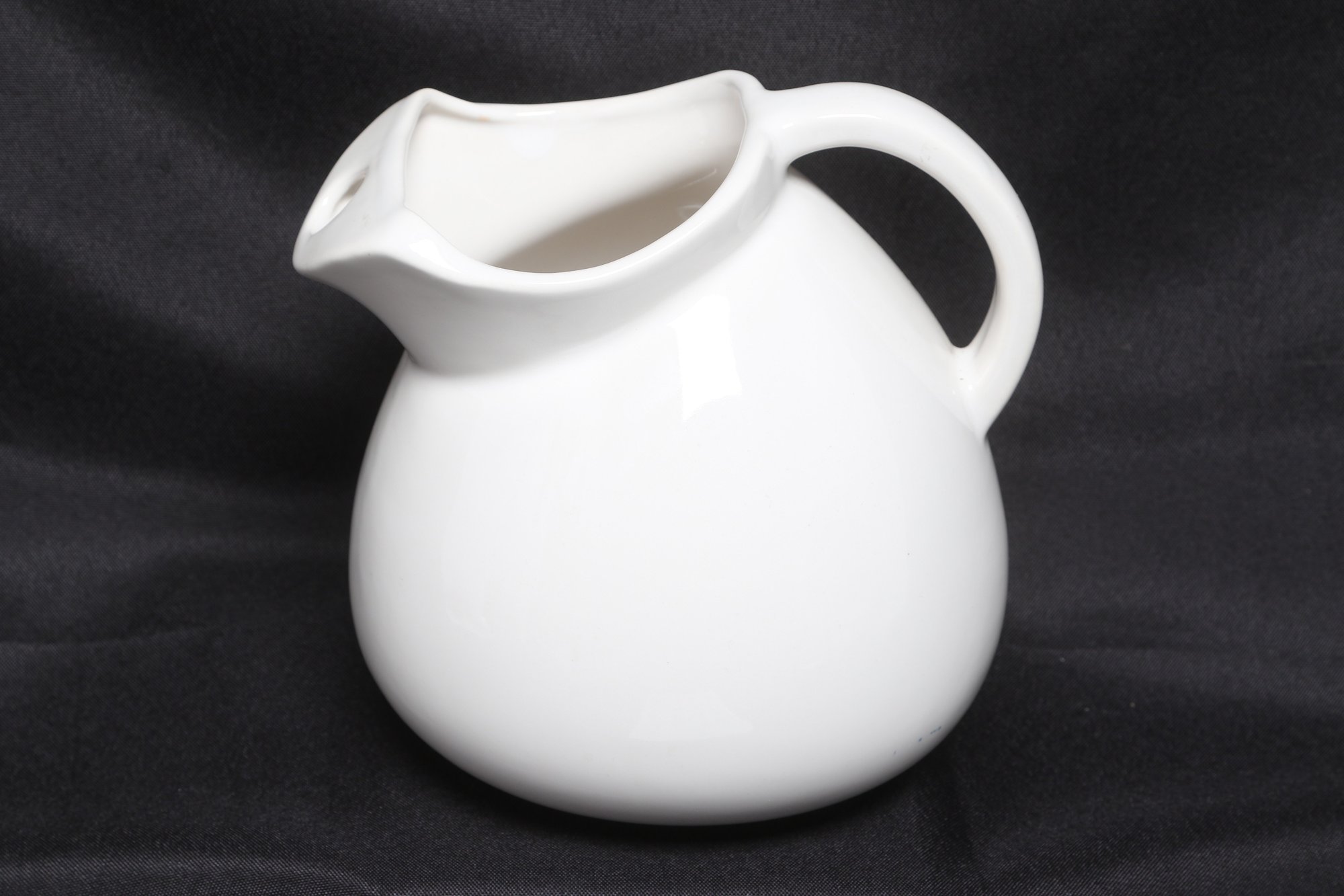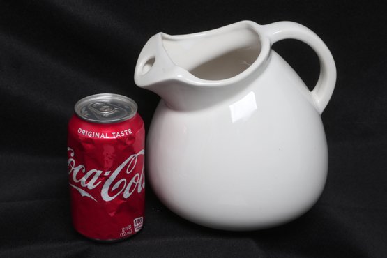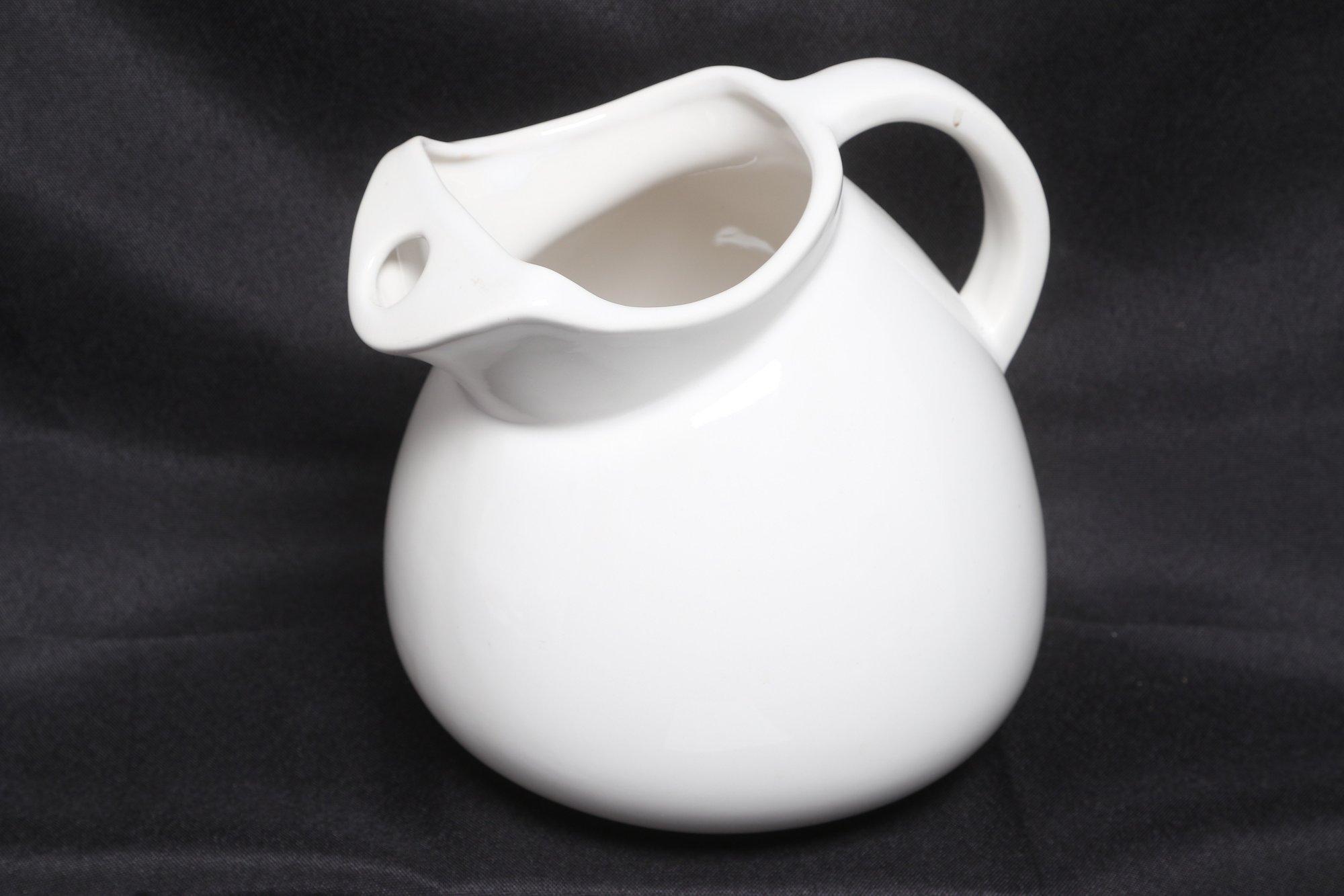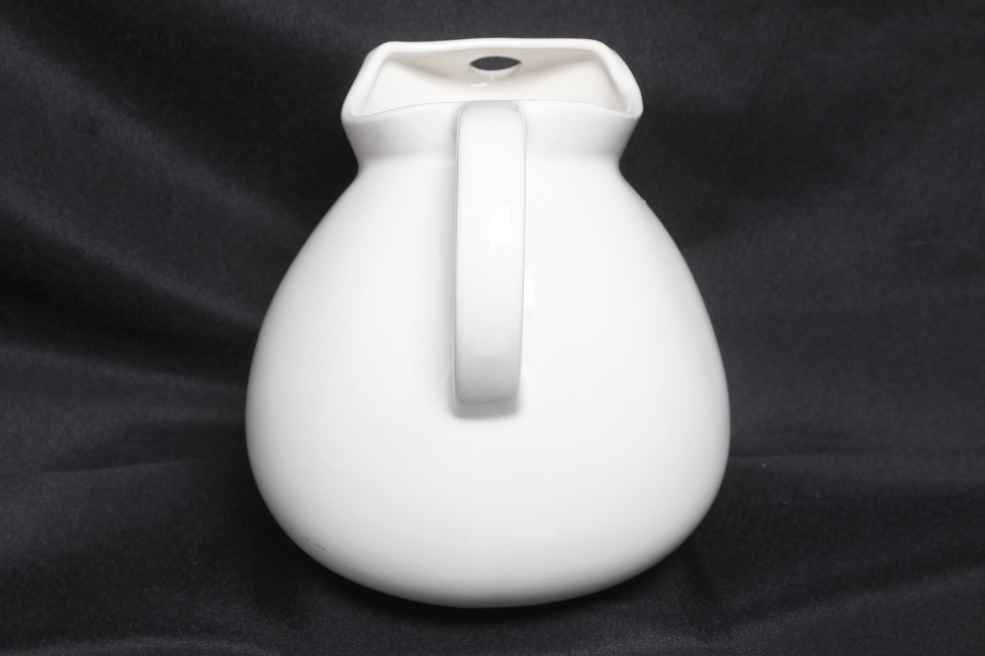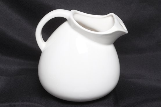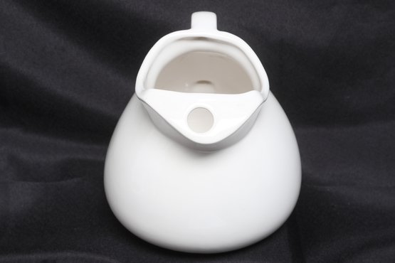 Clean, modern white ceramic pitcher by Dansk featuring a rounded form with curved handle and pouring spout. Versatile for use as a creamer or small serving pitcher, with a timeless minimalist aesthetic. In good condition with light wear and minor base marks consistent with use.