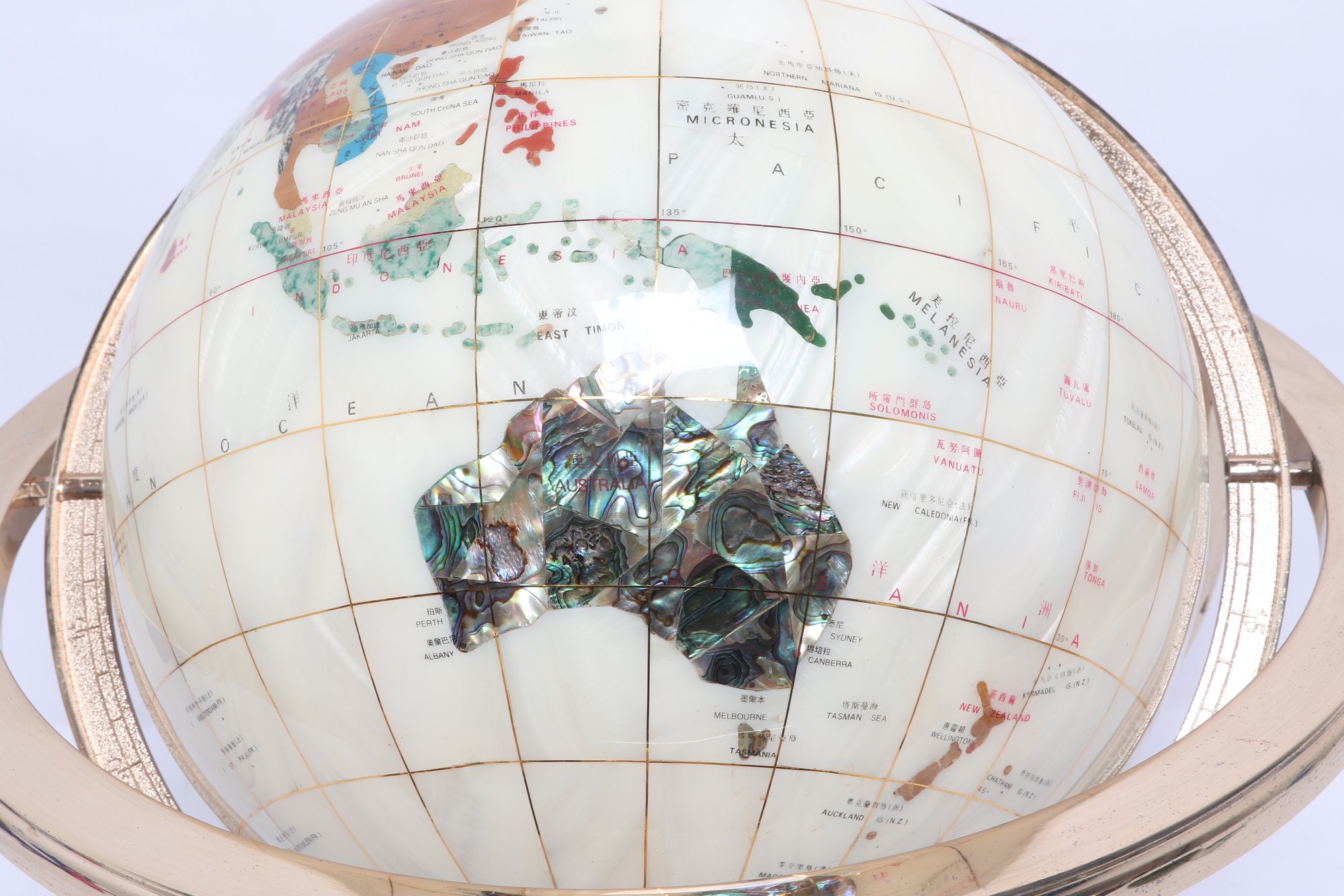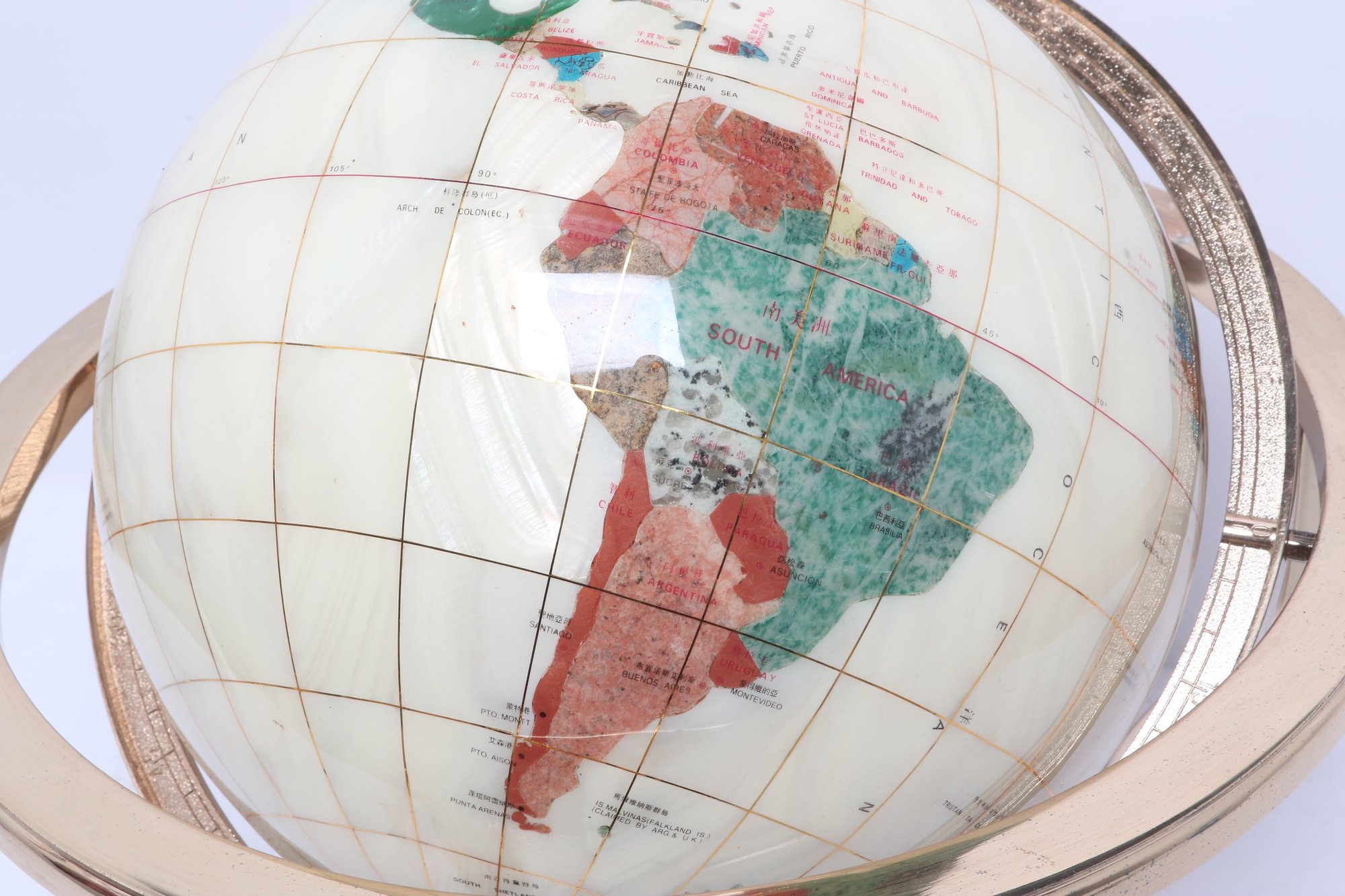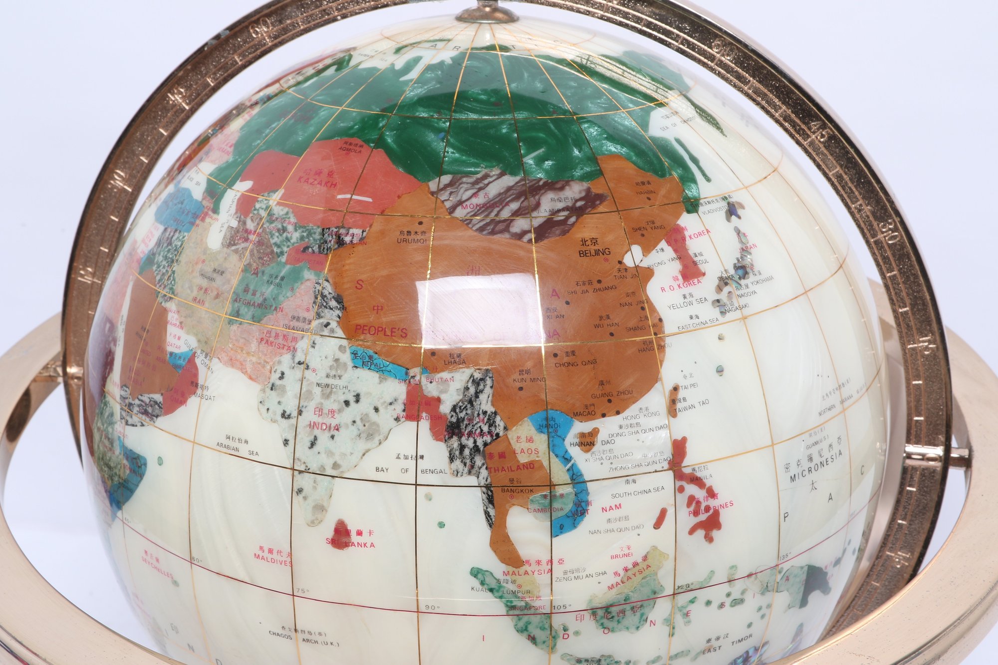 Decorative 12" world globe featuring inlaid gemstone-style continents set on a brass-tone stand with three legs and integrated compass detail. Nicely detailed piece with vintage appeal; shows some surface wear and finish loss to the metal base. Attractive display item for desk or shelf.