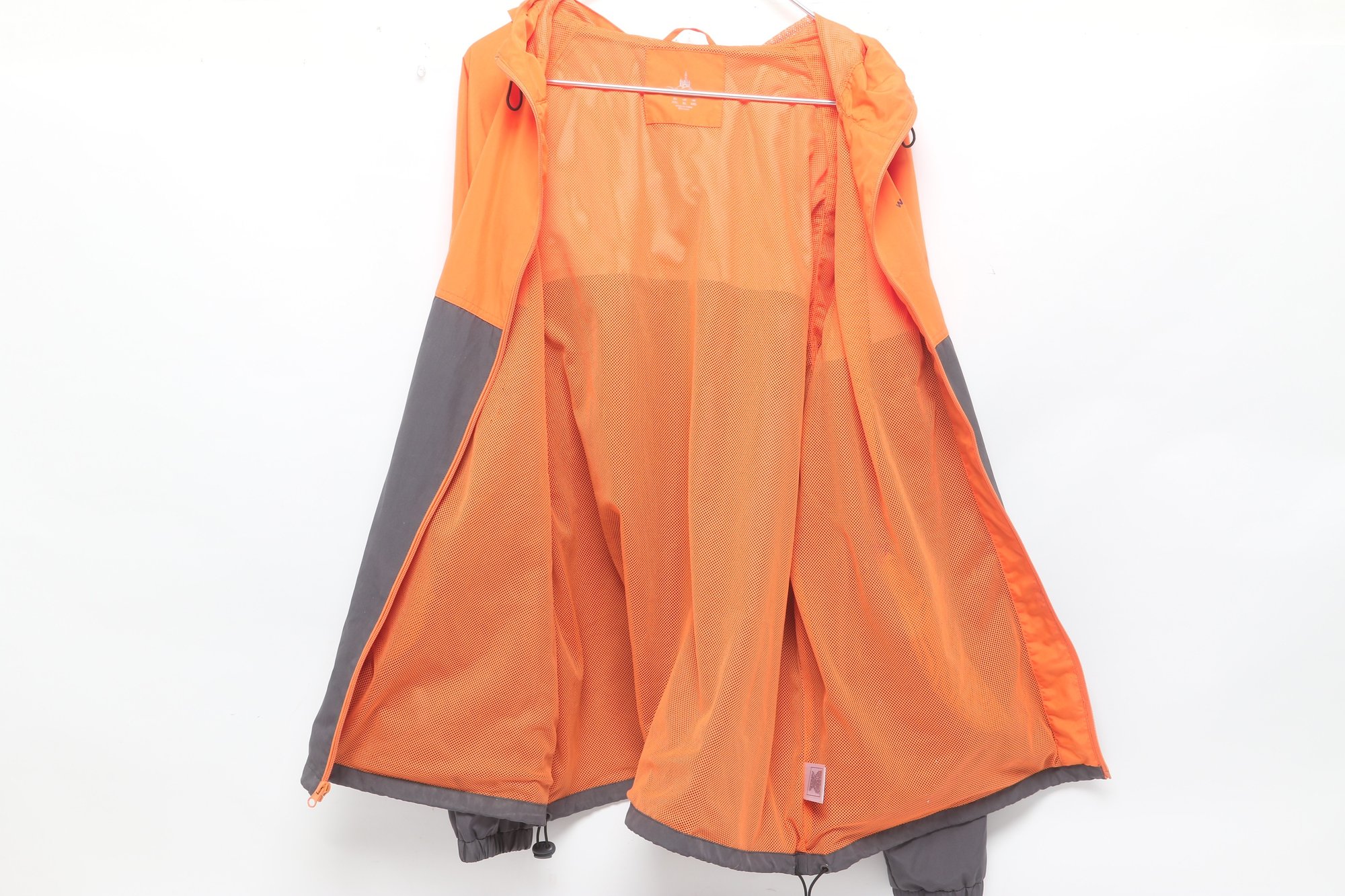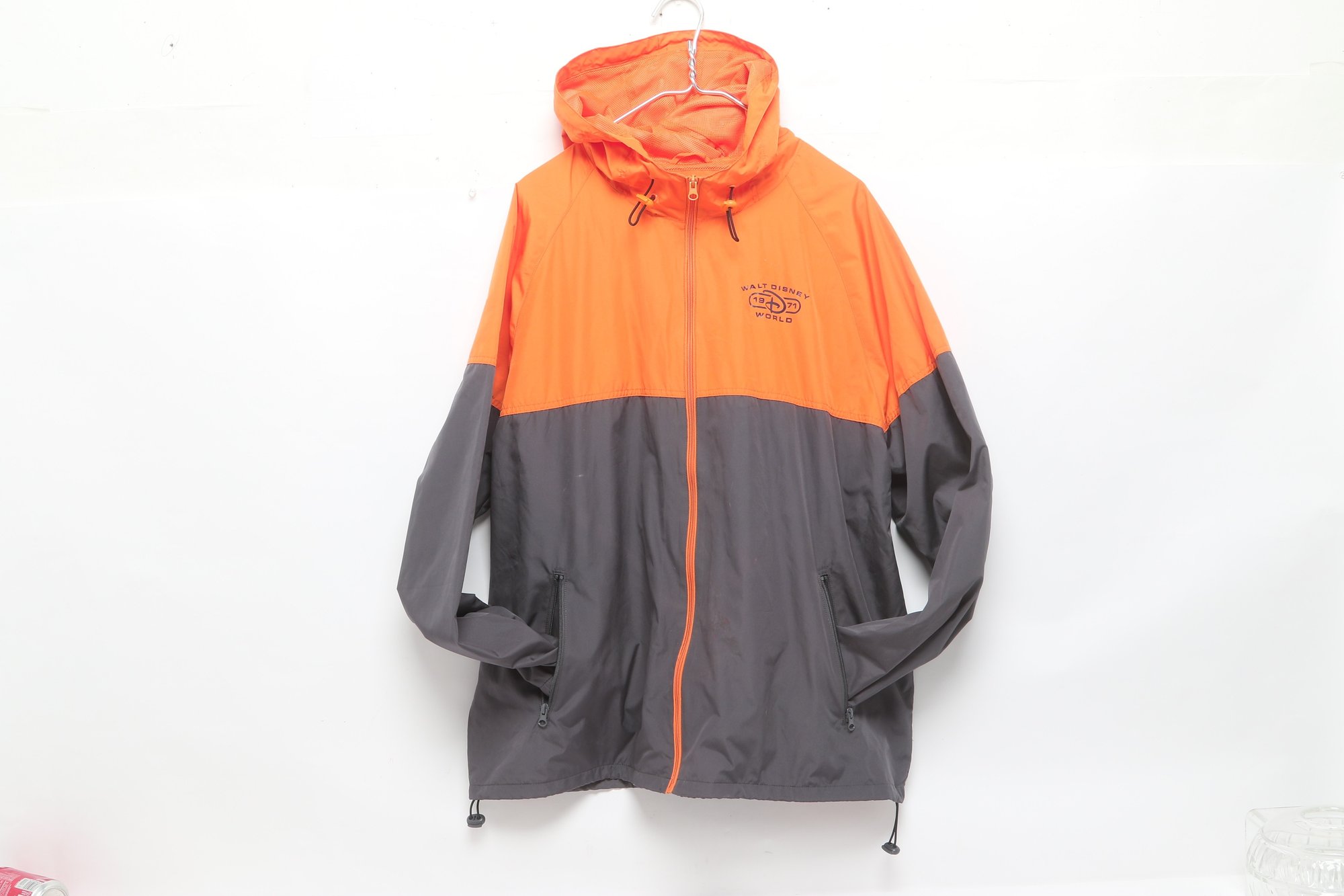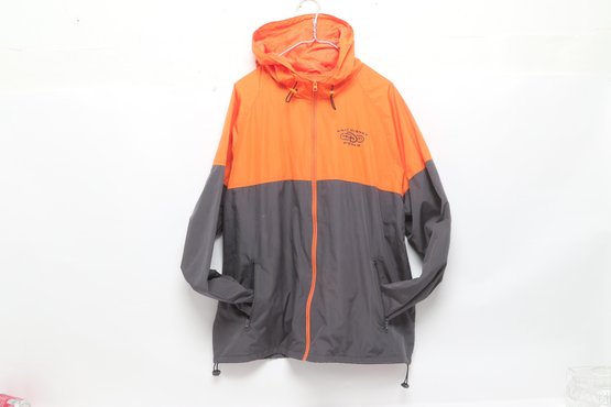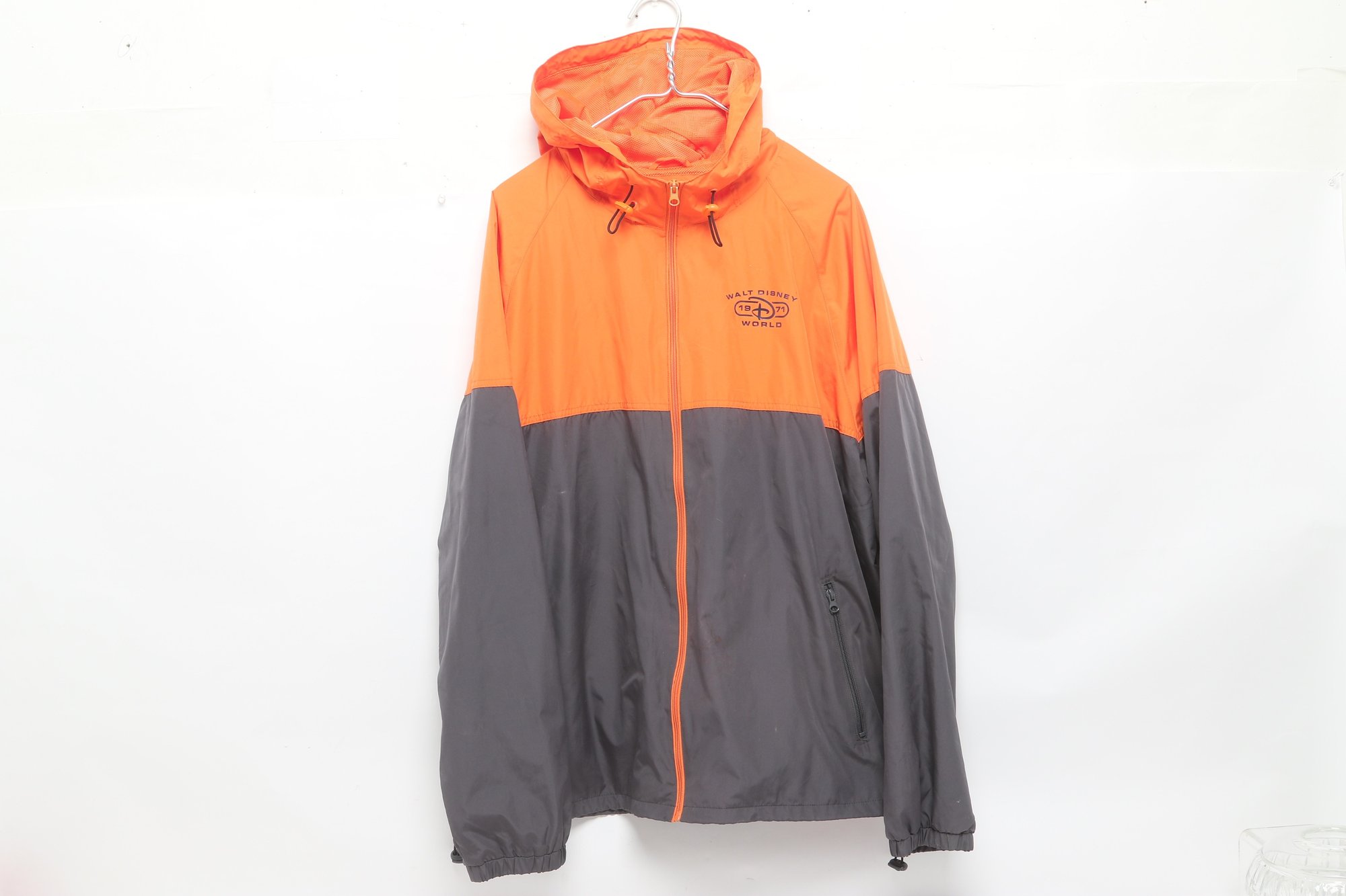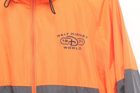 Disney Parks windbreaker jacket in bright orange and gray featuring Walt Disney World logo on front. Men’s size XL with lightweight construction, hood, and zip front. Pre-owned with light wear; overall good condition and ready for use.