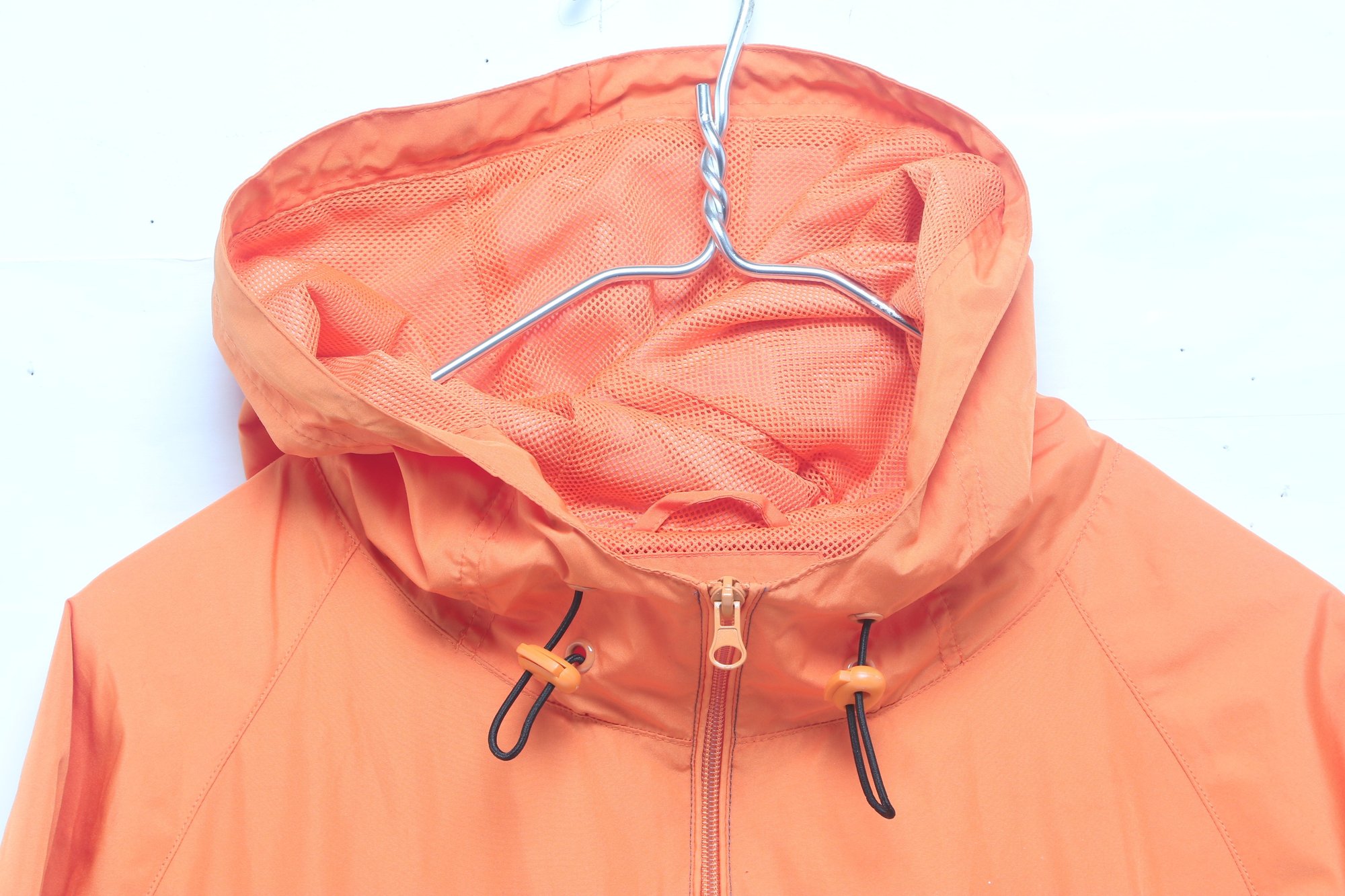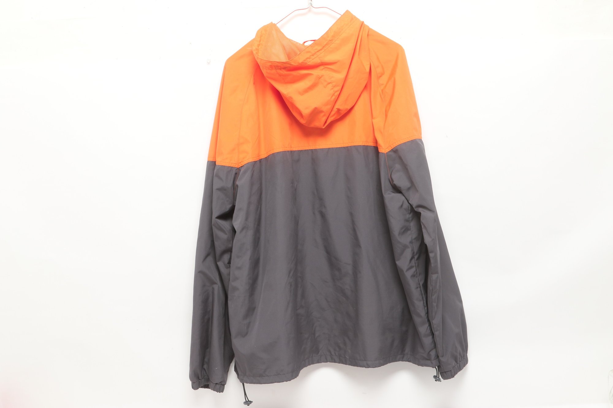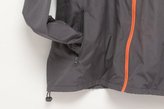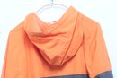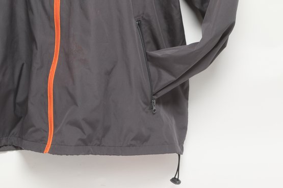 Disney Parks windbreaker jacket in bright orange and gray featuring Walt Disney World logo on front. Men’s size XL with lightweight construction, hood, and zip front. Pre-owned with light wear; overall good condition and ready for use.