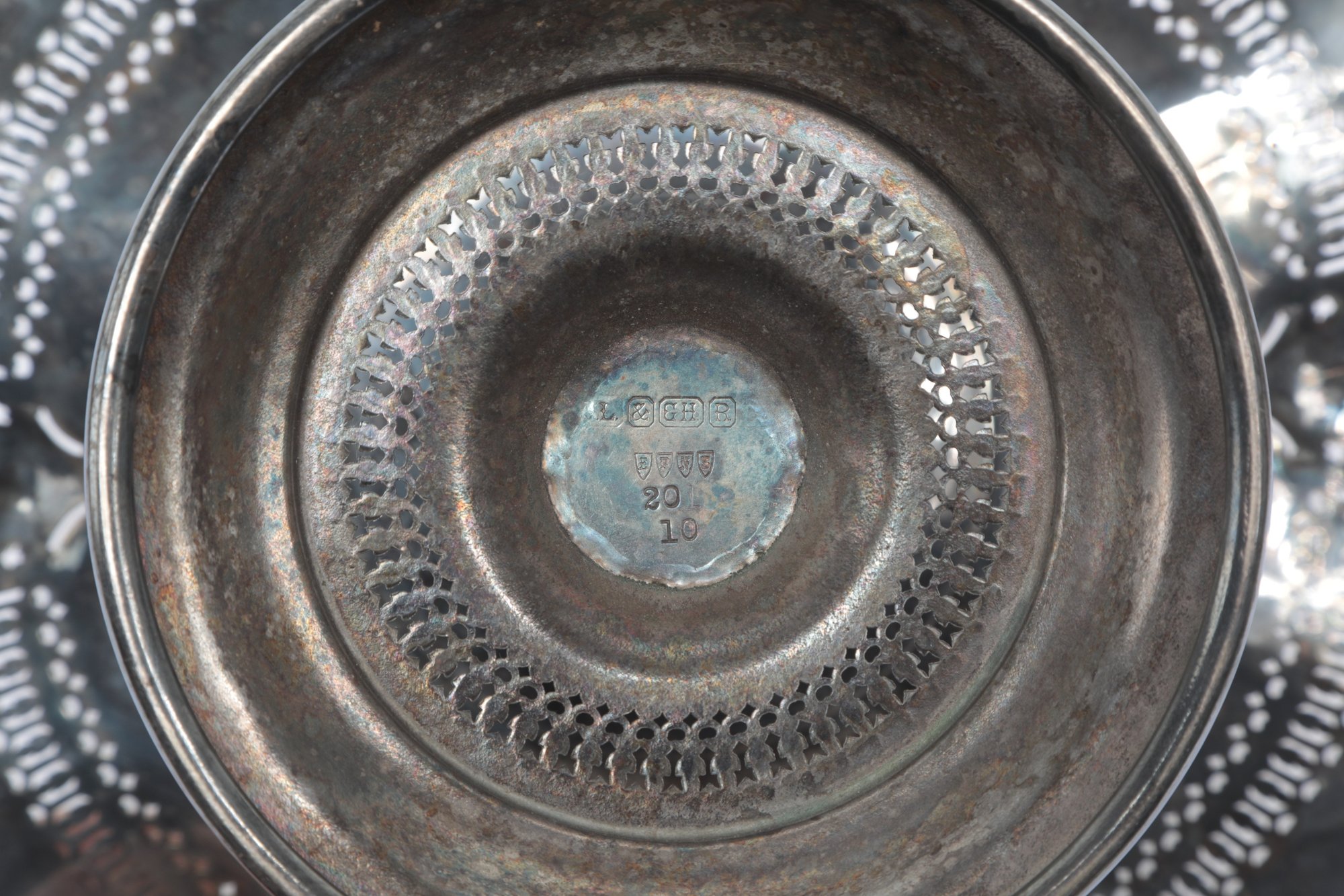 Elegant sterling silver tazza with a pierced and repoussé floral border, raised on a trumpet-form foot. Fully hallmarked on the underside for London, 1912, with maker’s mark “L.G.B.” and standard sterling and city marks. Approximately 5.75” tall and 10” in diameter. Tarnished with scattered oxidation, otherwise structurally sound. View all photos FOR CONDITION before bidding.