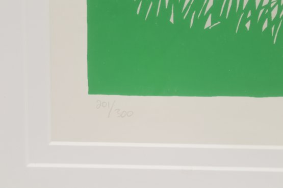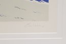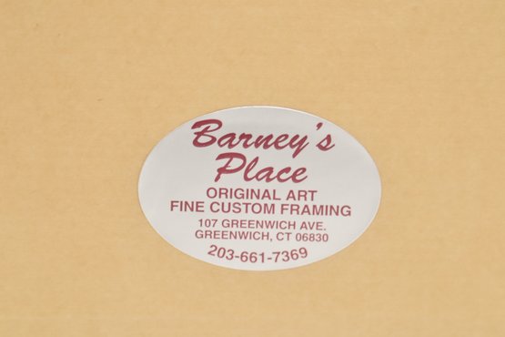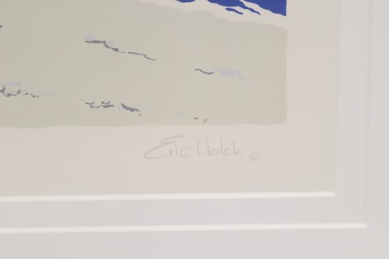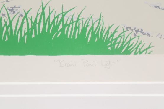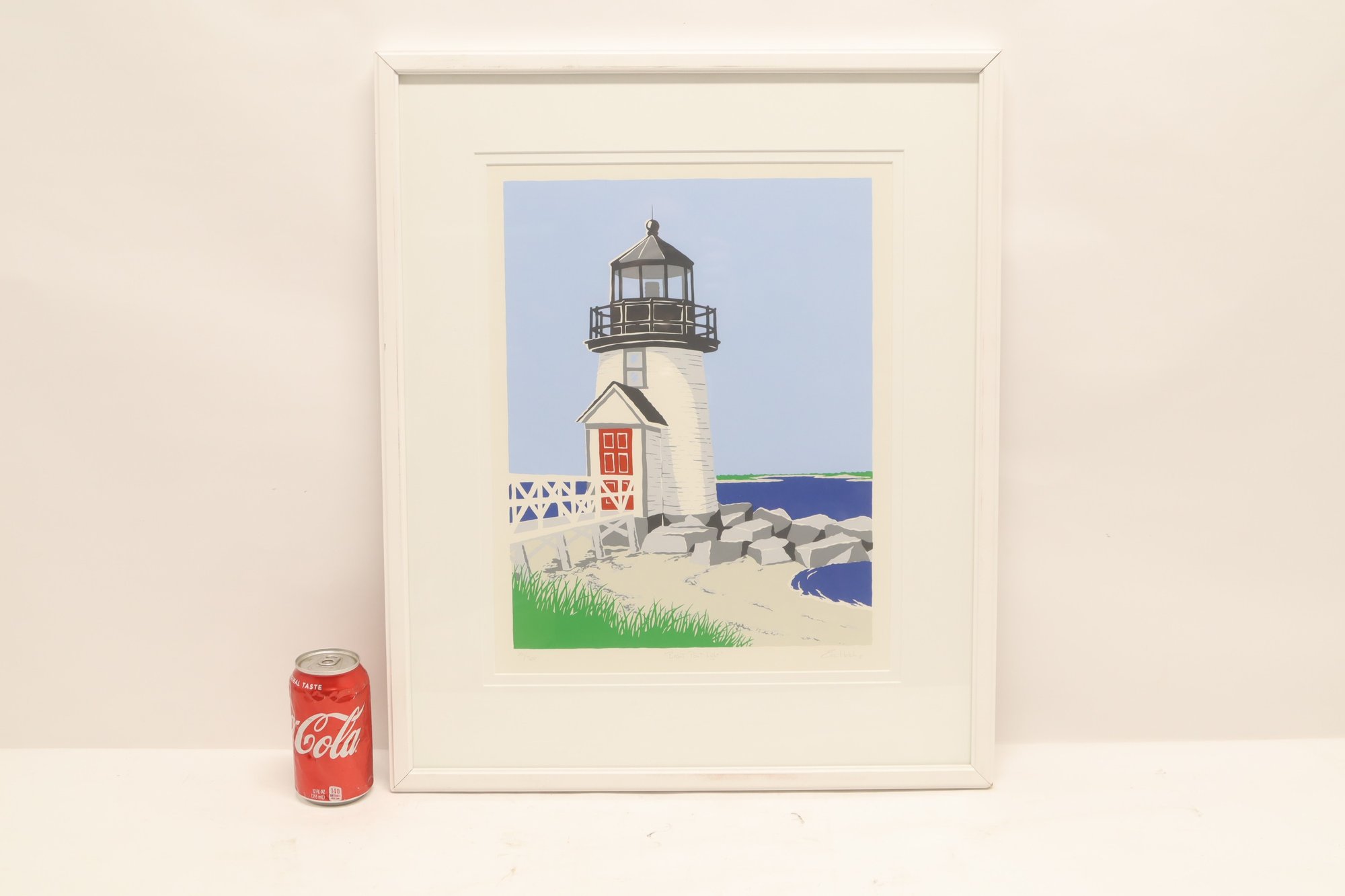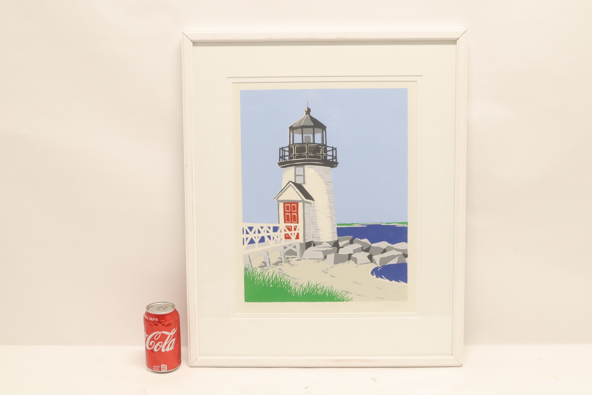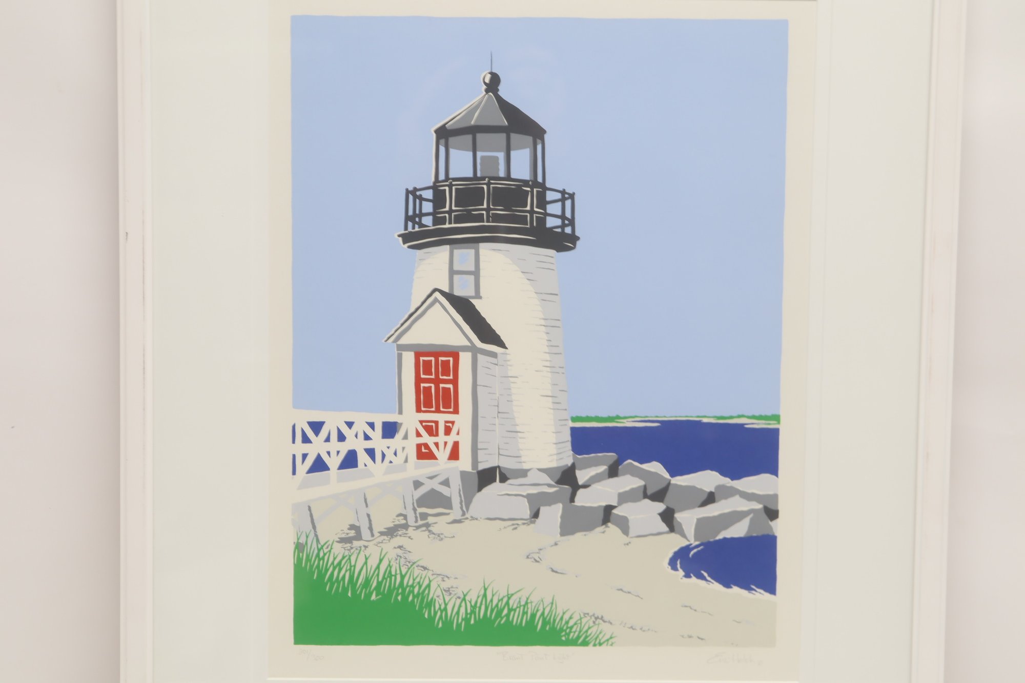 Colorful coastal scene print titled “Bass Point Light” by Eric Holch, depicting a lighthouse with red door along a rocky shoreline. Pencil signed by the artist and numbered (30/200) along the lower margin. Professionally matted and housed in a white frame, ready to display. Appears in very good condition with minimal wear.